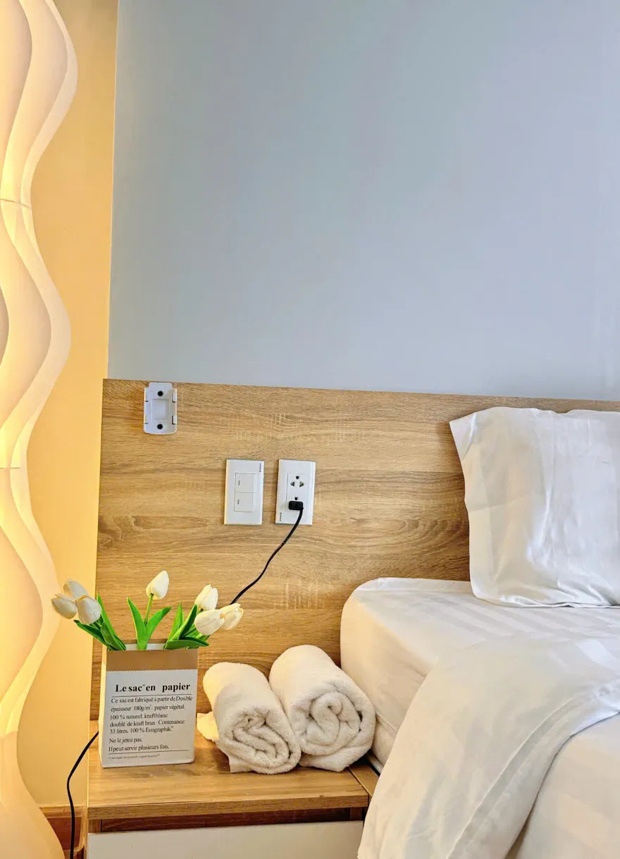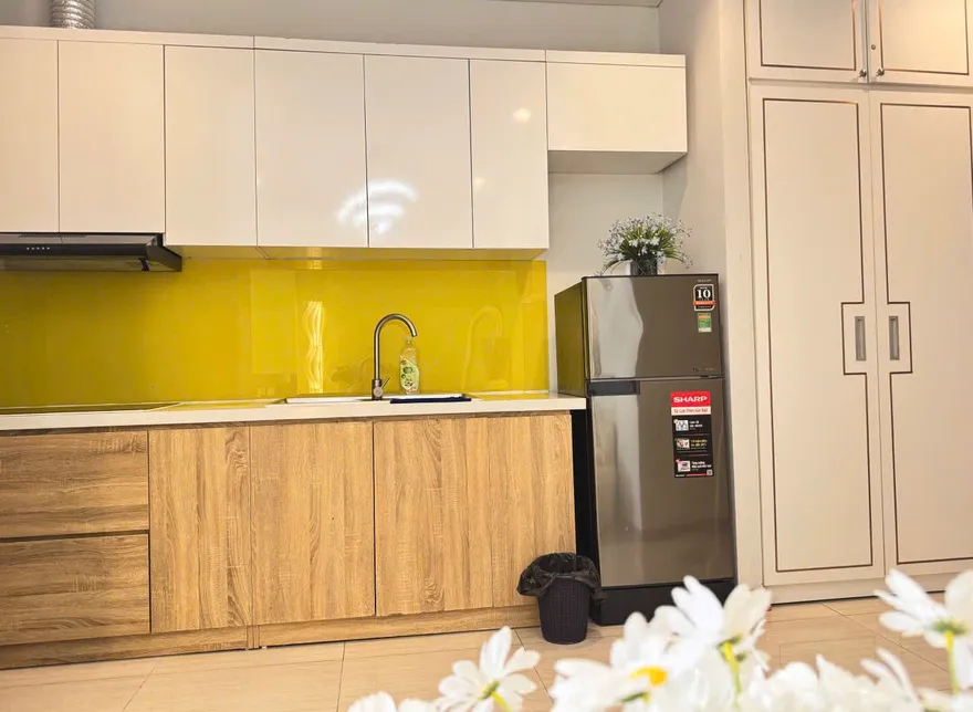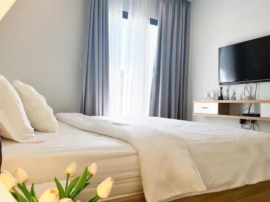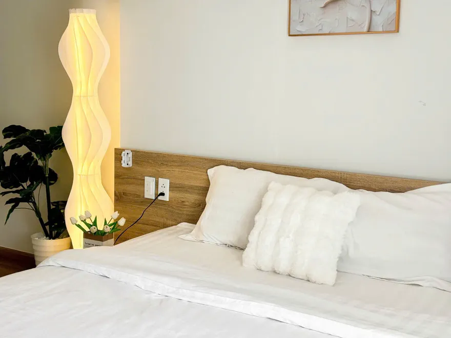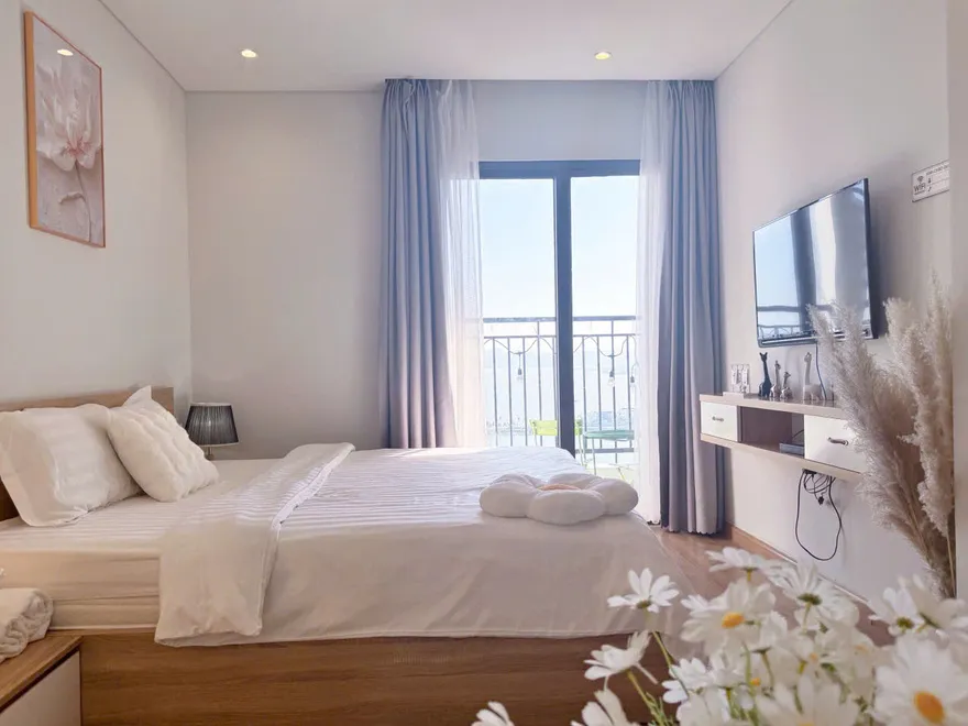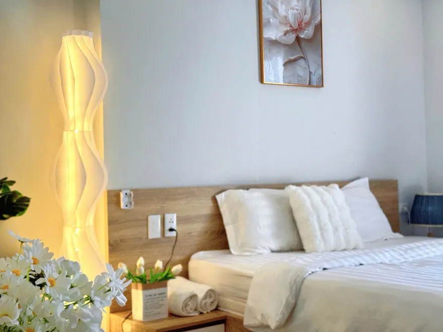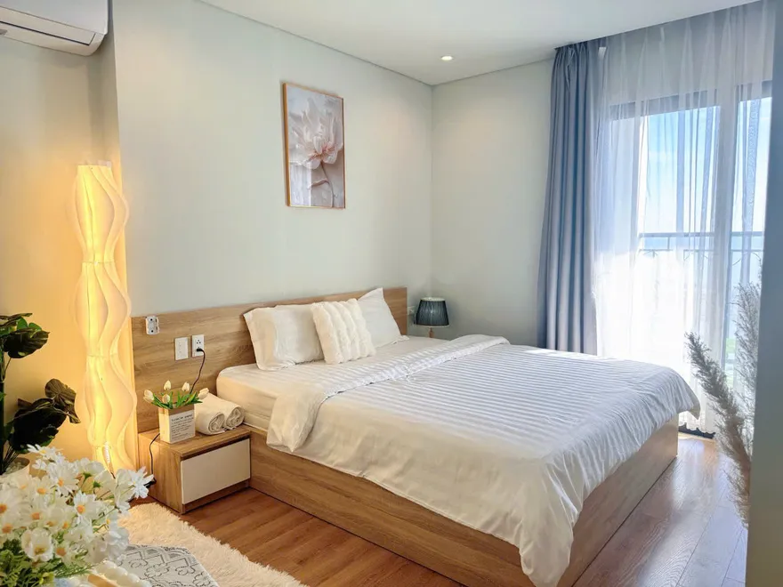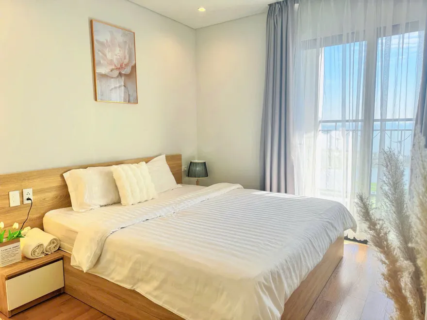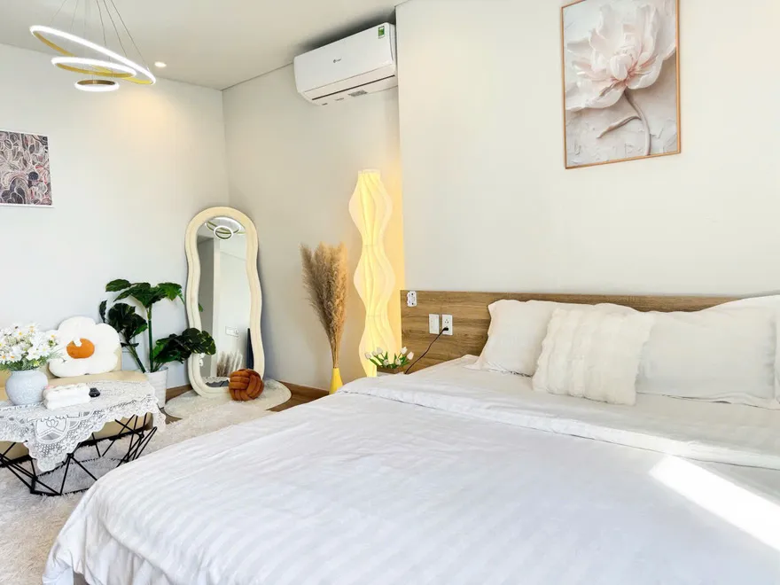 Đằng sau vẻ ngoài đậm chất nghệ thuật là sự tiện nghi chuẩn mực của một căn hộ cao cấp, đảm bảo trải nghiệm đi trốn nhưng vẫn đầy đủ như ở nhà. Mọi nhu cầu sinh hoạt đều được đáp ứng trọn vẹn với tủ lạnh Inverter hiện đại và khu vực bếp ốp kính vàng chanh bắt mắt, mang lại năng lượng tích cực cho những bữa ăn nhẹ tự chế biến. Trung tâm của sự thư giãn chính là chiếc giường King-size với bộ chăn ga cao cấp, hứa hẹn mang đến những giấc ngủ sâu và êm ái, nơi bạn có thể thức dậy giữa khung cảnh nắng chan hòa và biển xanh ngay trong tầm mắt.