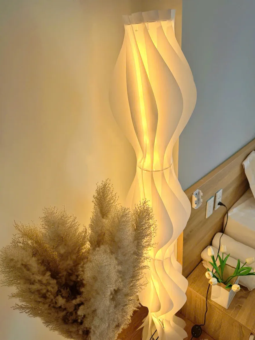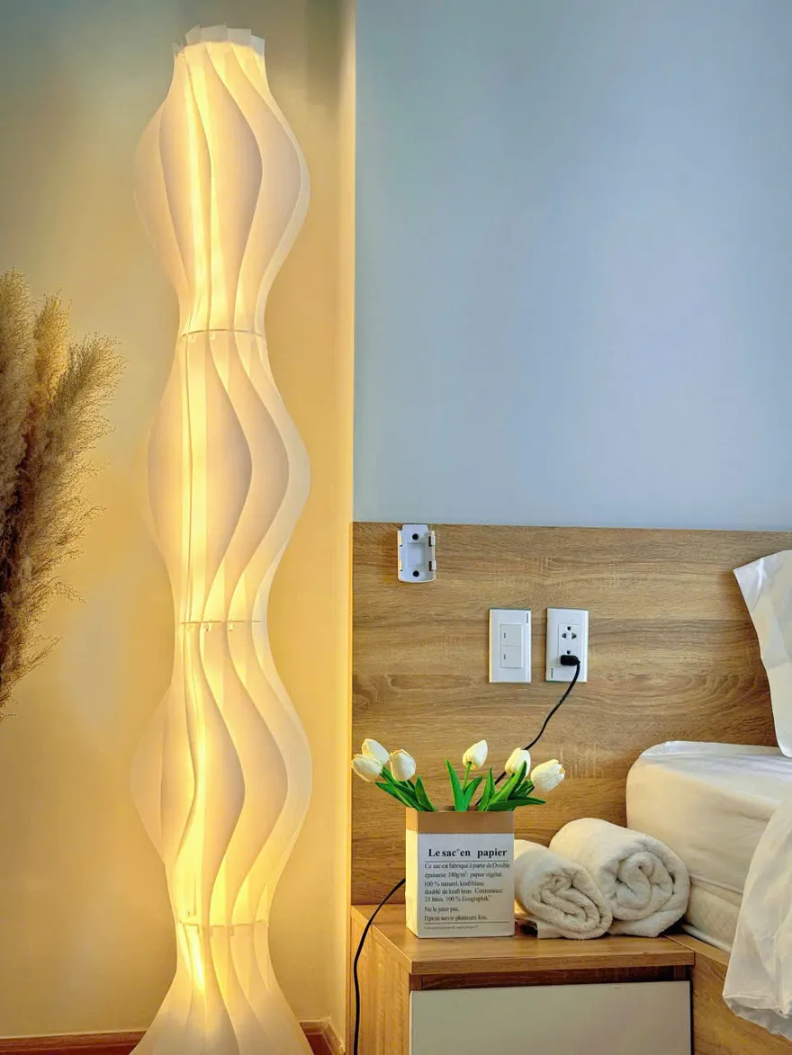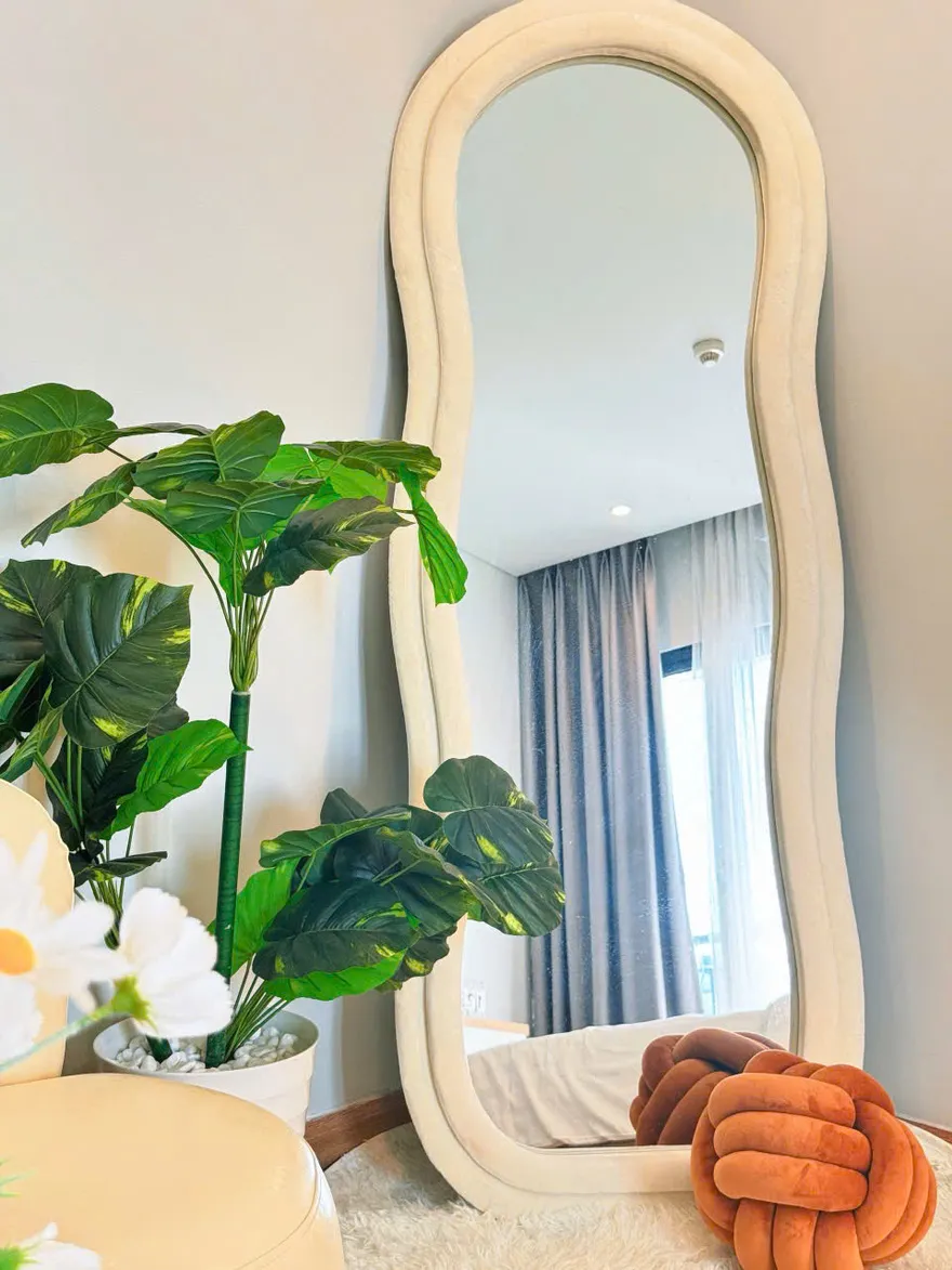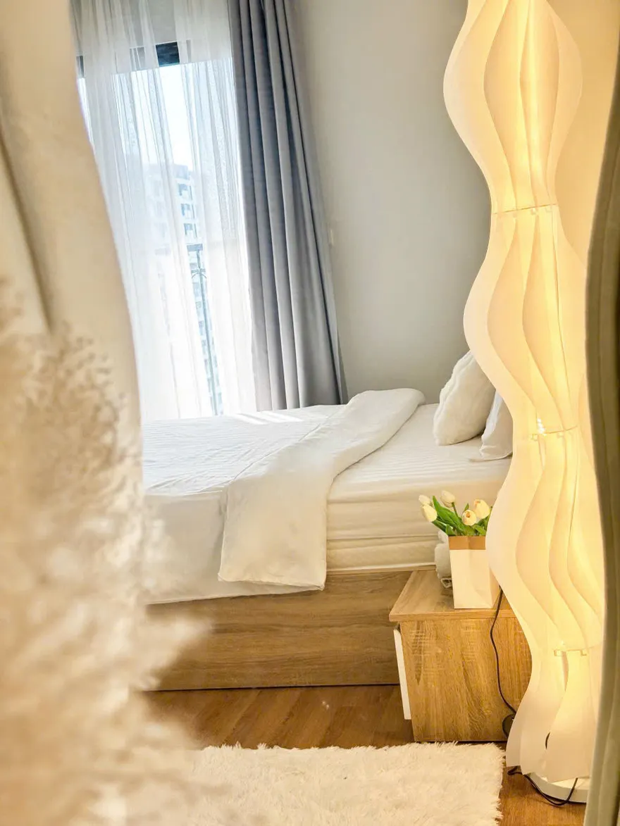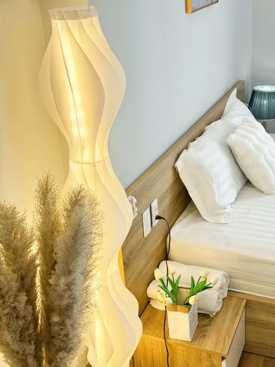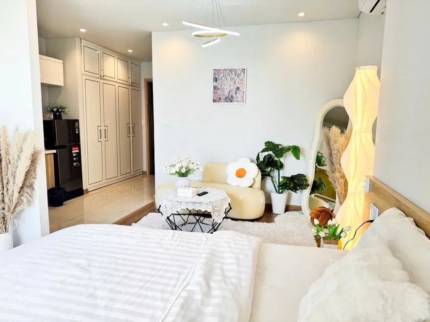 Điểm chạm cảm xúc mạnh mẽ nhất của căn hộ nằm ở hệ thống ánh sáng nghệ thuật được sắp đặt đầy ý đồ. Sự xuất hiện của chiếc đèn sàn với thiết kế dạng sóng uốn lượn mềm mại tỏa ra luồng sáng vàng dịu nhẹ, biến mỗi góc phòng thành một không gian lãng mạn đúng nghĩa. Đối lập với nét mềm mại đó là hệ đèn trần LED Circle hiện đại, mang hơi thở của tương lai vào trung tâm căn phòng. Đặc biệt, chủ nhân đã rất thấu hiểu tâm lý khách hàng khi bố trí góc sống ảo với chiếc gương lượn sóng Wavy Mirror và bộ sofa đám mây bo tròn cực kỳ trendy – nơi bạn chỉ cần đứng vào là có ngay những bức ảnh check-in chuẩn gu mà không cần phải đi đâu xa.