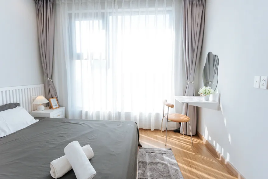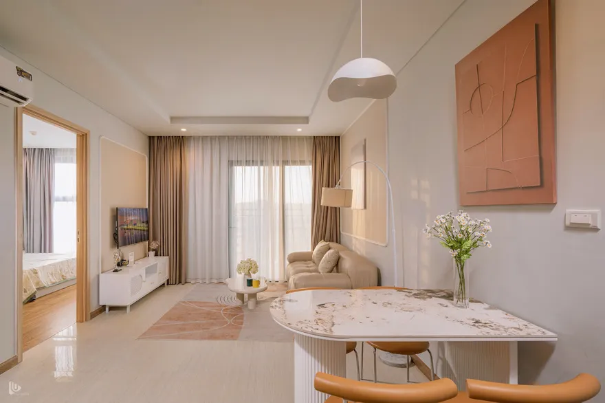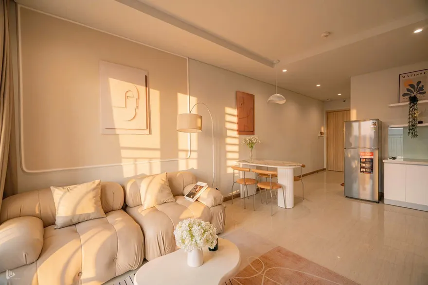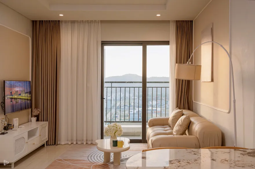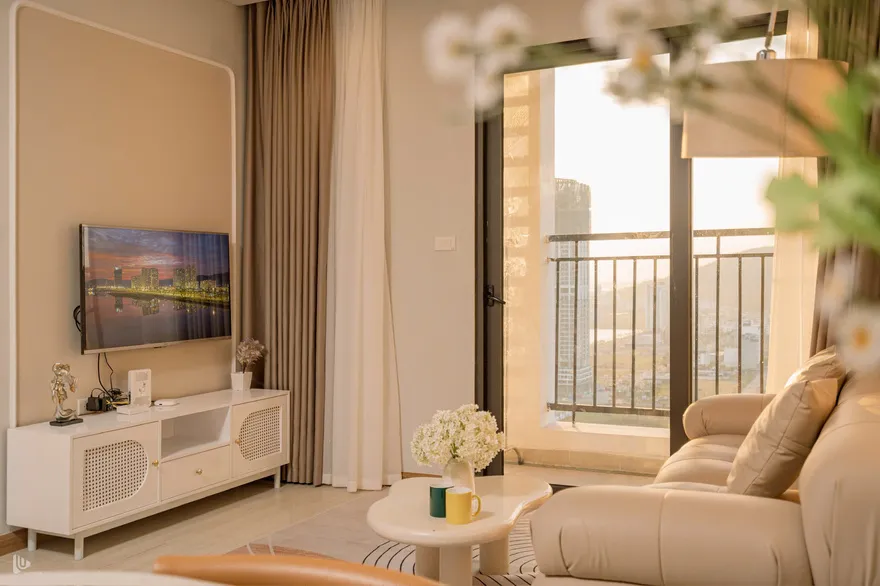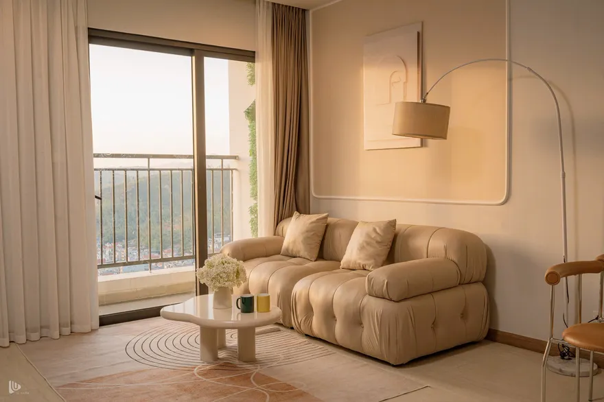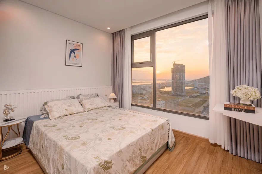 Vì căn hộ view chính biển hướng Tây Nam, thời điểm đẹp nhất là từ 16:30 đến 17:30. Lúc này, ánh sáng hoàng hôn sẽ tràn vào phòng ngủ Master và phòng khách qua lớp rèm voan, tạo hiệu ứng đổ bóng cực nghệ trên bộ Sofa Tofu. Đây là khoảnh khắc bạn không nên bỏ lỡ để có những bức ảnh "triệu view".