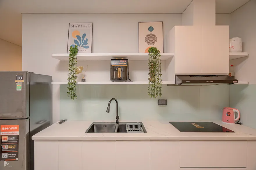 Căn hộ được trang bị đầy đủ dụng cụ nấu nướng tiêu chuẩn gia đình: bếp từ đôi, nồi cơm điện, bộ xoong nồi, chảo chống dính, bát đũa và nồi chiên không dầu. Chúng tôi cũng chuẩn bị sẵn một số gia vị cơ bản (dầu ăn, muối, đường). Bạn chỉ cần ghé chợ đêm hoặc Lotte Mart cách đó vài phút di chuyển để mua hải sản tươi sống.