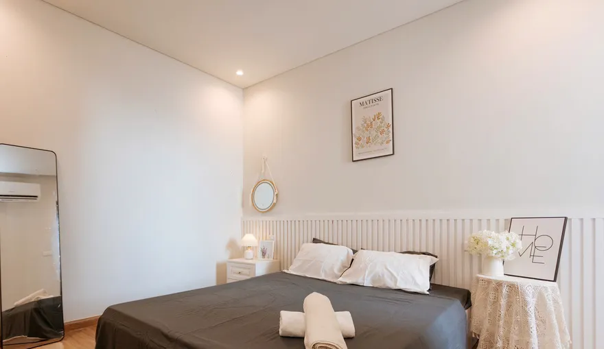 Tương xứng với vẻ đẹp hùng vĩ bên ngoài, không gian nội thất bên trong là sự giao thoa nhuần nhuyễn giữa phong cách Minimalist tối giản và nét Scandinavian nhẹ nhàng. Sự kết hợp tinh tế giữa tông màu kem chủ đạo và chất liệu gỗ sáng màu không chỉ tạo nên sự thanh lịch mà còn giúp căn nhà luôn tràn ngập cảm giác tươi mới, rộng rãi. Trái tim của căn hộ là phòng khách thiết kế mở kết nối liền mạch với ban công lộng gió, điểm xuyết bộ sofa “béo” (Tofu sofa) với những đường bo tròn mềm mại tạo cảm giác ấm cúng. Từng chi tiết từ đèn sàn cung vòm đến các bức tranh Matisse nghệ thuật đều được chọn lọc kỹ lưỡng, loại bỏ sự rườm rà để nhường chỗ cho sự lưu thông của ánh sáng tự nhiên.