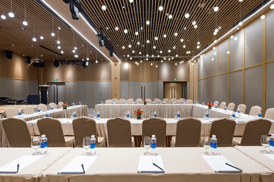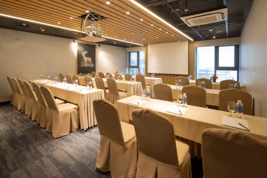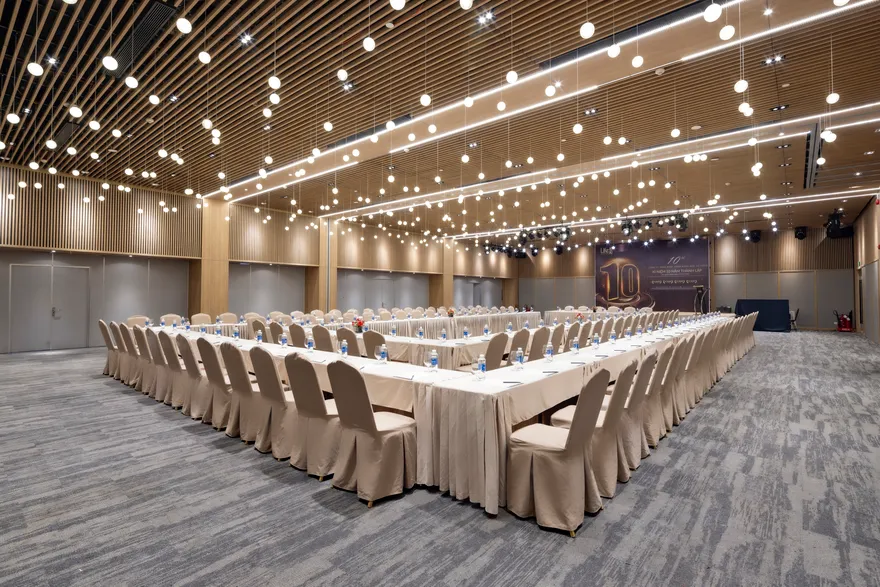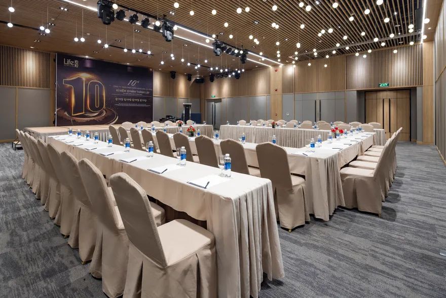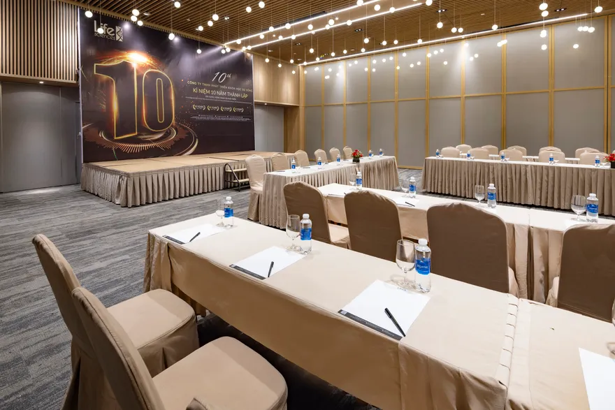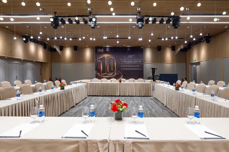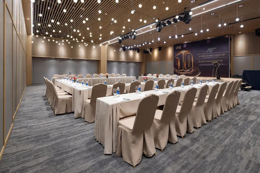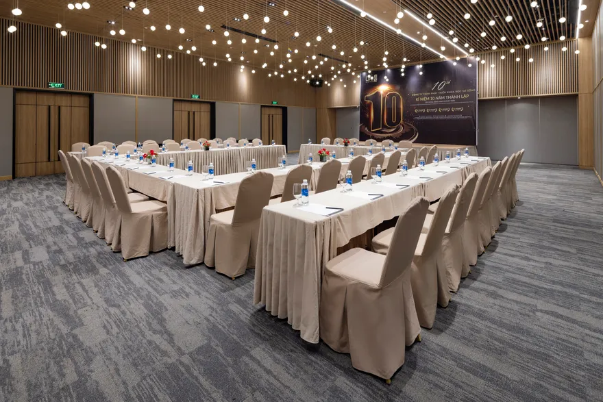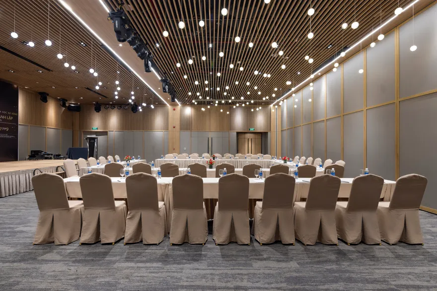 Hệ thống phòng hội nghị được đầu tư thiết bị nghe nhìn tiên tiến, màn hình LED và hệ thống âm thanh tiêu chuẩn cho hội thảo quốc tế.
