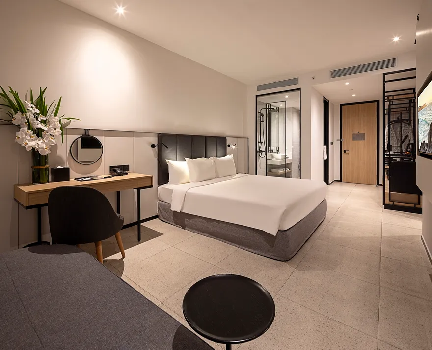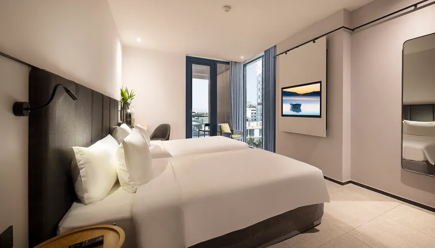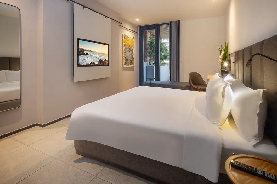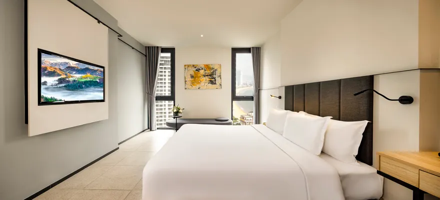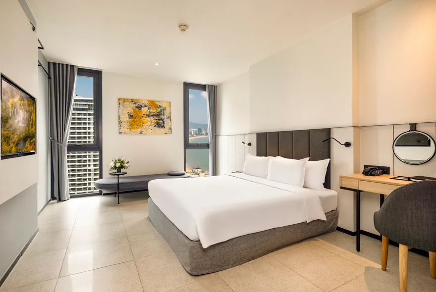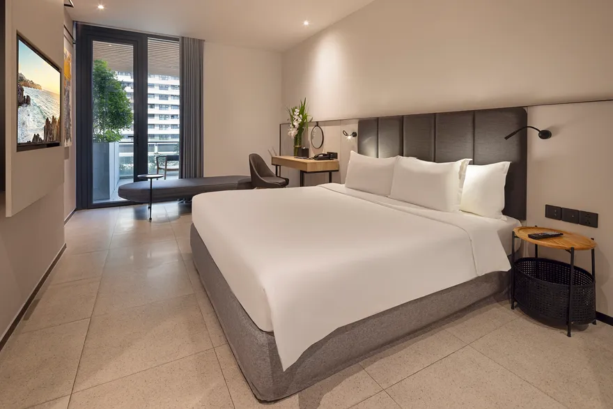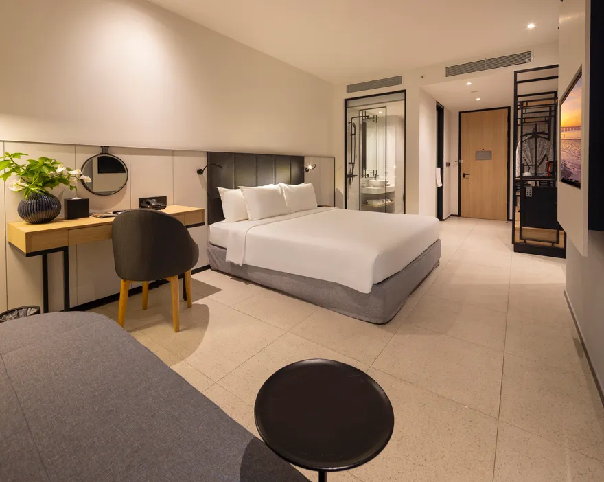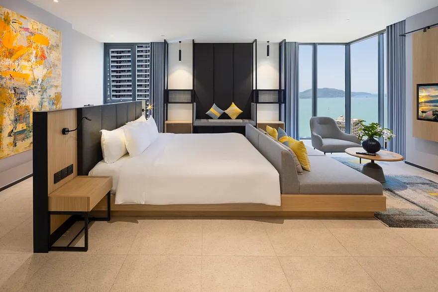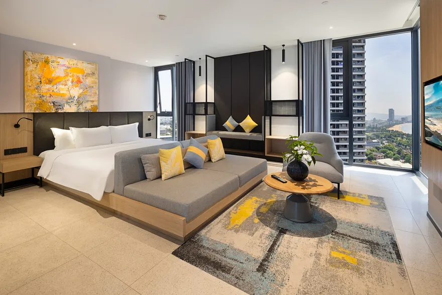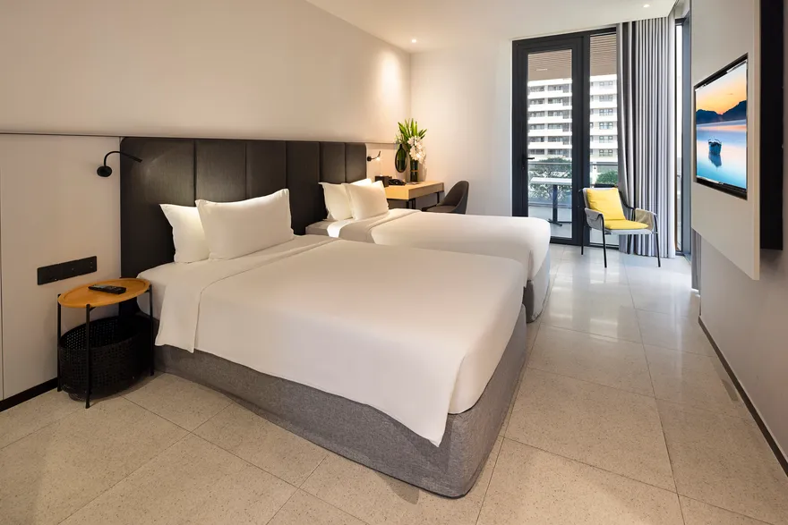 Kiến trúc của tòa nhà 21 tầng này mang đậm dấu ấn đương đại với những gam màu nhạt như trắng xám và vàng ấm. Cách bài trí này không hề ngẫu nhiên mà nhắm thẳng vào cảm giác thư thái của du khách. Bước vào phòng, sự mềm mại của nội thất và ánh sáng vàng dịu nhẹ sẽ giúp tâm trí bạn lắng xuống ngay lập tức. Với 229 phòng nghỉ được phân cấp rõ ràng, khách sạn đáp ứng trọn vẹn mọi nhu cầu lưu trú. Từ những căn phòng Deluxe tinh tế cho khách công tác, đến hạng phòng Deluxe Pool Terrace độc đáo với ban công hướng thẳng ra hồ bơi tầng 3 đầy cây xanh, hay Executive Suite sang trọng dành cho những ai muốn thức dậy với tầm nhìn đại dương bao la, tất cả đều chú trọng vào chất lượng giấc ngủ và sự tiện nghi tối đa.