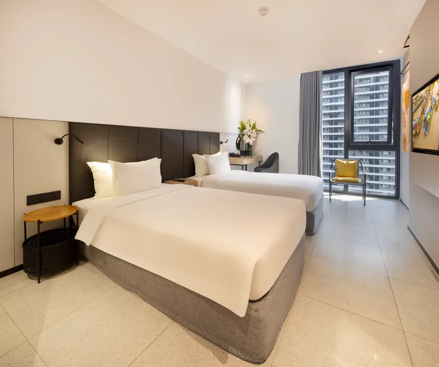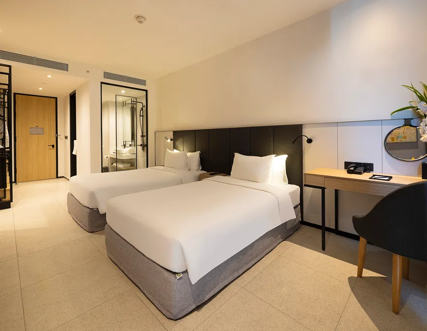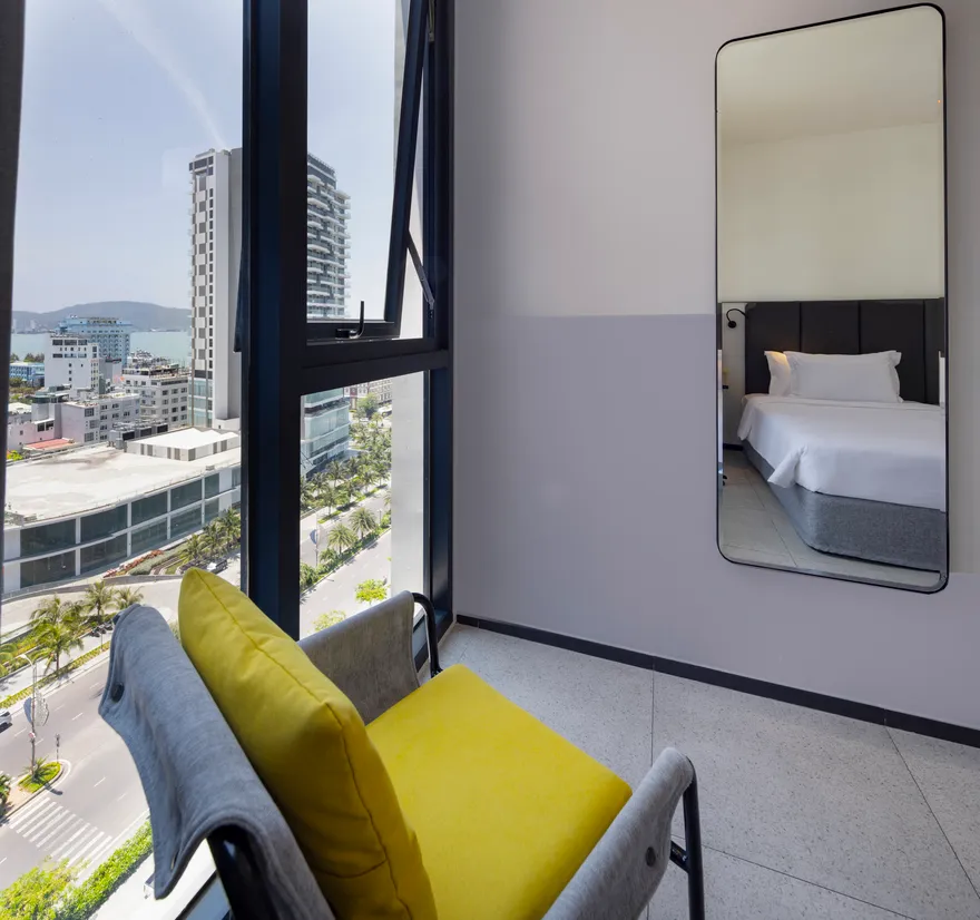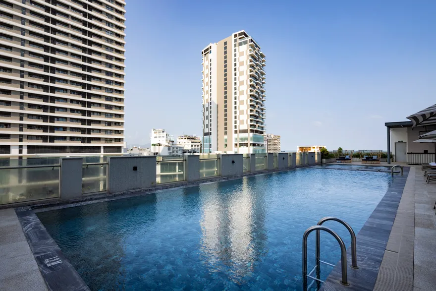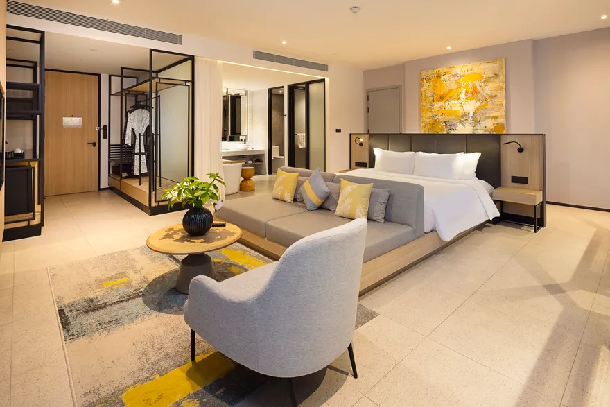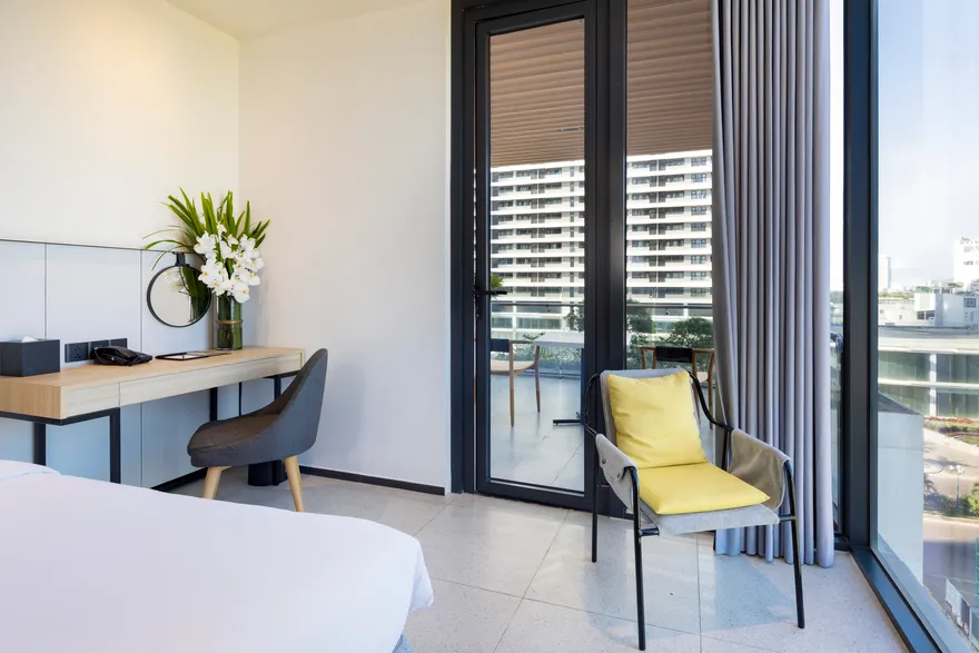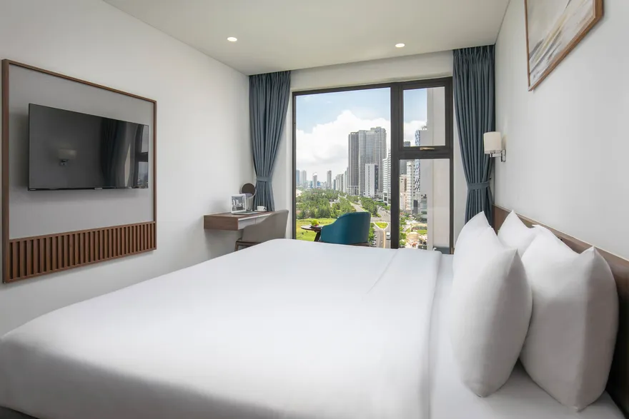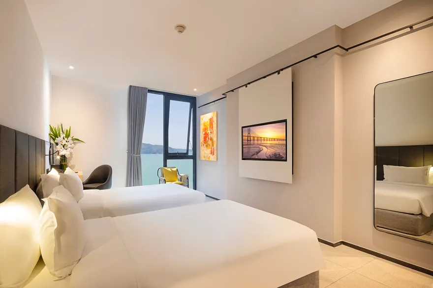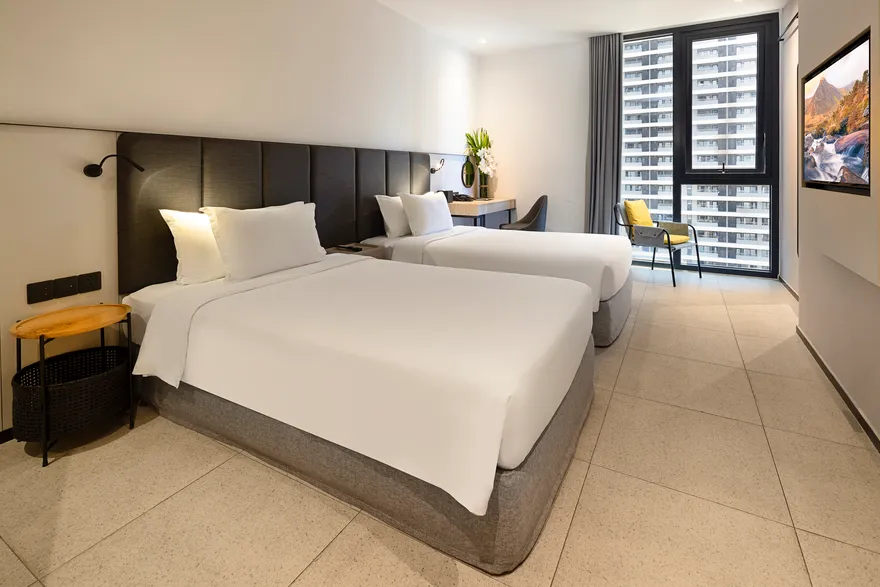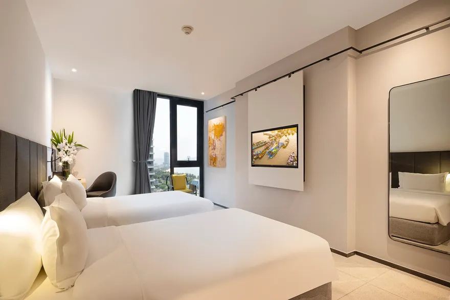 Kiến trúc của tòa nhà 21 tầng này mang đậm dấu ấn đương đại với những gam màu nhạt như trắng xám và vàng ấm. Cách bài trí này không hề ngẫu nhiên mà nhắm thẳng vào cảm giác thư thái của du khách. Bước vào phòng, sự mềm mại của nội thất và ánh sáng vàng dịu nhẹ sẽ giúp tâm trí bạn lắng xuống ngay lập tức. Với 229 phòng nghỉ được phân cấp rõ ràng, khách sạn đáp ứng trọn vẹn mọi nhu cầu lưu trú. Từ những căn phòng Deluxe tinh tế cho khách công tác, đến hạng phòng Deluxe Pool Terrace độc đáo với ban công hướng thẳng ra hồ bơi tầng 3 đầy cây xanh, hay Executive Suite sang trọng dành cho những ai muốn thức dậy với tầm nhìn đại dương bao la, tất cả đều chú trọng vào chất lượng giấc ngủ và sự tiện nghi tối đa.