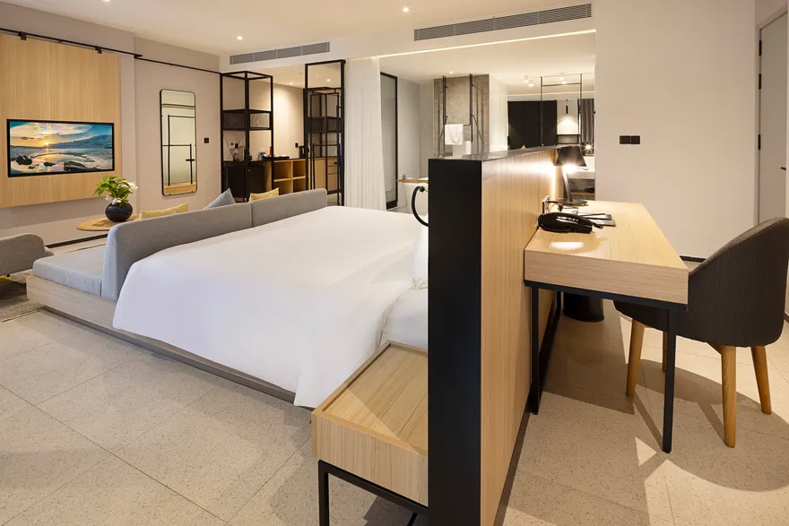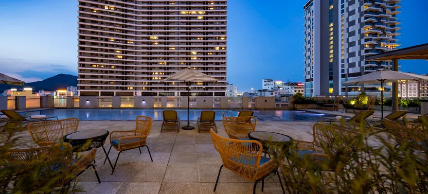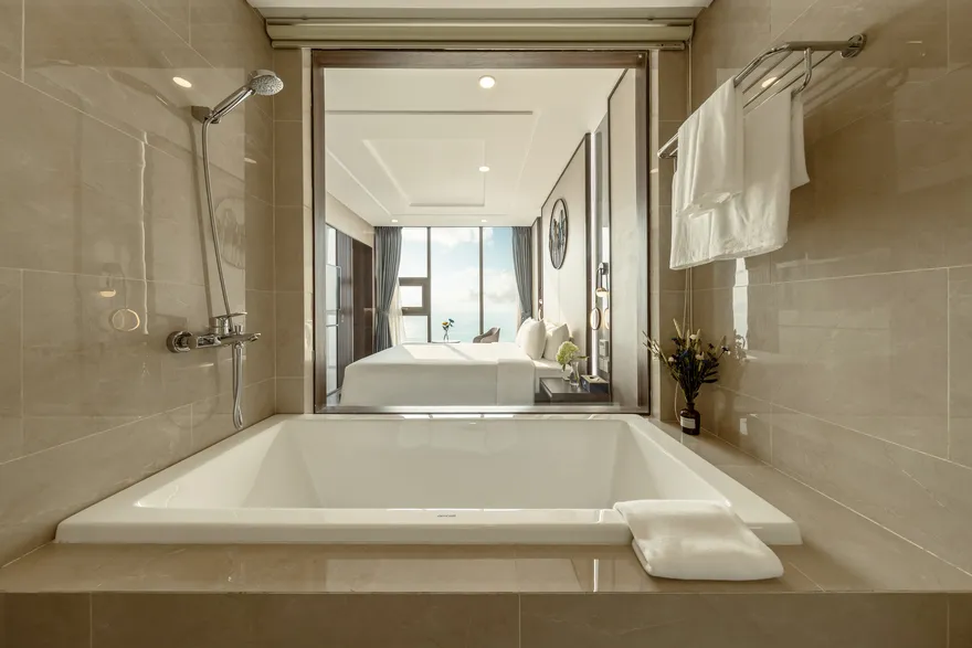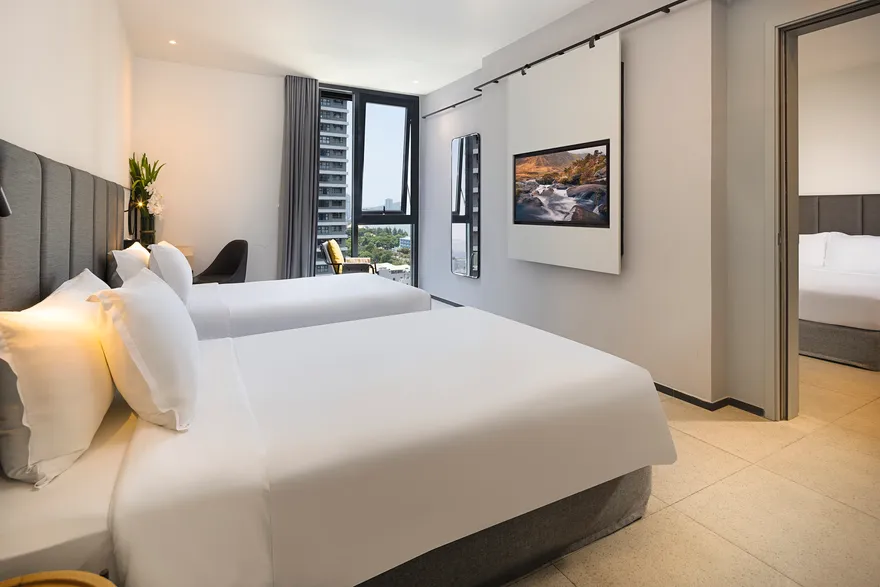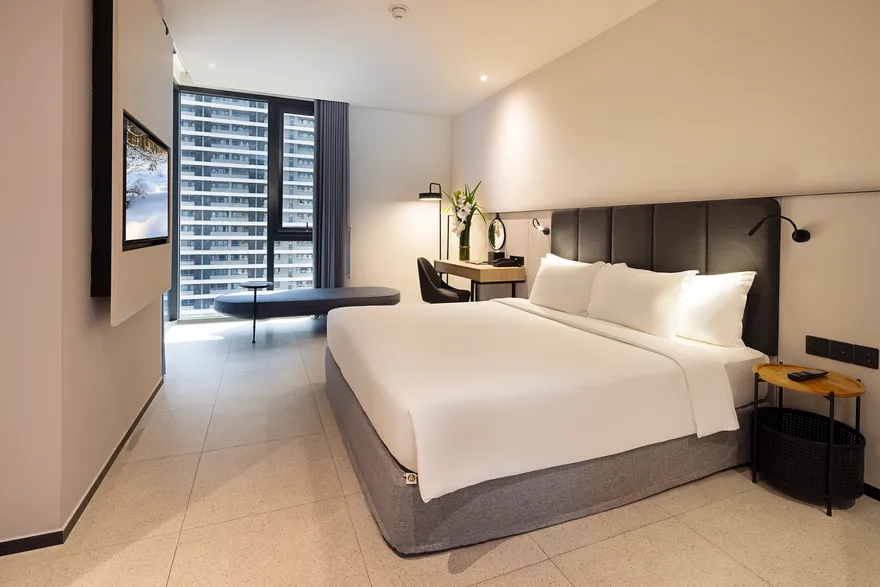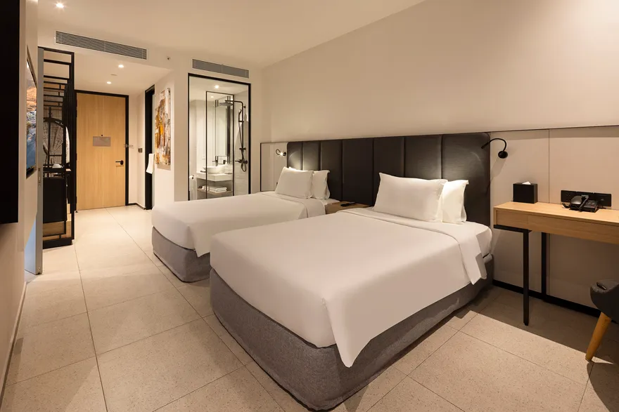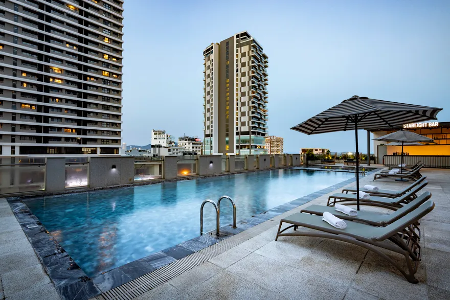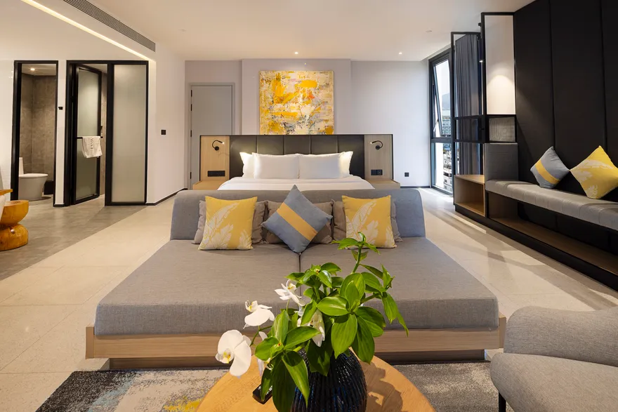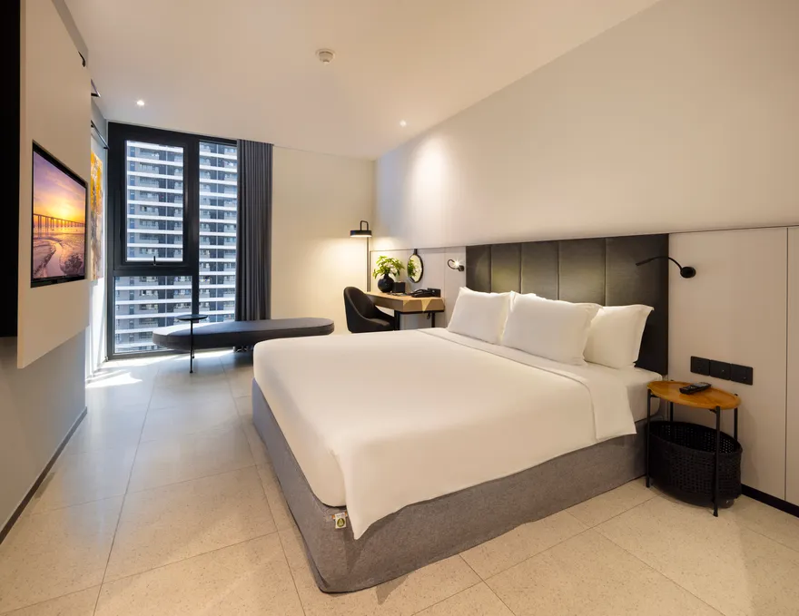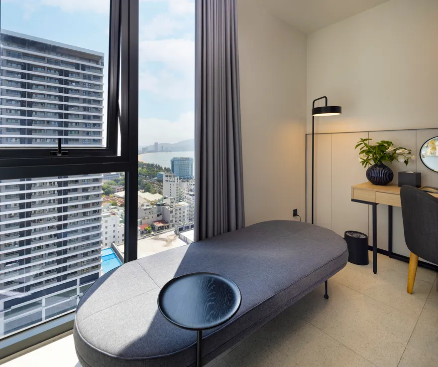 Kiến trúc của tòa nhà 21 tầng này mang đậm dấu ấn đương đại với những gam màu nhạt như trắng xám và vàng ấm. Cách bài trí này không hề ngẫu nhiên mà nhắm thẳng vào cảm giác thư thái của du khách. Bước vào phòng, sự mềm mại của nội thất và ánh sáng vàng dịu nhẹ sẽ giúp tâm trí bạn lắng xuống ngay lập tức. Với 229 phòng nghỉ được phân cấp rõ ràng, khách sạn đáp ứng trọn vẹn mọi nhu cầu lưu trú. Từ những căn phòng Deluxe tinh tế cho khách công tác, đến hạng phòng Deluxe Pool Terrace độc đáo với ban công hướng thẳng ra hồ bơi tầng 3 đầy cây xanh, hay Executive Suite sang trọng dành cho những ai muốn thức dậy với tầm nhìn đại dương bao la, tất cả đều chú trọng vào chất lượng giấc ngủ và sự tiện nghi tối đa.