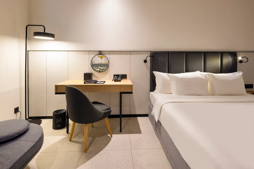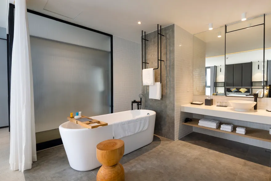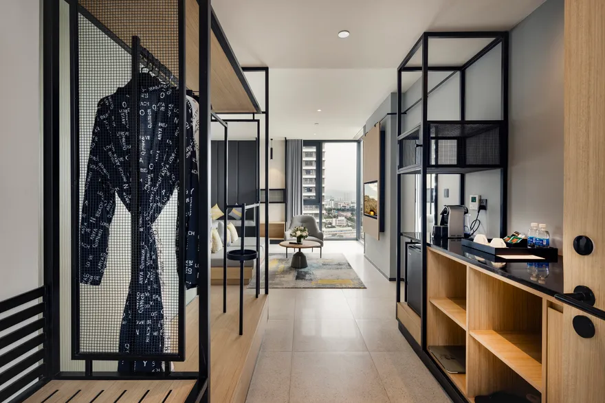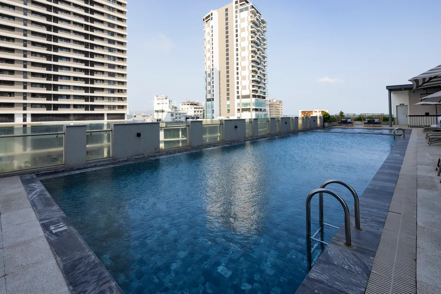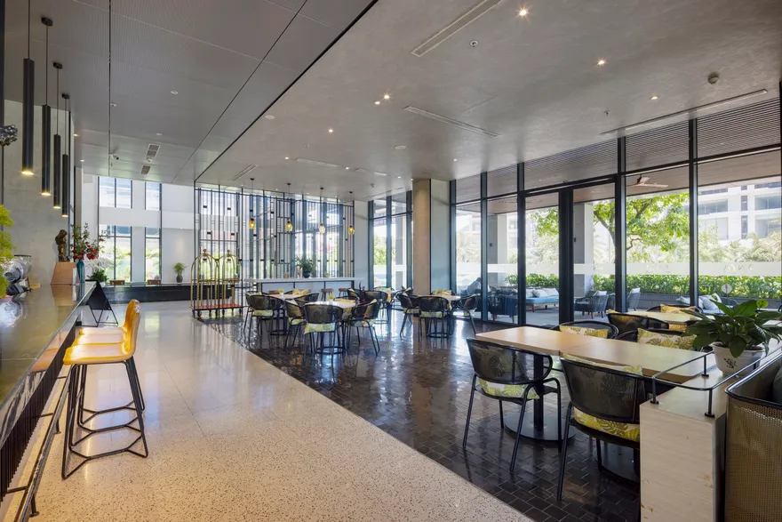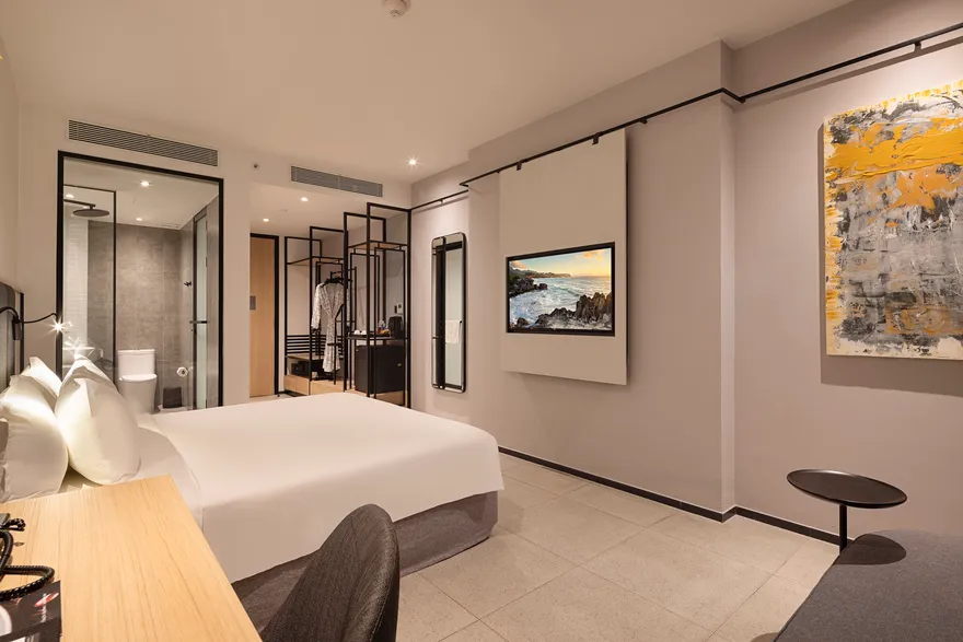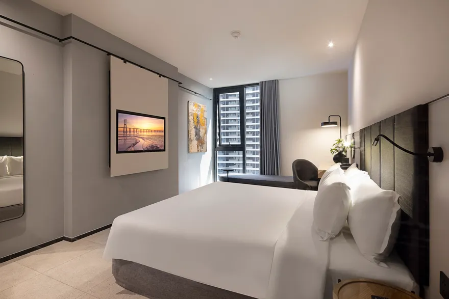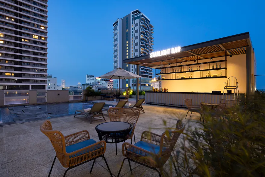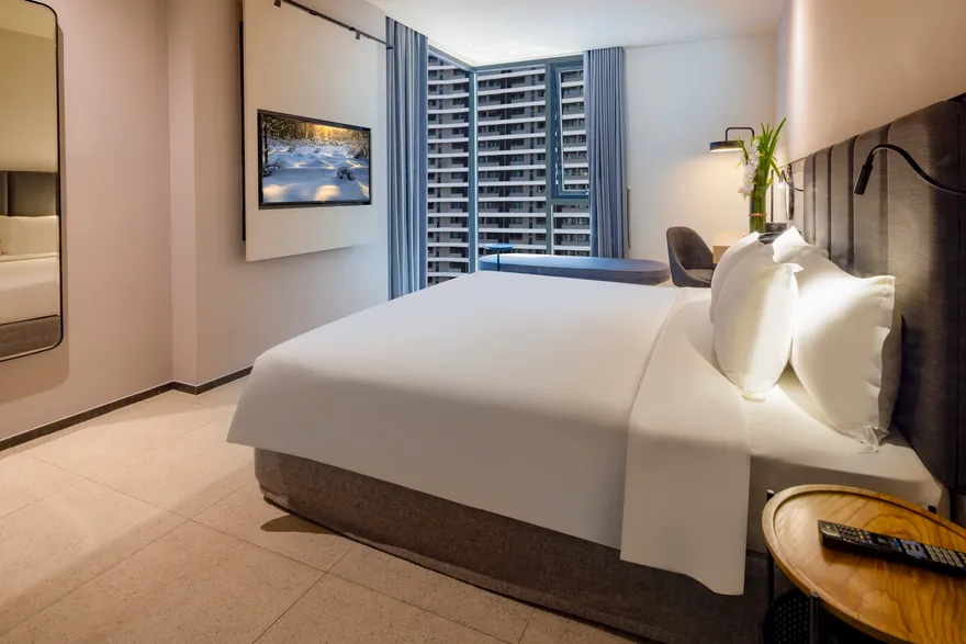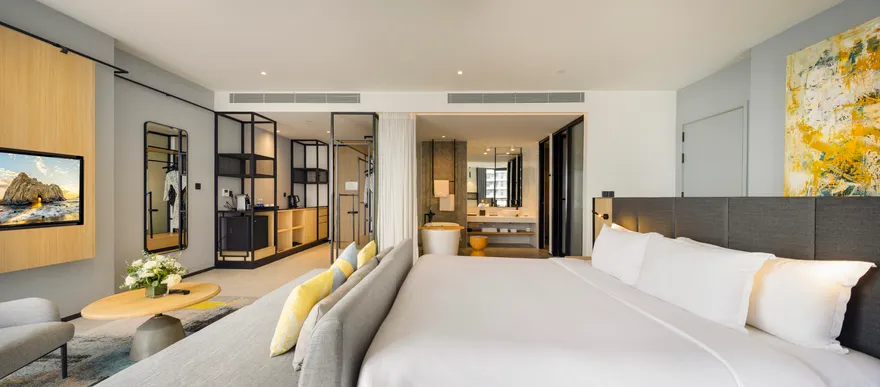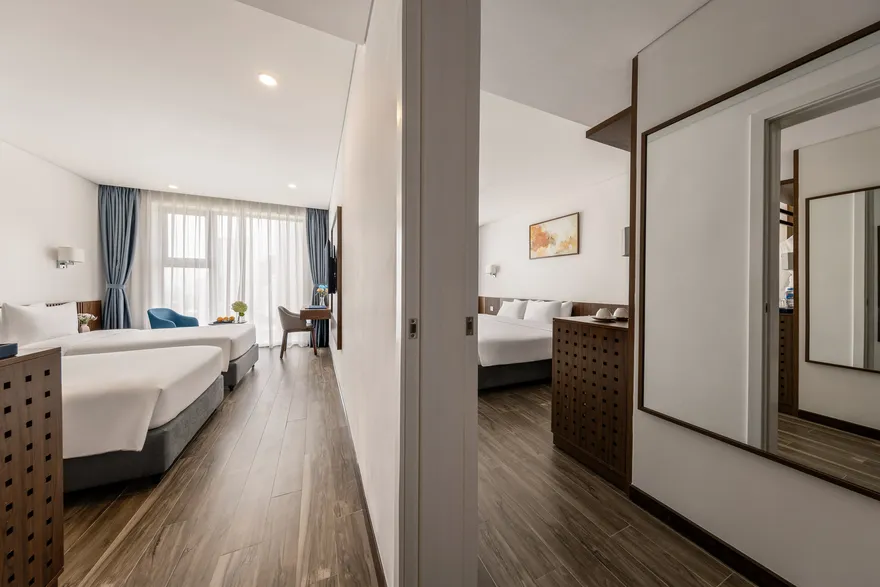 Kiến trúc của tòa nhà 21 tầng này mang đậm dấu ấn đương đại với những gam màu nhạt như trắng xám và vàng ấm. Cách bài trí này không hề ngẫu nhiên mà nhắm thẳng vào cảm giác thư thái của du khách. Bước vào phòng, sự mềm mại của nội thất và ánh sáng vàng dịu nhẹ sẽ giúp tâm trí bạn lắng xuống ngay lập tức. Với 229 phòng nghỉ được phân cấp rõ ràng, khách sạn đáp ứng trọn vẹn mọi nhu cầu lưu trú. Từ những căn phòng Deluxe tinh tế cho khách công tác, đến hạng phòng Deluxe Pool Terrace độc đáo với ban công hướng thẳng ra hồ bơi tầng 3 đầy cây xanh, hay Executive Suite sang trọng dành cho những ai muốn thức dậy với tầm nhìn đại dương bao la, tất cả đều chú trọng vào chất lượng giấc ngủ và sự tiện nghi tối đa.