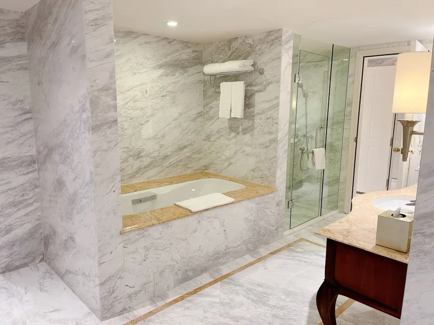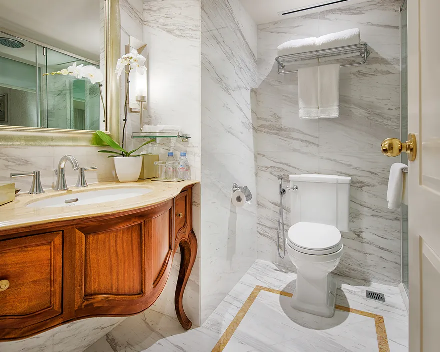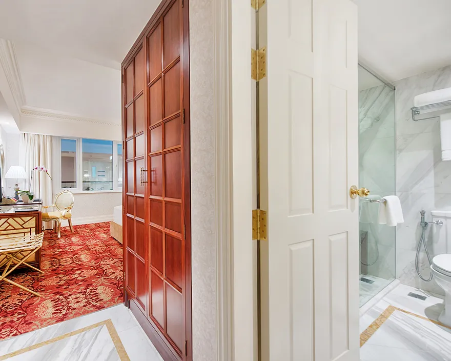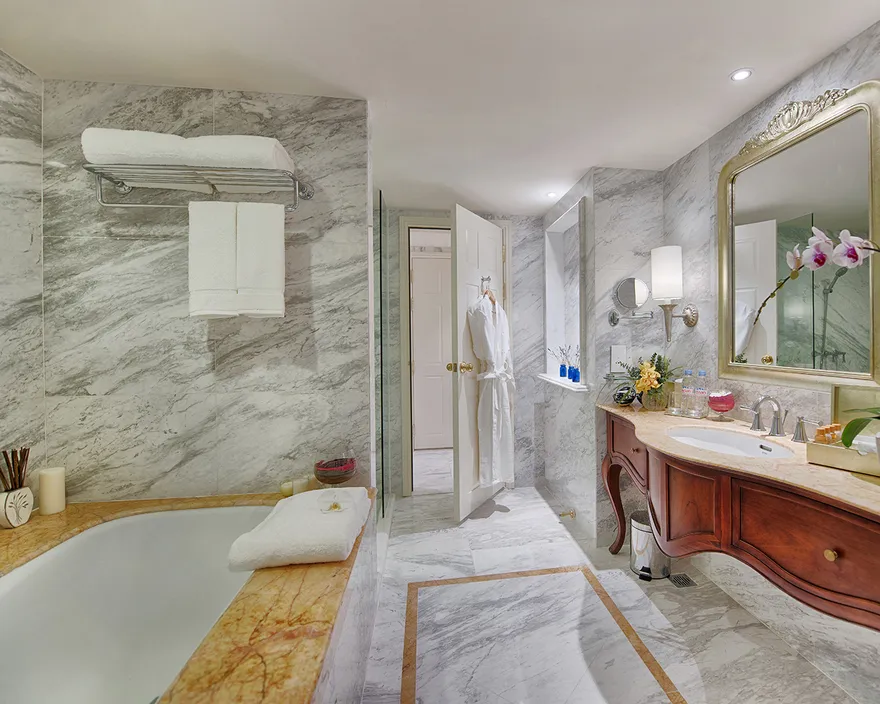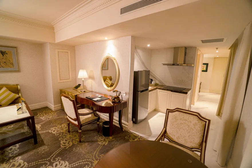 Chỉ có hạng phòng Studio (diện tích 56 $m^2$) mới được trang bị đầy đủ khu vực bếp nhỏ (kitchenette) và bàn ăn riêng.Hạng phòng này còn tích hợp sẵn máy giặt bên trong, tạo điều kiện thuận lợi nhất cho những chuyến công tác dài ngày (Extended stays).Ngoài ra, phòng Studio còn có bồn tắm nằm trong một không gian thiết kế đậm chất nghệ thuật.