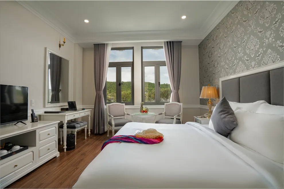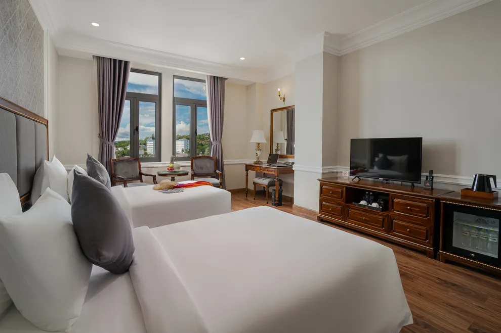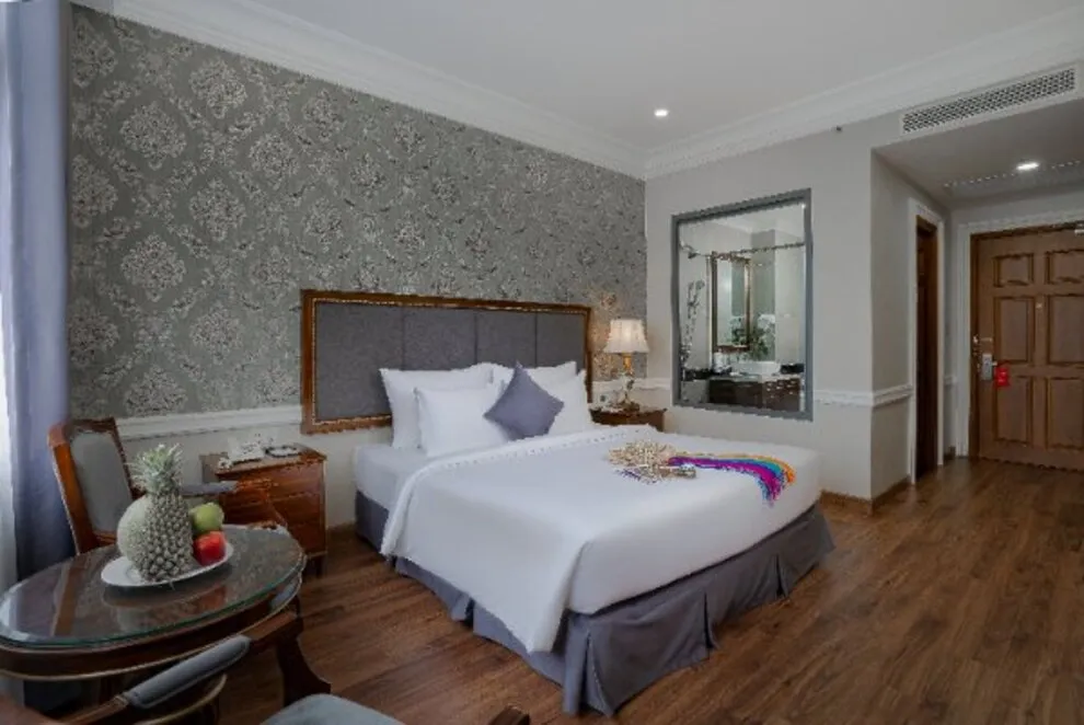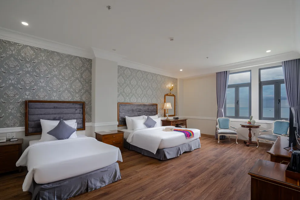 Về hệ thống lưu trú, khách sạn sở hữu quy mô 100 phòng nghỉ được thiết kế tinh tế với sàn gỗ ấm cúng và nội thất cao cấp. Hệ thống phòng ốc tại đây rất đa dạng, đáp ứng nhu cầu của mọi đối tượng du khách. Nếu đi công tác hoặc đi cặp đôi, bạn có thể chọn hạng Deluxe City View hoặc Premier Sea View với không gian thoáng đãng. Đối với gia đình nhỏ, hạng Triple Room (gồm 1 giường đôi và 1 giường đơn) là lựa chọn lý tưởng để cả nhà cùng quây quần. Đặc biệt, nếu yêu thích sự sang trọng và không gian rộng mở, du khách có thể nâng cấp trải nghiệm tại các hạng Junior Suite hoặc Executive Suite nằm ở tầng cao, sở hữu ban công riêng và phòng khách tiện nghi. Tất cả các phòng đều được trang bị miễn phí trà, cà phê và nước suối hàng ngày.