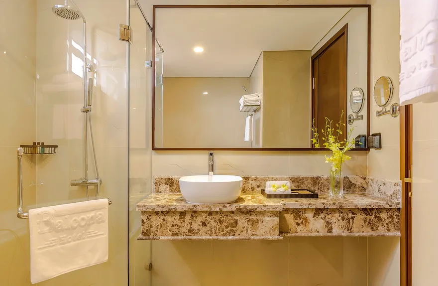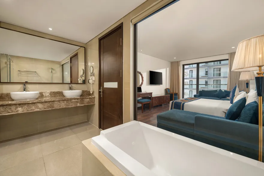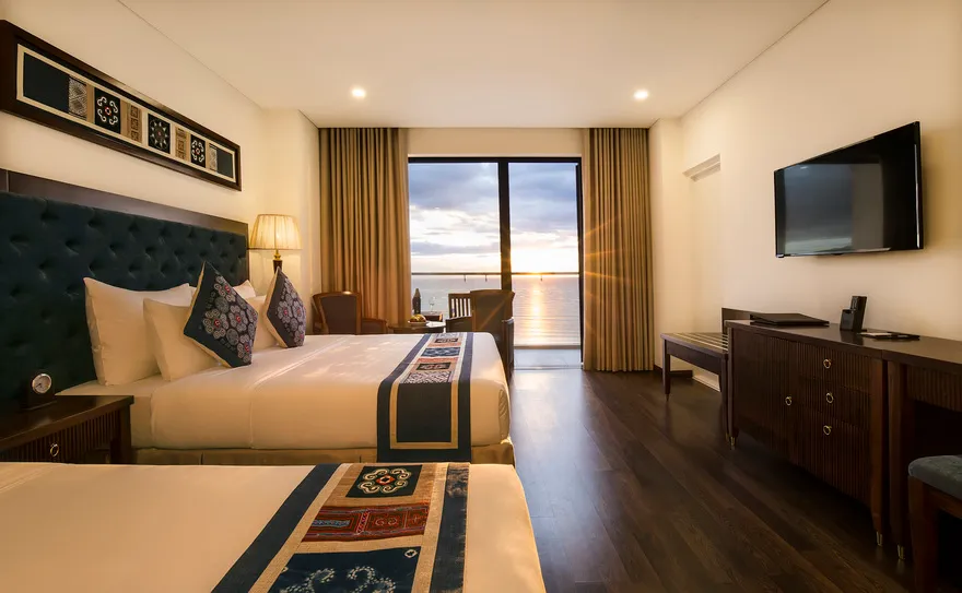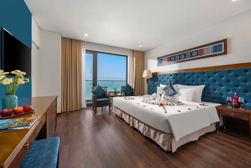 Bước vào bên trong, hệ thống phòng nghỉ hiện đại tại Balcona mở ra một thế giới hoàn toàn khác, nơi mọi nhu cầu cá nhân đều được trân trọng. Điểm chạm tinh tế nhất chính là thiết kế 100% ban công lộng gió. Chúng mình tin rằng, một không gian sống thực sự phải là nơi “biết thở”, nơi bạn có thể mở toang cửa sổ để đón lấy hơi thở mặn mòi của đại dương. Dù bạn chọn hạng phòng Superior & Deluxe rộng rãi 37 $m^2$ với tầm nhìn phố thị hay view “xẻ biển” (Sea side) thi vị, cảm giác về sự tự do và an toàn luôn được đặt lên hàng đầu để đảm bảo một giấc ngủ sâu đúng nghĩa.
