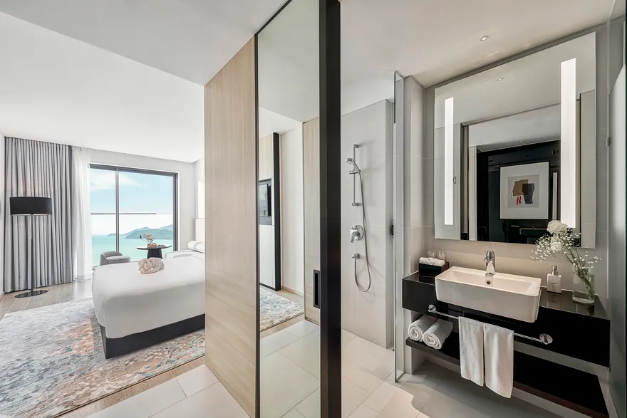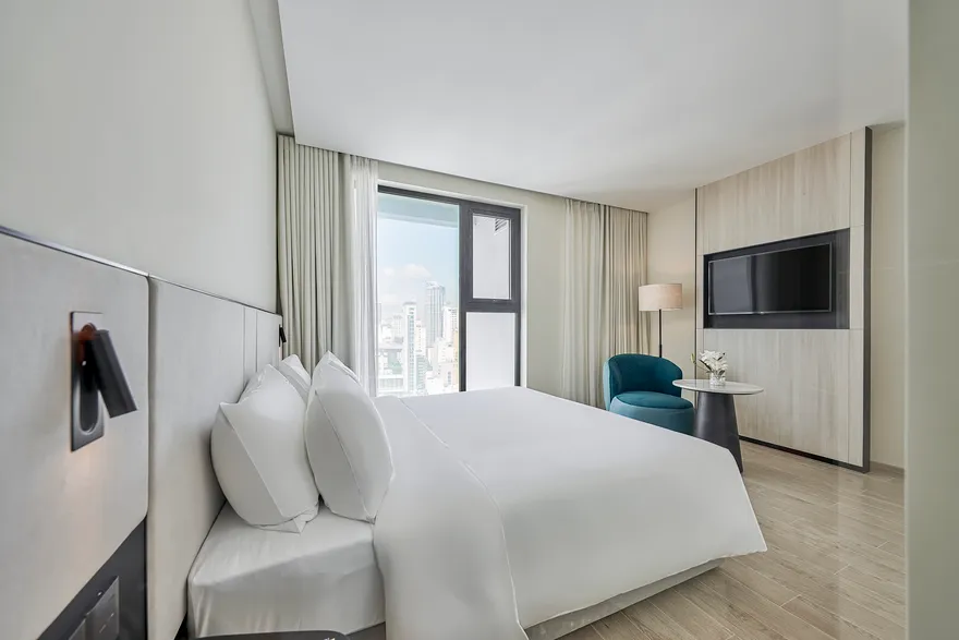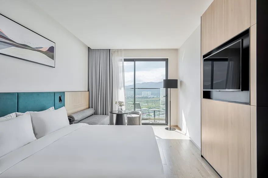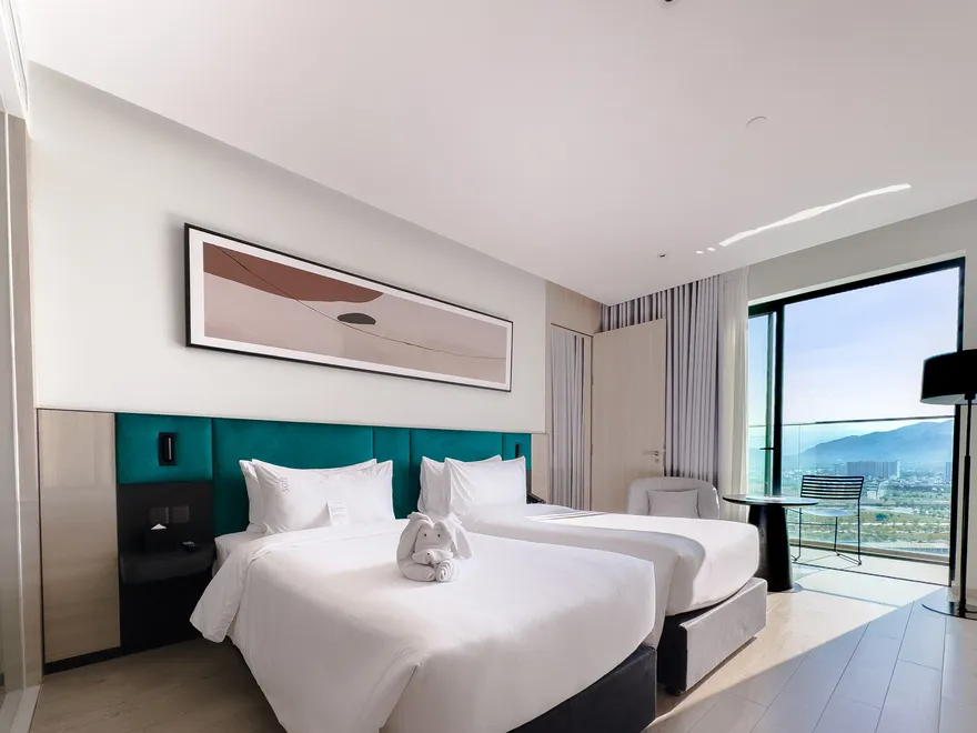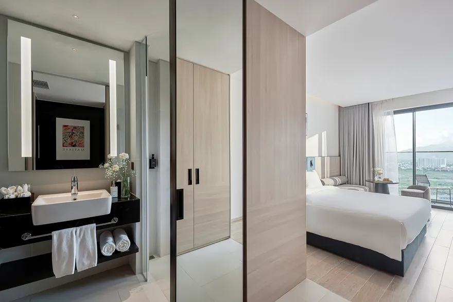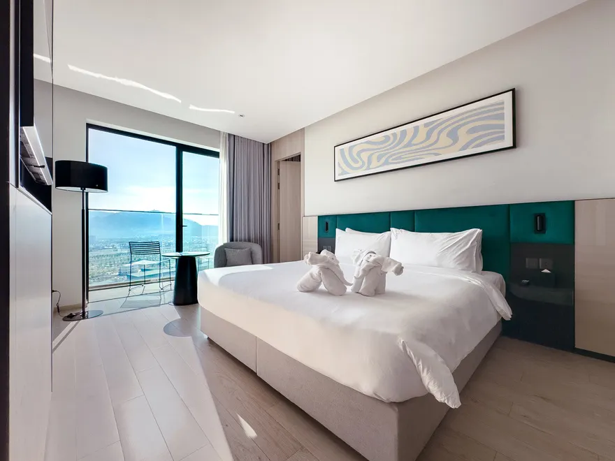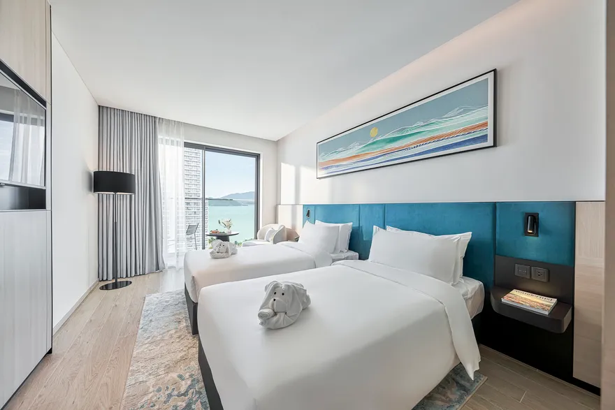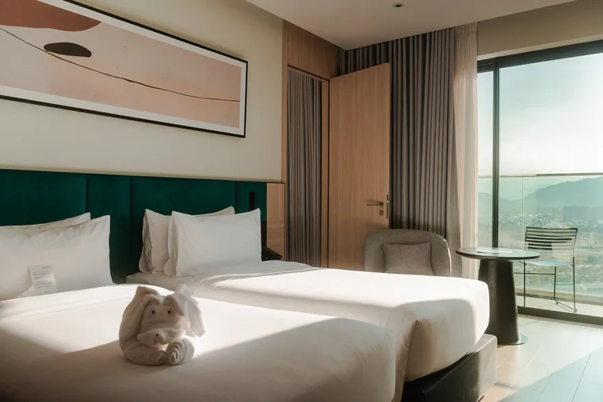 Sở hữu quy mô 245 phòng nghỉ được thiết kế tinh tế nhằm tối ưu hóa sự thư giãn và thoải mái cho du khách , với điểm nhấn đặc trưng là hầu hết các hạng phòng đều sở hữu ban công riêng biệt để tận hưởng trọn vẹn ánh sáng và không gian. Các hạng phòng chủ lực như City View với tùy chọn cửa sổ hoặc ban công là lựa chọn tối ưu cho khách công vụ và các cặp đôi cần sự tiện nghi đô thị. Đối với du khách yêu thích thưởng ngoạn cảnh sắc, các dòng phòng Mountain và Sea View Balcony cung cấp tầm nhìn panorama hướng thẳng ra vịnh Nha Trang hoặc những dãy núi phía Tây hùng vĩ. Bên cạnh đó, khách sạn còn mang đến không gian Family Suite rộng 55 $m^2$ lý tưởng cho các gia đình từ 4 đến 5 thành viên , cùng hệ thống 12 phòng Luxury Suite cao cấp sở hữu nội thất tinh xảo, khẳng định vị thế của một cơ sở lưu trú hạng sang thế hệ mới.