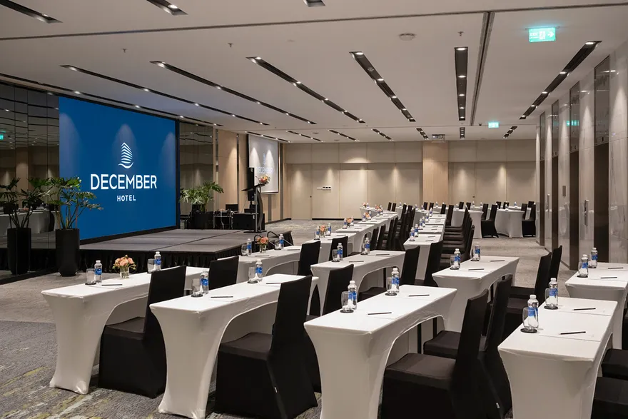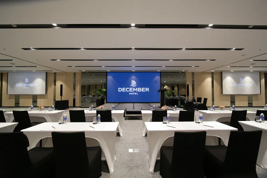 Với cơ sở vật chất hiện đại và không gian được bài trí thanh lịch, December Hotel Nha Trang hiện là một trong những lựa chọn hàng đầu cho các sự kiện doanh nghiệp và xã hội tại thành phố biển với sức chứa tối đa lên đến 250 khách. Hệ thống hạ tầng hội nghị bao gồm ba không gian chức năng chính là phòng Nha Trang, Hòn Mun và Hòn Tre với diện tích linh hoạt, đáp ứng đa dạng các loại hình sự kiện từ quy mô nhỏ đến lớn. Toàn bộ các phòng họp đều được trang bị thiết bị âm thanh, ánh sáng tối tân, máy chiếu LCD cao cấp cùng hệ thống hội nghị trực tuyến video conferencing hiện đại nhằm đảm bảo tính kết nối và tương tác chuyên nghiệp nhất. Sự hỗ trợ từ đội ngũ chuyên gia kỹ thuật tại chỗ kết hợp cùng hạ tầng internet tốc độ cao giúp khách sạn khẳng định vị thế là một trung tâm hội nghị đa năng và chuyên nghiệp.