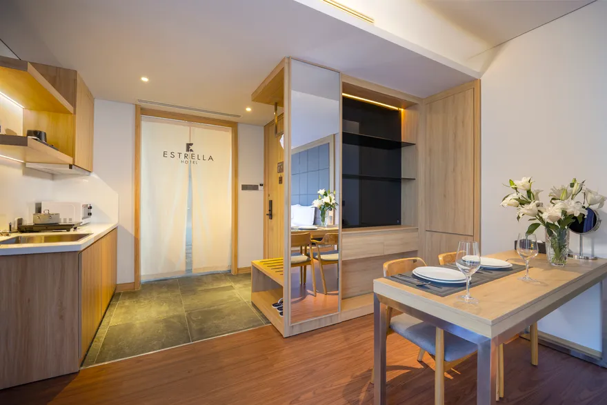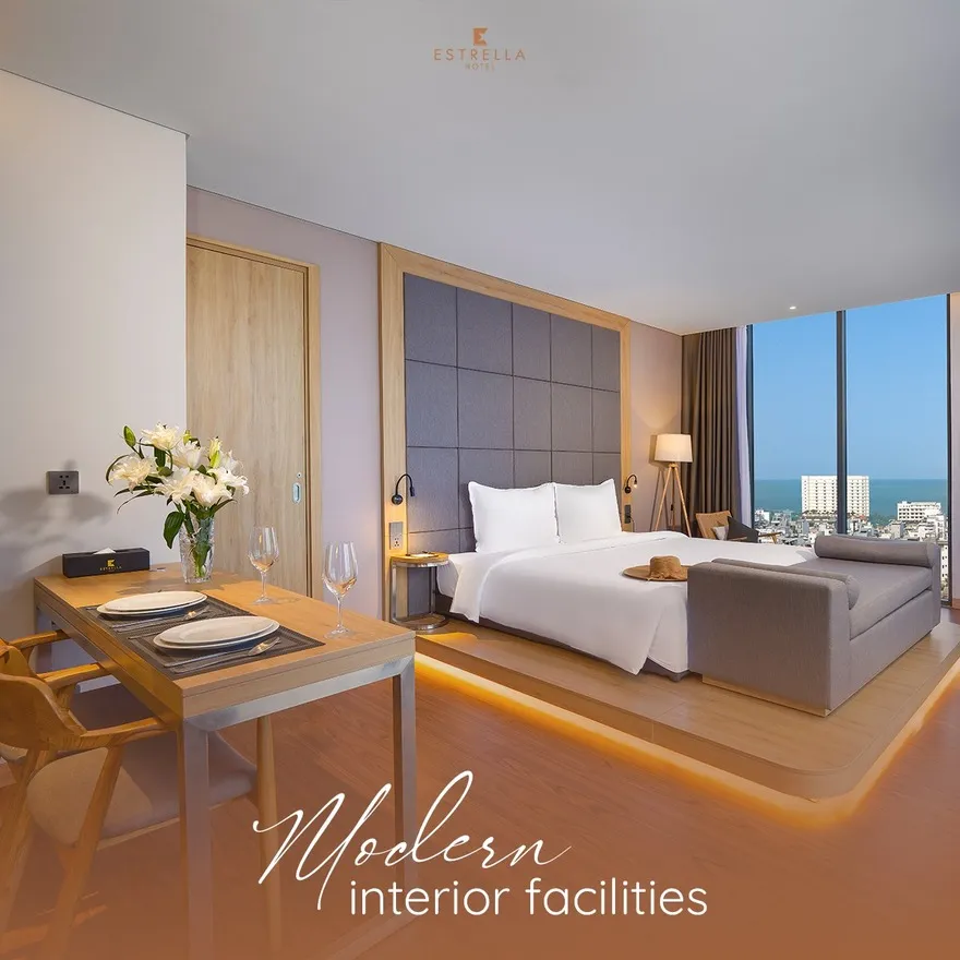 Triết lý “Boutique” tại Estrella được thể hiện rõ nét qua quy mô 10 tầng với số lượng phòng giới hạn, giúp đội ngũ nhân viên duy trì sự tập trung cao độ và chăm sóc tận tâm cho từng cá nhân khách hàng. Không gian nội thất theo phong cách hiện đại với bảng màu trung tính tạo nên cảm giác sang trọng và là một “ốc đảo” thanh bình đối lập với sự náo nhiệt của phố thị bên ngoài. Để đáp ứng nhu cầu khắt khe của du khách hiện đại, khách sạn trang bị hệ thống cửa kính cách âm chất lượng cao, mạng lưới WiFi tốc độ siêu tốc trên 250 Mbps và Smart TV tích hợp công nghệ điều khiển chuột bay hiện đại, đảm bảo sự riêng tư tuyệt đối và kết nối không gián đoạn cho công việc lẫn giải trí.
