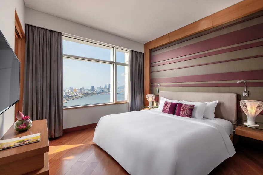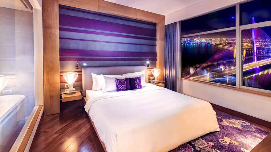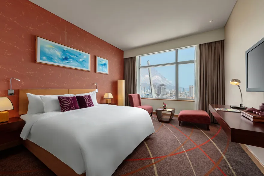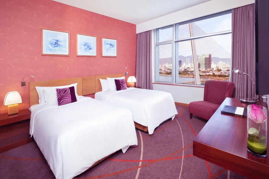 Hệ thống lưu trú tại đây gồm 272 phòng nghỉ hiện đại với thiết kế tinh tế, đảm bảo 100% các phòng đều sở hữu tầm nhìn trực diện hướng ra sông Hàn. Du khách có thể lựa chọn hạng phòng Superior nằm từ tầng 6 đến tầng 16 với 14 cặp phòng thông nhau phù hợp cho gia đình, hoặc hạng Deluxe tại các tầng cao với đặc quyền sử dụng Privilege Lounge sang trọng. Đối với những ai tìm kiếm sự đẳng cấp tuyệt đối, hạng phòng Suite diện tích 52 $m^2$ với phòng khách riêng biệt và máy pha cà phê Espresso là sự lựa chọn hoàn hảo. Tất cả các phòng đều được trang bị tiện nghi chuẩn 5 sao như WiFi tốc độ cao, TV LCD màn hình lớn và các vật dụng vệ sinh thân thiện với môi trường.