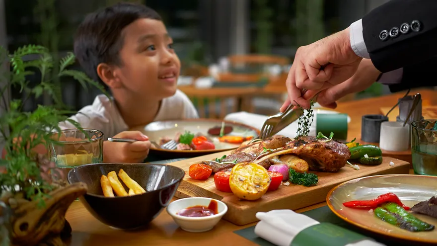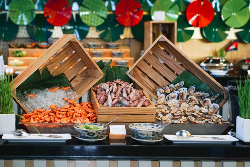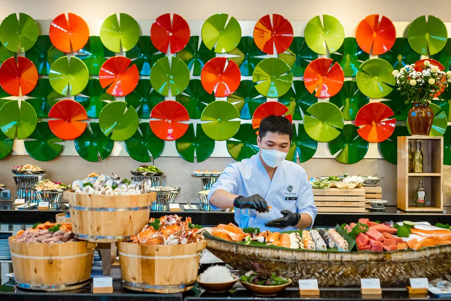 Hành trình ẩm thực tại Grand Mercure Đà Nẵng vô cùng phong phú, nổi bật với nhà hàng The Golden Dragon tại tầng 2, nơi được bình chọn là nhà hàng Trung Hoa số 1 tại Đà Nẵng trên TripAdvisor nhờ thực đơn Dim Sum đích thực. Tại tầng trệt, nhà hàng La Rive Gauche là nơi phục vụ buffet sáng quốc tế thịnh soạn và đêm tiệc hải sản nướng BBQ vào mỗi tối thứ Sáu hàng tuần. Du khách cũng có thể thư giãn tại Nirvana Bar ngay khu vực sảnh với các loại cocktail sáng tạo hoặc trải nghiệm trà chiều lãng mạn trong tiếng nhạc du dương.
