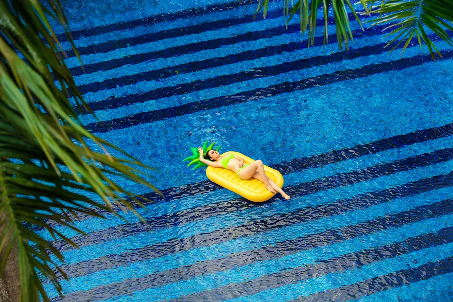 Bạn sẽ được trải nghiệm hồ bơi ngoài trời lớn nhất thành phố Huế, được bao quanh bởi thảm cỏ xanh và những hàng cọ hoàng gia.