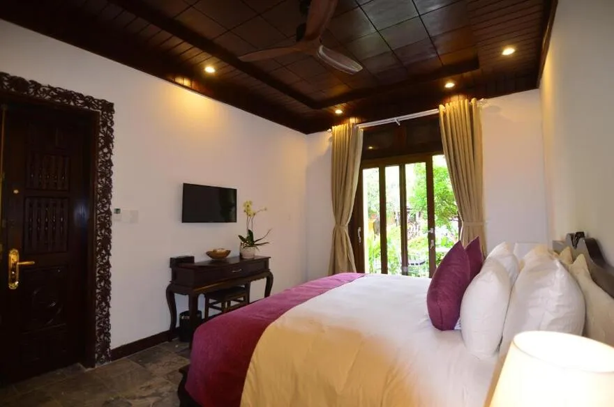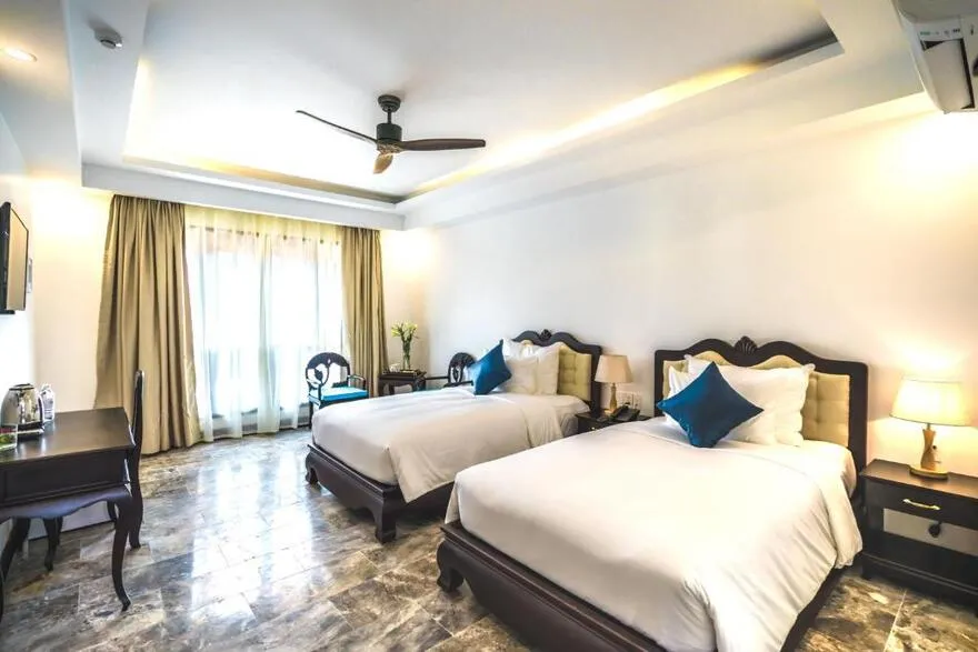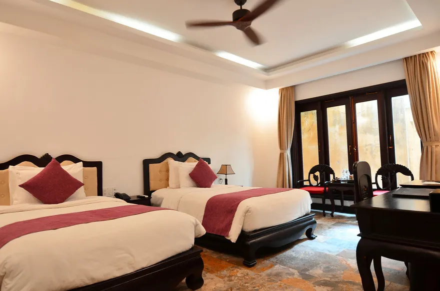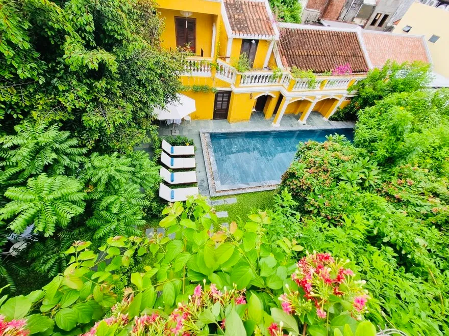 Sức hút của nơi này còn đến từ lối kiến trúc mang phong vị Indochine đầy hoài niệm, đóng vai trò như một “cỗ máy thời gian” đưa du khách trở về thời kỳ thuộc địa Pháp đầy tinh tế. Lớp áo bên ngoài của tòa nhà được phủ sắc vàng đặc trưng của phố Hội, nhấn nhá bởi hệ thống cửa lá sách xanh thẫm và những khoảng ban công gỗ nhỏ nhắn—nơi du khách có thể tựa lưng đọc sách hay ngắm nhìn nhịp sống chậm rãi phía dưới. Bước vào bên trong, sự đối lập giữa những mảng gạch bông truyền thống mát lạnh và tiện nghi hiện đại được xử lý vô cùng khéo léo. Trái tim của toàn bộ khu nghỉ chính là hồ bơi ngoài trời được bao quanh bởi vườn cây nhiệt đới xanh mướt. Trong cái nắng gắt của miền Trung, mặt nước phẳng lặng này không chỉ là nơi giải trí mà còn đóng vai trò điều hòa không khí và cảm xúc, tạo nên một bảng màu trị liệu giúp rũ bỏ mọi áp lực ngay khi vừa đặt chân tới.