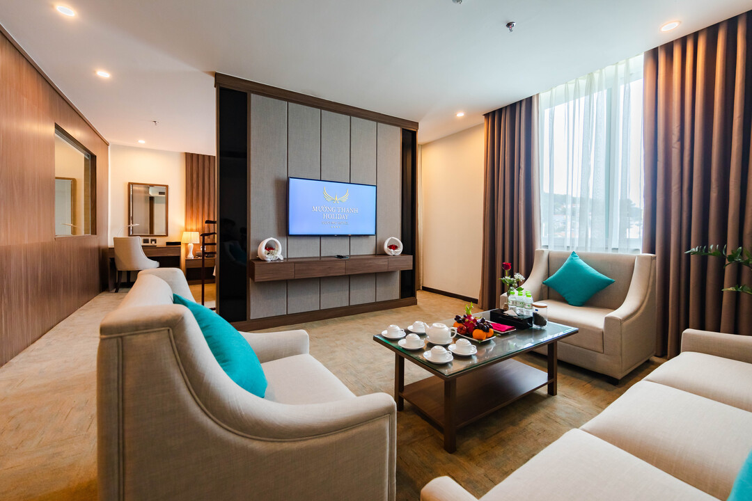 Hệ thống phòng nghỉ tại khách sạn được thiết kế đa dạng để đáp ứng mọi nhu cầu lưu trú. Hạng phòng tiêu chuẩn Deluxe King/Twin rộng 33m² mang đến không gian nghỉ ngơi ấm cúng cho 2 người với tầm nhìn hướng biển hoặc thành phố. Đối với nhóm bạn hoặc gia đình nhỏ, phòng Deluxe Triple (33m²) là lựa chọn tối ưu với 3 giường đơn riêng biệt. Đặc biệt, hạng phòng cao cấp nhất Executive Suite sở hữu diện tích ấn tượng 70m², bao gồm phòng khách và phòng ngủ riêng biệt, tạo nên đẳng cấp nghỉ dưỡng khác biệt.