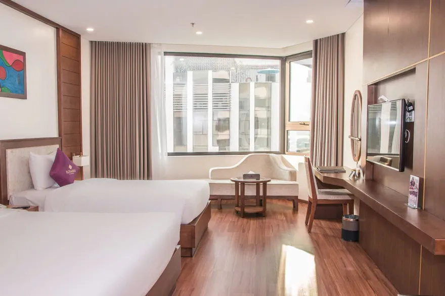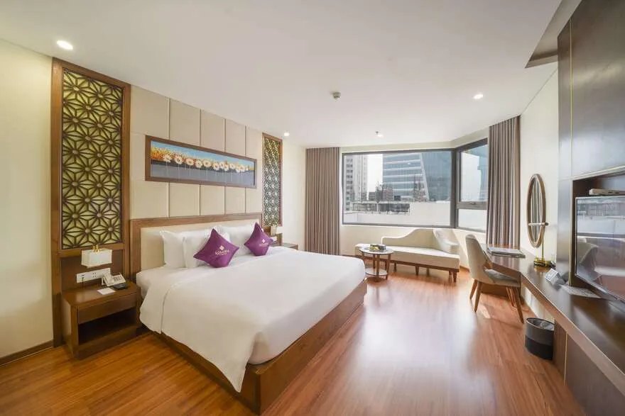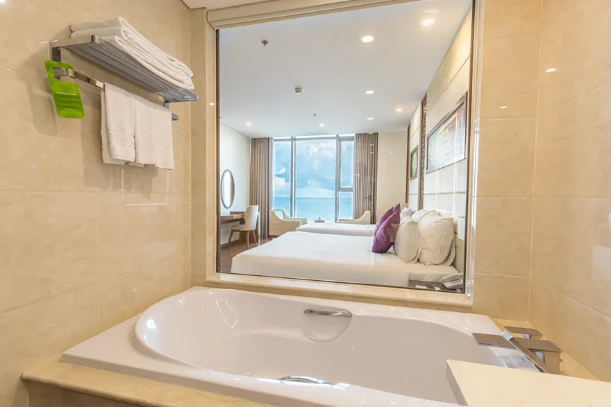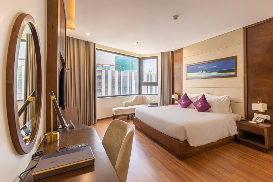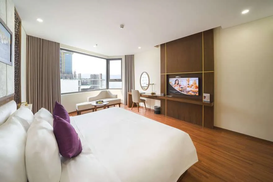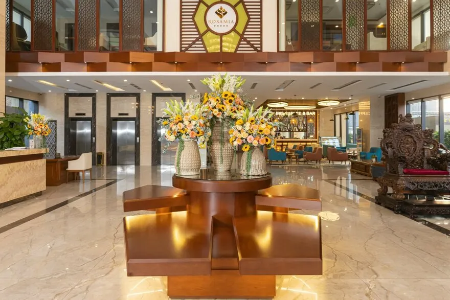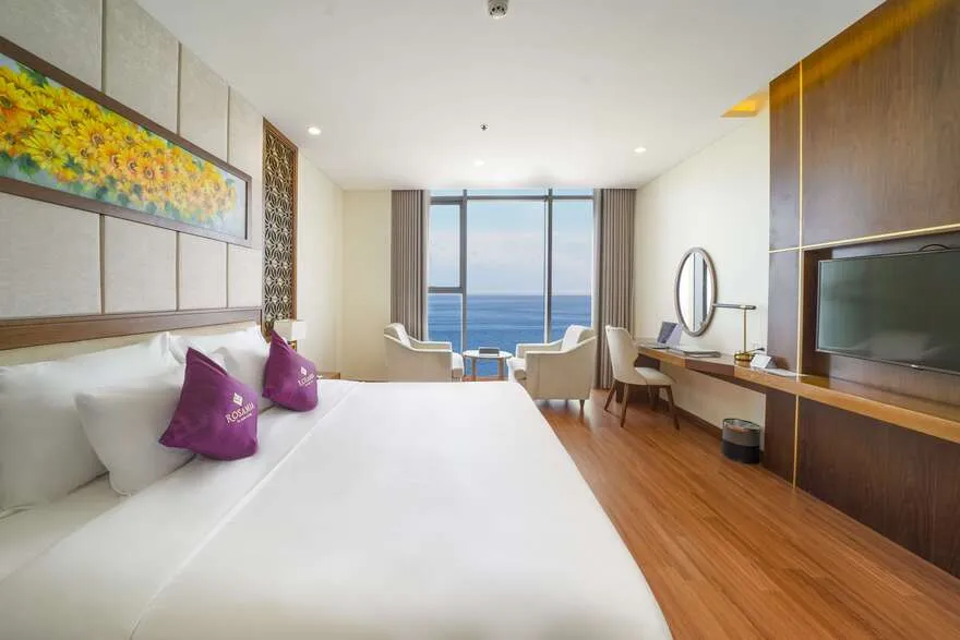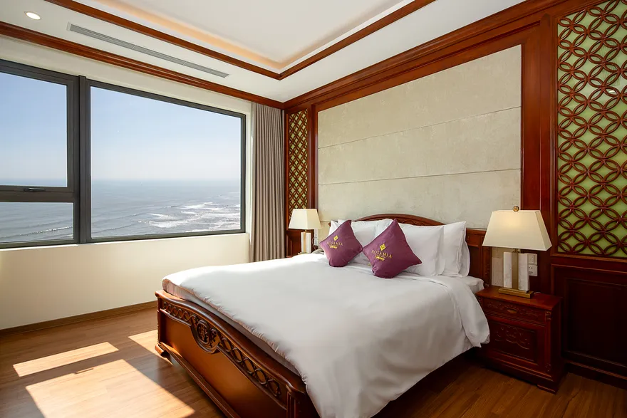 Khách sạn Rosamia Đà Nẵng hiện lên như một biểu tượng nghỉ dưỡng 5 sao kiêu hãnh tọa lạc trên “dải đất kim cương” Võ Nguyên Giáp, trực diện bãi biển Mỹ Khê – một trong những bờ biển quyến rũ nhất hành tinh. Với quy mô 24 tầng cùng hệ thống hơn 200 phòng nghỉ hiện đại, khách sạn khẳng định vị thế điểm đến hàng đầu bằng sự kết hợp hài hòa giữa tiêu chuẩn quốc tế và lòng hiếu khách đặc trưng của người Việt. Ngôn ngữ kiến trúc tại đây theo đuổi phong cách tối giản tinh tế, ưu tiên sử dụng hệ thống kính cường lực lớn để tận dụng tối đa ánh sáng tự nhiên và mở rộng tầm nhìn hướng đại dương bao la, mang lại trải nghiệm thị giác ấn tượng cho du khách ngay từ bên trong phòng ngủ.