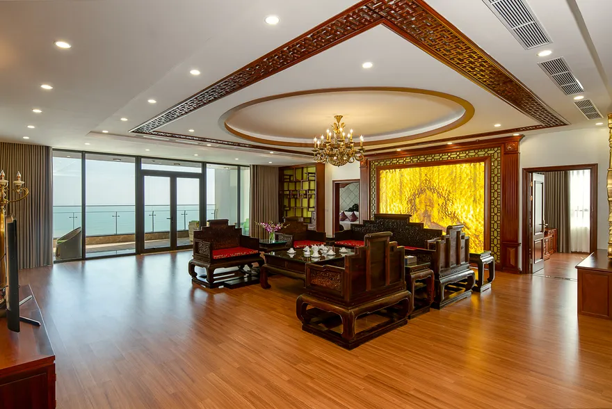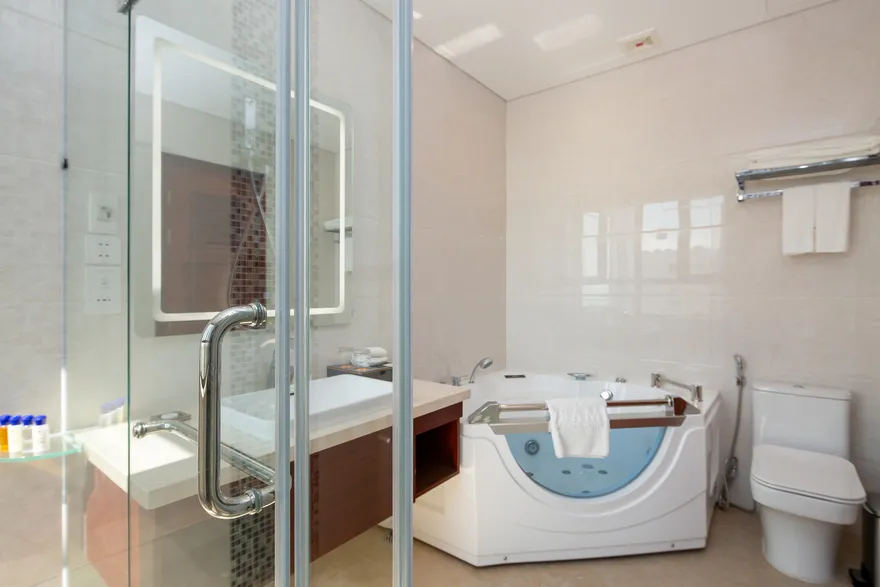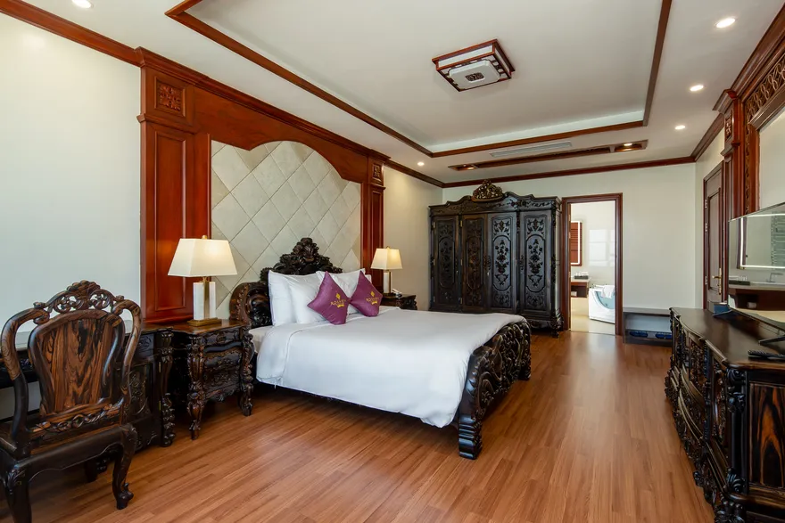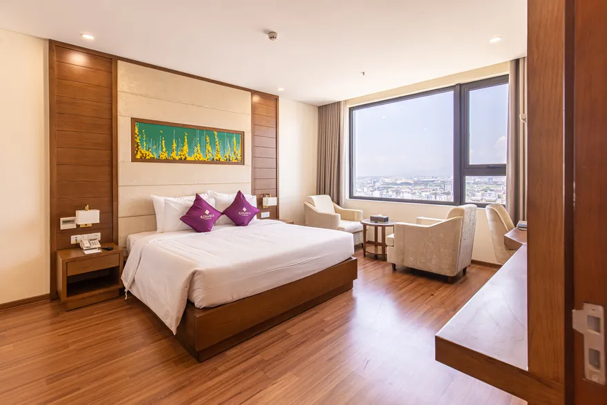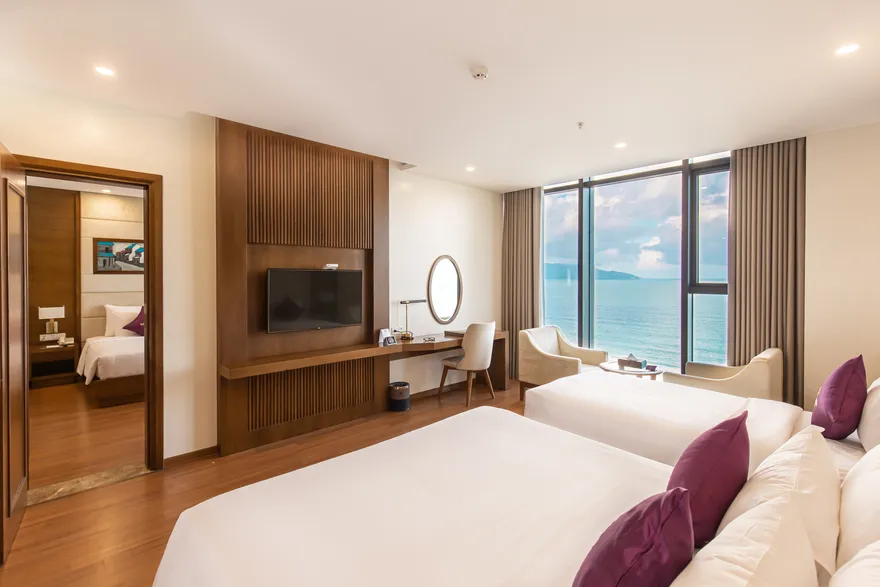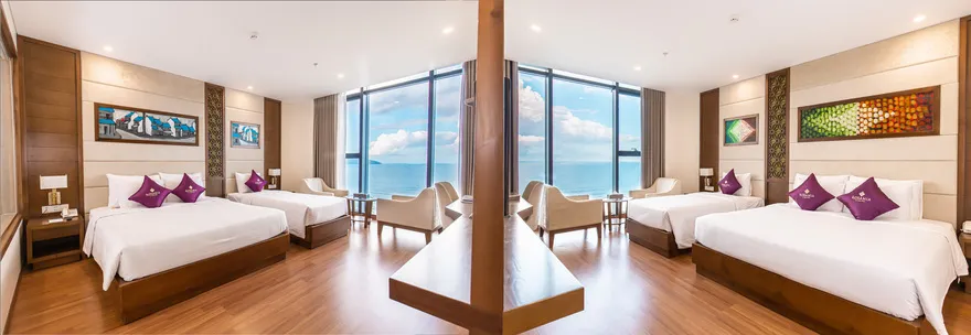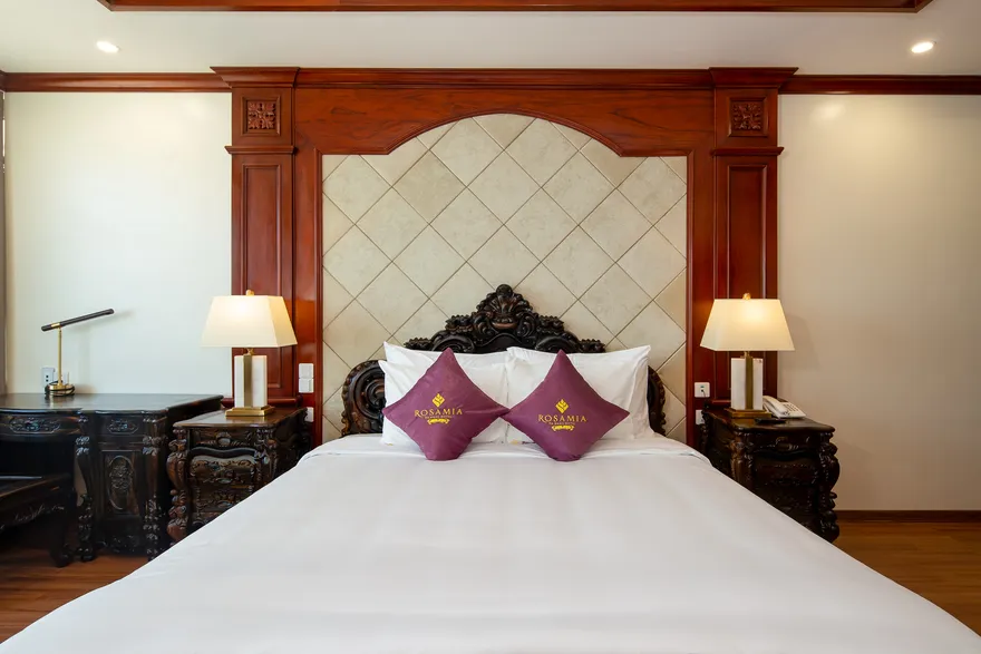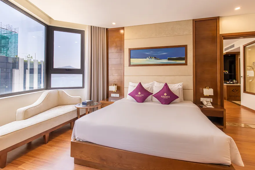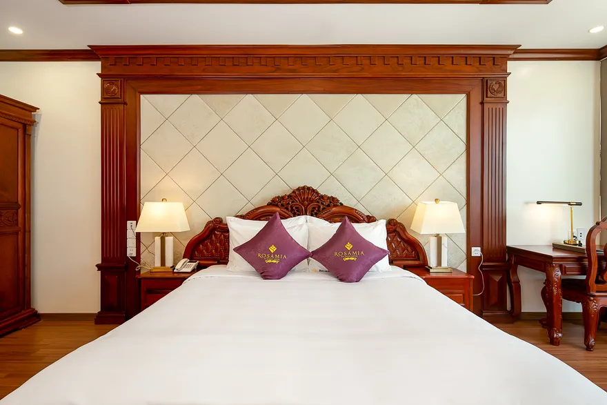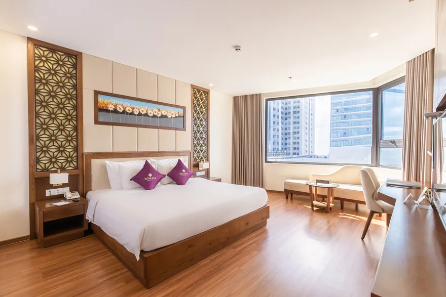 Hệ thống lưu trú tại Rosamia được phân lớp khoa học để đáp ứng nhu cầu đa dạng, từ các hạng phòng Deluxe và Grand thanh lịch với diện tích từ 28 $m^2$ đến 34 $m^2$ cho đến dòng Premier Ocean Front sở hữu tầm nhìn không vật cản ra bán đảo Sơn Trà. Điểm nhấn sang trọng nhất nằm ở phân khúc Executive Suite rộng 66 $m^2$ được trang bị bồn sục Jacuzzi riêng tư, hay các căn Family và Presidential Suite rộng 84 $m^2$ mang đến không gian sống đẳng cấp với đầy đủ tiện nghi như một căn hộ cao cấp giữa lòng thành phố biển. Mọi chi tiết nội thất đều được chăm chút tỉ mỉ từ vật liệu gỗ tự nhiên và sàn gỗ cao cấp, phối hợp cùng tông màu pastel dịu nhẹ nhằm tạo ra sự thư thái tối đa và đảm bảo tiêu chuẩn vệ sinh khắt khe nhất cho du khách.