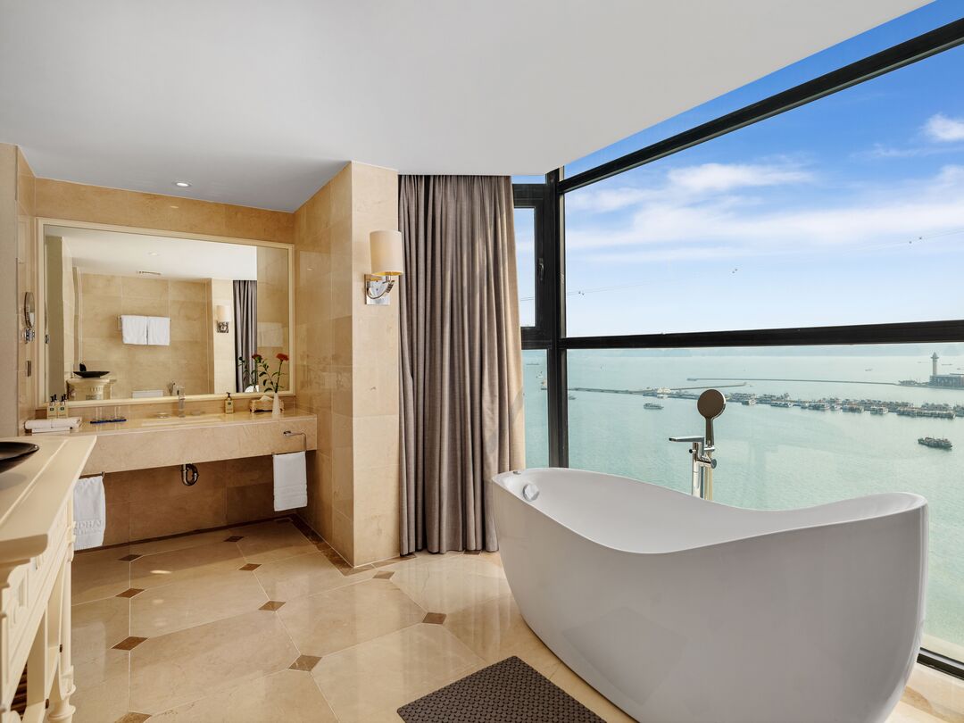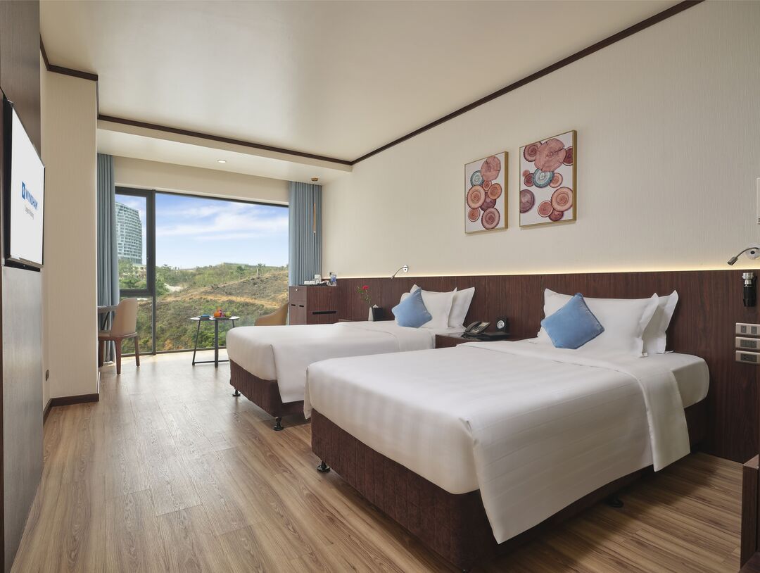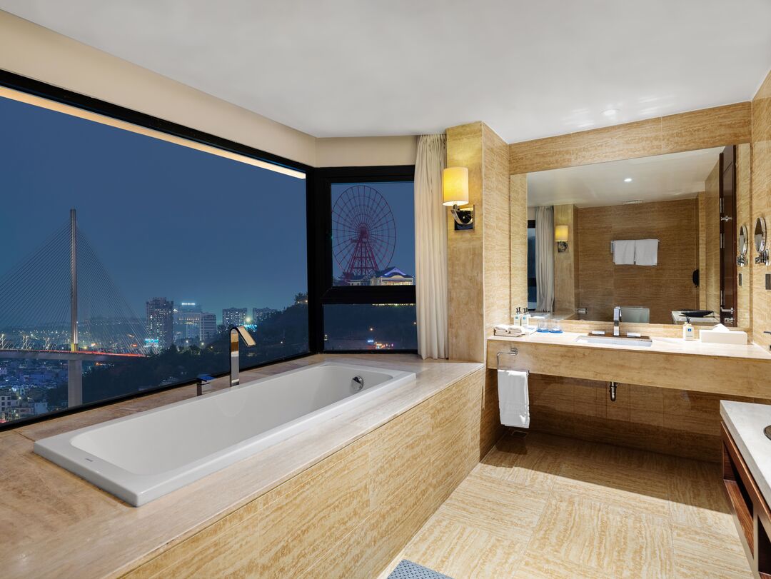 Không gian: Các phòng được thiết kế rộng rãi, đa phần đều có ban công riêng hoặc cửa sổ kính lớn từ trần đến sàn, giúp du khách tận hưởng trọn vẹn khung cảnh biển trời và thành phố .