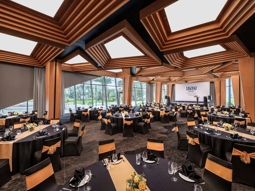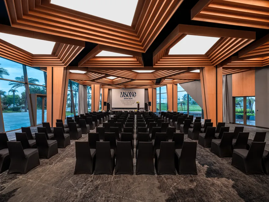 Cuối cùng, Lasong còn là địa điểm lý tưởng cho các sự kiện MICE chuyên nghiệp với phòng hội trường Harbour Ballroom rộng 430 $m^2$. Không gian này có sức chứa lên đến 400 khách và được trang bị hệ thống âm thanh, ánh sáng đạt chuẩn quốc tế. Với thiết kế đón ánh sáng tự nhiên và khả năng thiết lập linh hoạt từ hội thảo, tiệc cưới đến các buổi tiệc rượu phong cách, đây chính là nơi khơi nguồn cảm hứng cho những hành trình kết nối bền vững bên bờ biển.