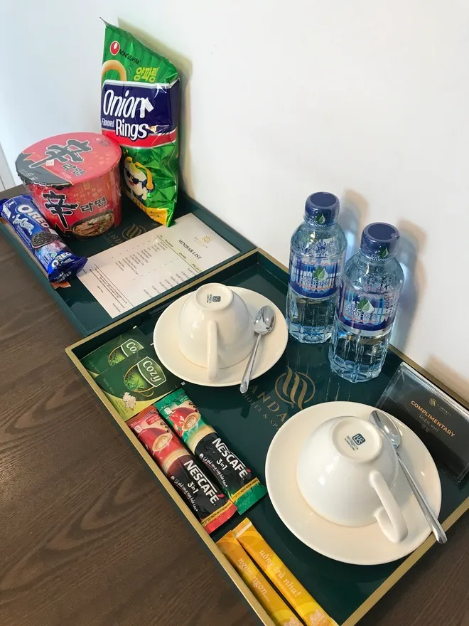 Khi lưu trú tại Mandala, du khách sẽ được tận hưởng chuỗi dịch vụ tiêu chuẩn 5 sao đầy đủ từ bữa sáng buffet tại nhà hàng đến hệ thống nước suối, trà, cà phê và nước uống chào mừng ngay khi nhận phòng. Khách sạn còn miễn phí sử dụng hồ bơi vô cực rộng gần 300$m^2$ tại tầng 7 cùng phòng Gym hiện đại. Điểm nhấn độc đáo nhất chính là đặc quyền sử dụng miễn phí tổ hợp xông hơi Hàn Quốc Jjim Jil Bang với các phòng đá muối, đá cẩm thạch và phòng tuyết Igloo giúp thải độc và phục hồi sức khỏe. Bên cạnh đó, du khách còn được hưởng ưu đãi giảm giá 10% cho các dịch vụ ăn uống và truy cập internet tốc độ cao trong suốt kỳ nghỉ.