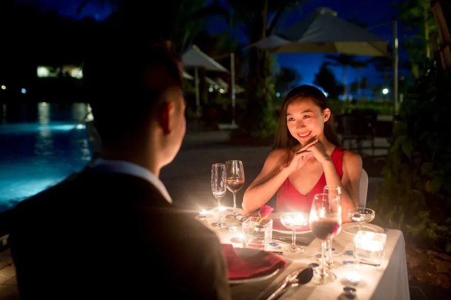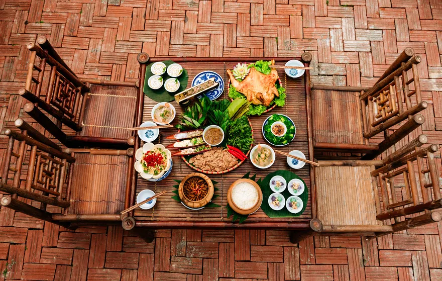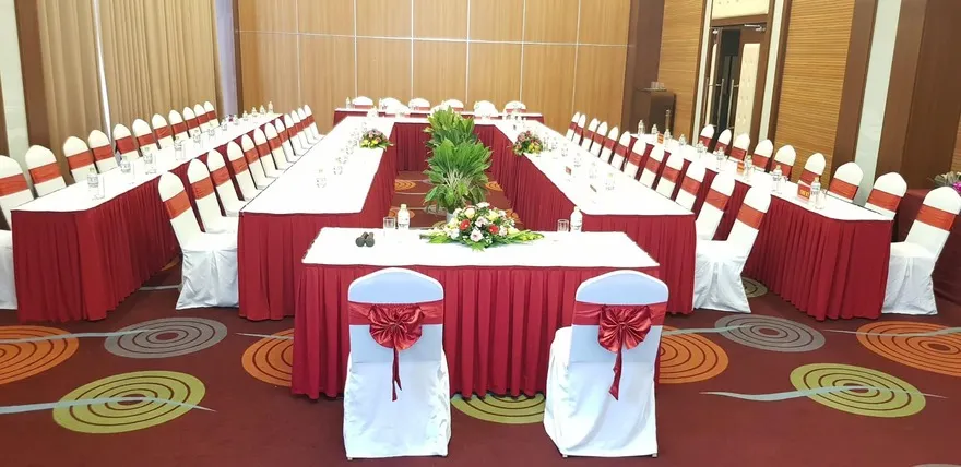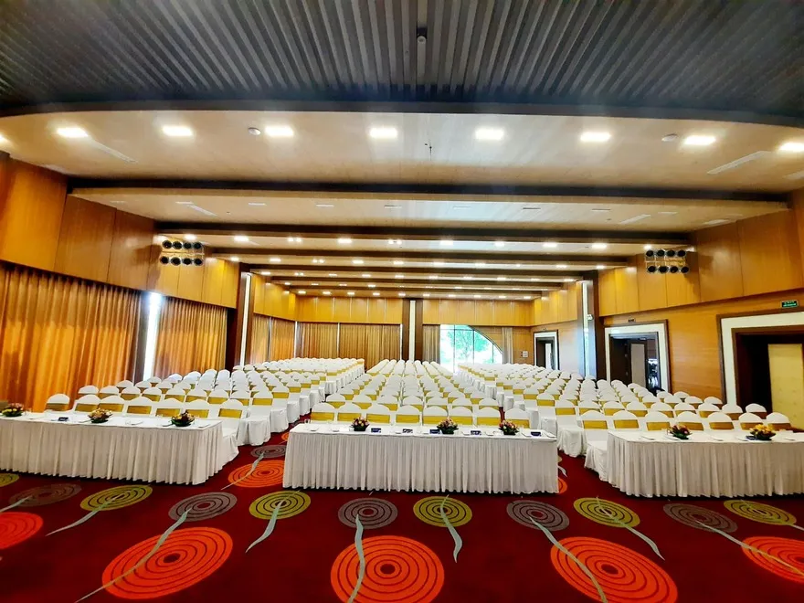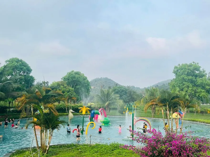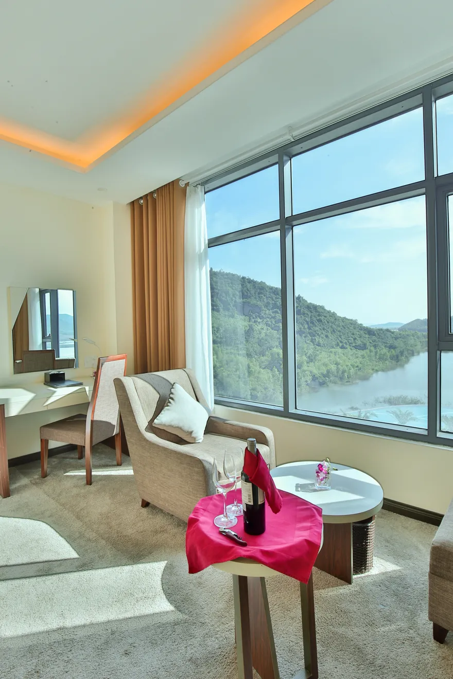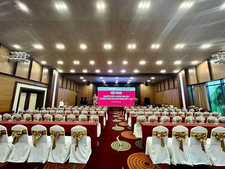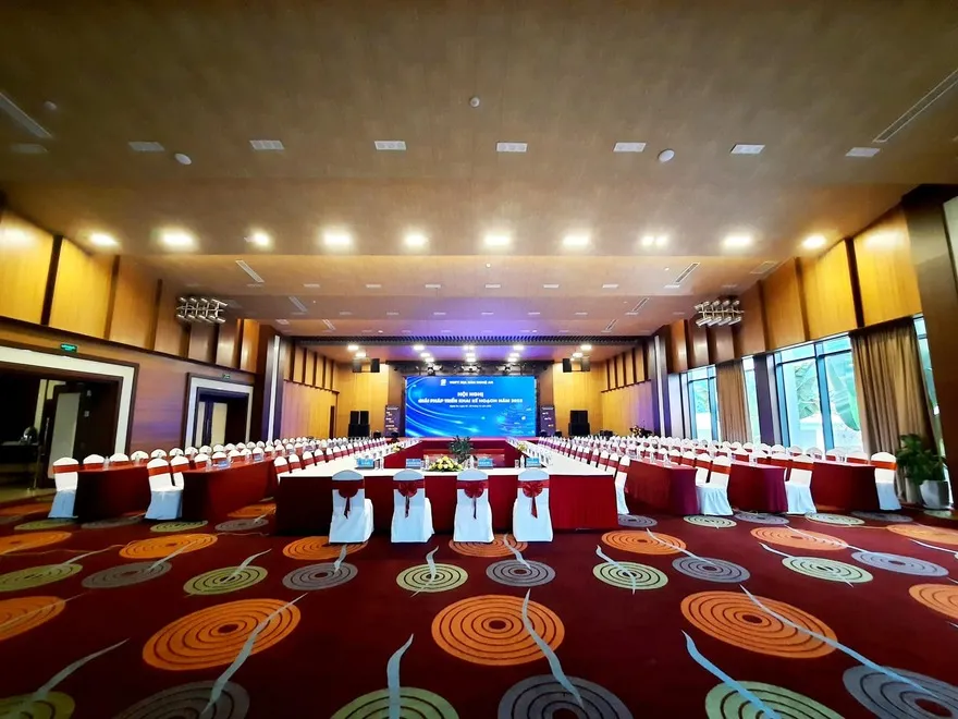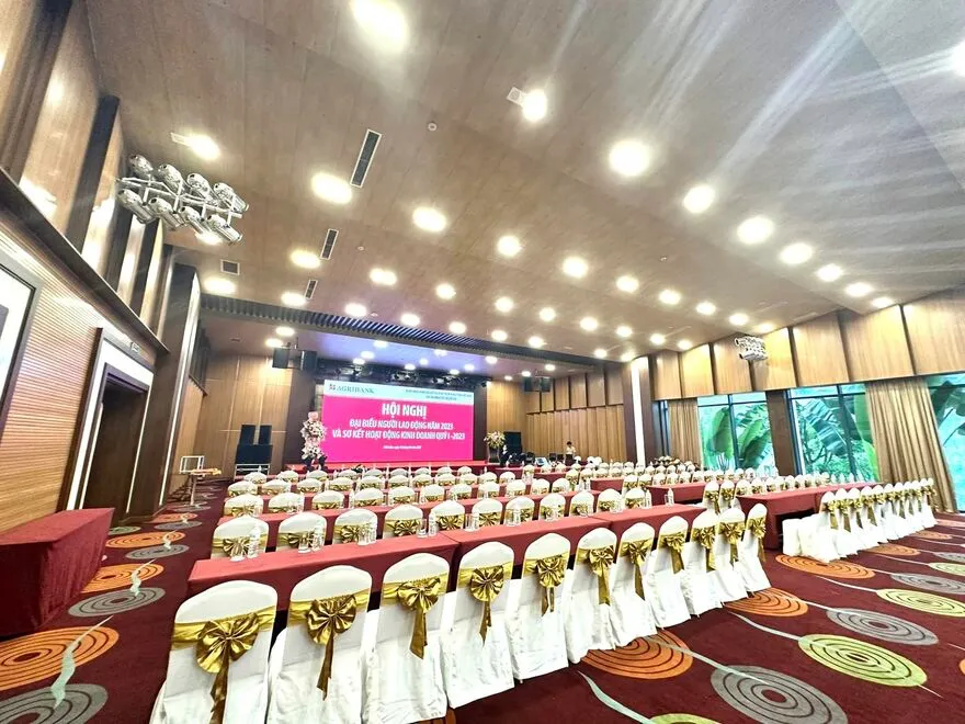 Trải nghiệm ẩm thực và dịch vụ sự kiện tại đây cũng được đầu tư bài bản để phục vụ các đoàn khách MICE chuyên nghiệp. Nhà hàng Lâm Sơn với sức chứa 600 khách chuyên phục vụ buffet sáng và thực đơn Âu – Á đa dạng, trong khi Hoan Châu Bar là không gian lý tưởng để thưởng thức đồ uống giữa cảnh sắc thiên nhiên. Hệ thống phòng họp hiện đại như phòng Bùng Giang (diện tích 450 m^2) và phòng VIP 1 được trang bị đầy đủ màn hình LED, âm thanh công suất lớn, kết hợp với không gian ngoài trời rộng lớn, đảm bảo sự thành công cho mọi sự kiện, hội thảo hay hoạt động team building của doanh nghiệp.