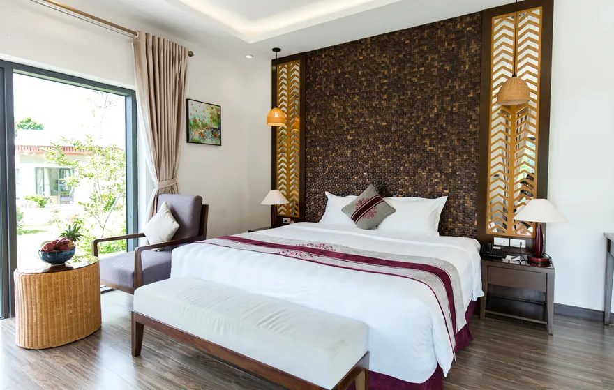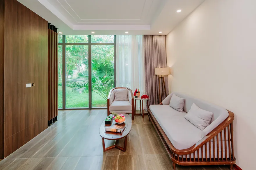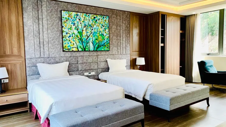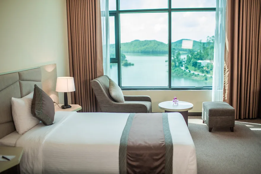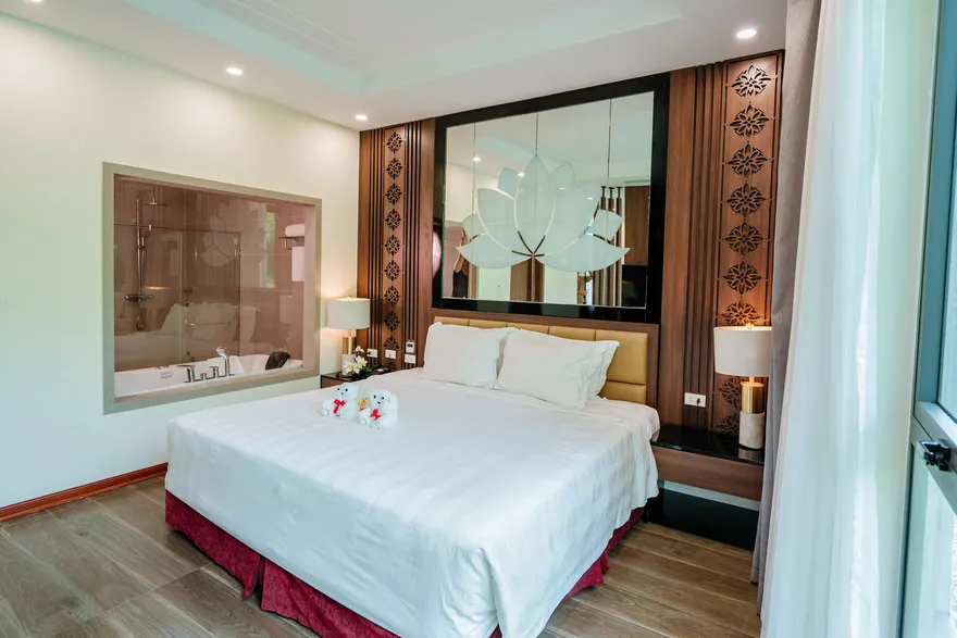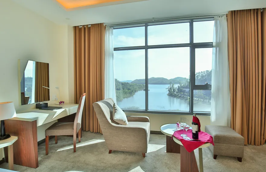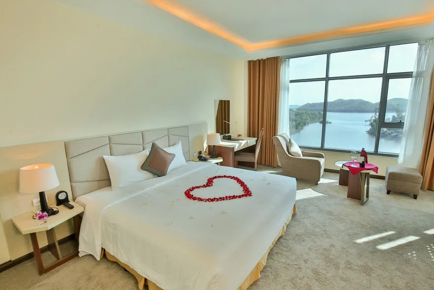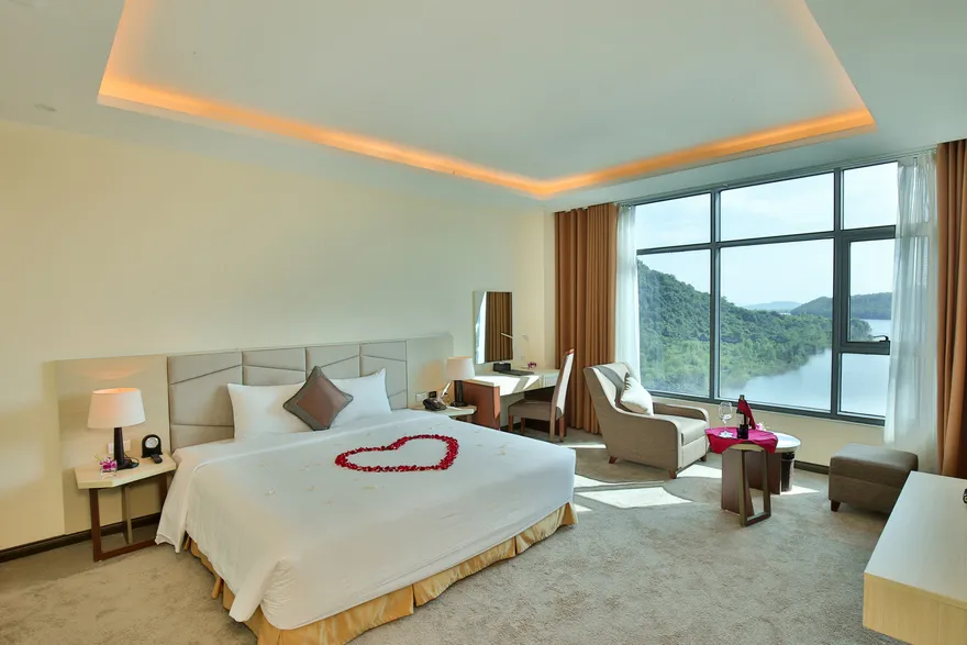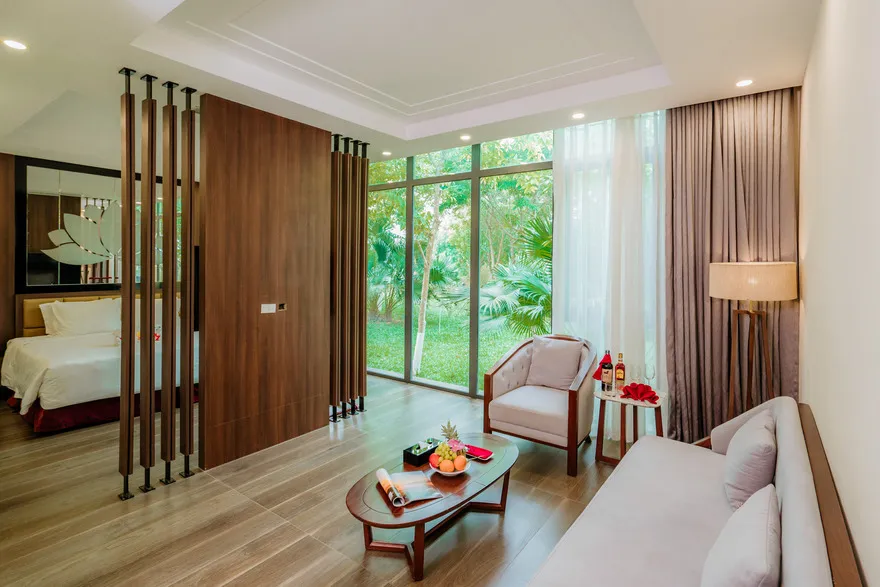 Hệ thống lưu trú tại đây là sự kết hợp hoàn hảo giữa tiêu chuẩn 5 sao quốc tế và xu hướng kiến trúc xanh bền vững. Với tổng cộng 109 phòng nghỉ hiện đại và hệ thống biệt thự ven hồ sang trọng sử dụng vật liệu độc đáo, du khách sẽ được tận hưởng không gian nghỉ dưỡng tinh tế và riêng tư tuyệt đối. Khối khách sạn cung cấp đa dạng các hạng phòng như Deluxe King, Deluxe Twin, Executive Suite và đặc biệt là phòng Presidential Suite rộng 300 m^2 đẳng cấp. Bên cạnh đó, hệ thống Villa biệt lập bao gồm Deluxe Villa, Grand Villa, Royal Villa, Executive Villa và Premiere Villa với diện tích lên đến 310 m^2, đáp ứng hoàn hảo nhu cầu cho các đại gia đình hoặc đoàn khách đông người.