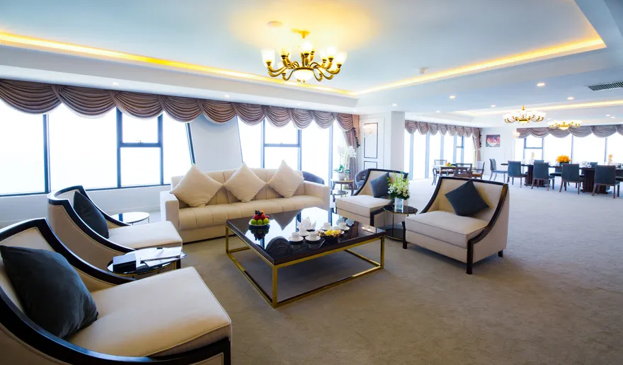 Hệ thống 583 phòng nghỉ tại đây là sự kết hợp tinh tế giữa phong cách hiện đại và tông màu trầm ấm, mang lại cảm giác sang trọng nhưng vẫn đầy gần gũi. Du khách có thể lựa chọn hạng phòng Superior để tận hưởng sự riêng tư và tĩnh lặng tuyệt đối, hoặc đắm mình trong không gian tràn ngập ánh nắng tại phòng Deluxe Ocean View với thiết kế kính tràn viền nhìn ra biển. Đối với những đoàn khách ngoại giao hoặc gia đình đa thế hệ, căn hộ Presidential Suite với diện tích lên tới 405 m2 mang đến một đẳng cấp thượng lưu biệt lập với đầy đủ quầy bar và bếp riêng. Ngoài ra, khối căn hộ phía sau tòa nhà với đầy đủ tiện nghi như máy giặt và bếp nấu là giải pháp lưu trú dài hạn lý tưởng, giúp bạn cảm thấy tự do như đang ở chính ngôi nhà của mình.