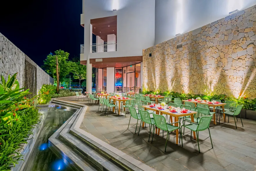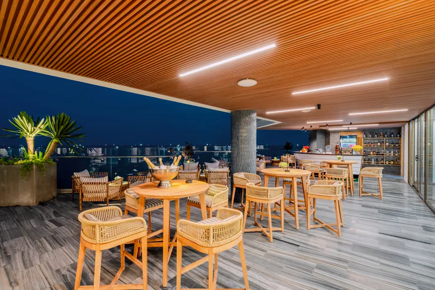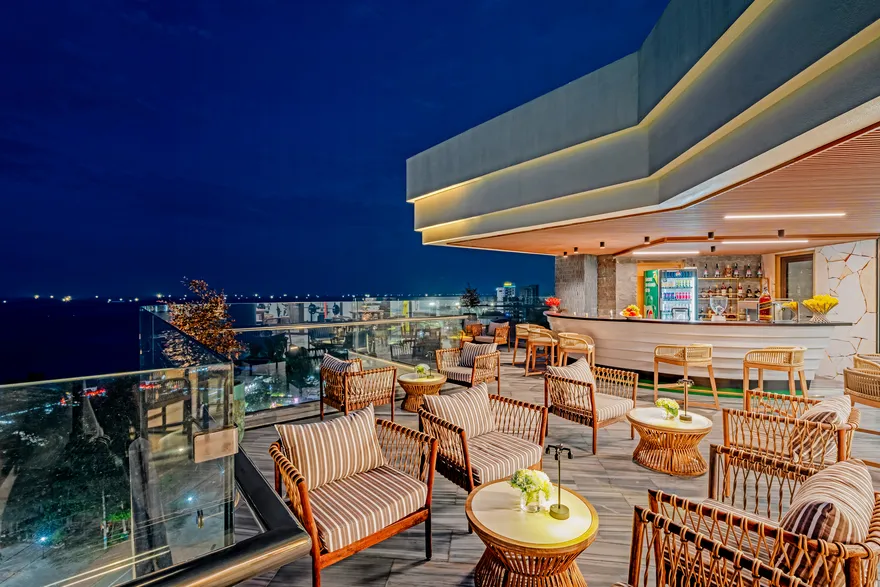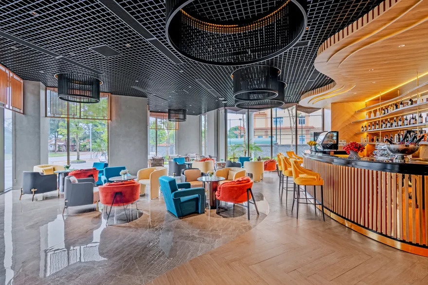 • Top Bar (Tầng thượng): Điểm ngắm toàn cảnh thành phố Đồng Hới và biển Nhật Lệ rực rỡ về đêm từ vị trí cao nhất khách sạn.