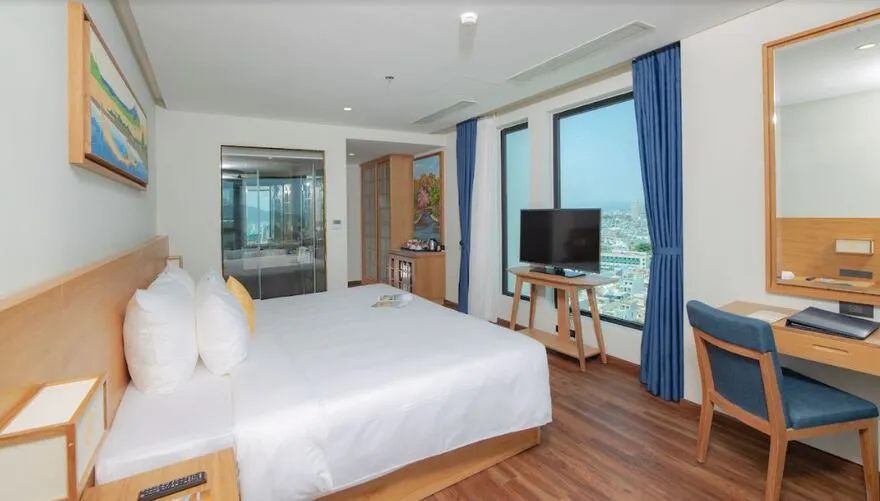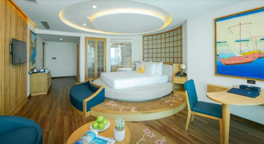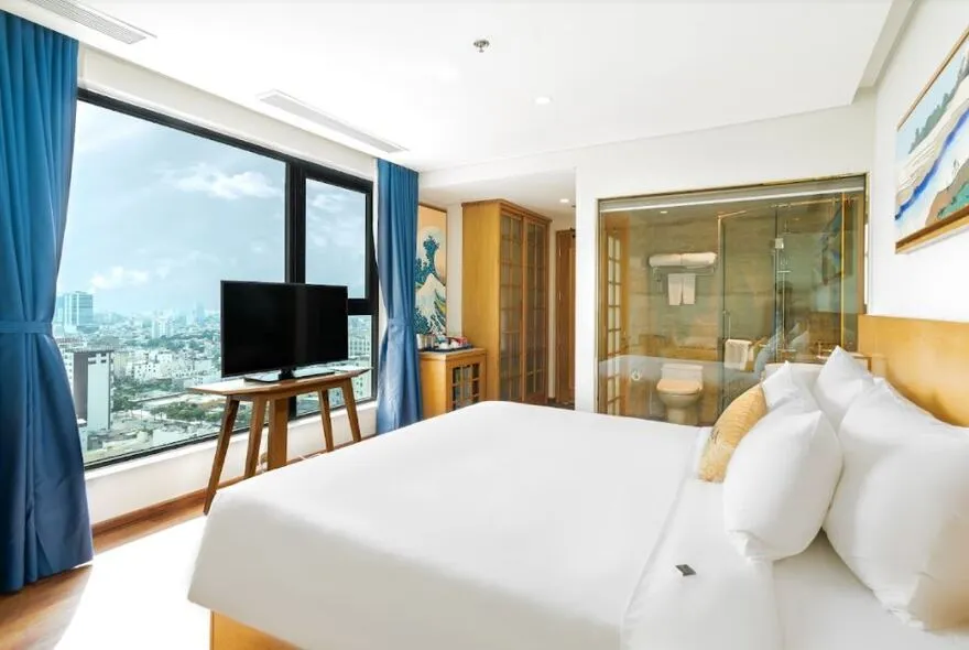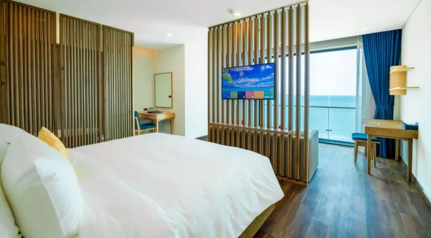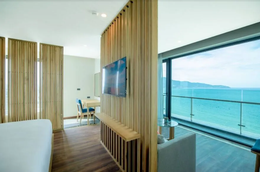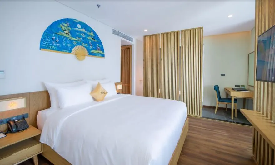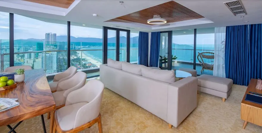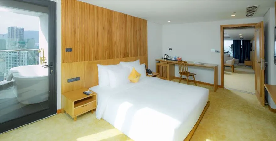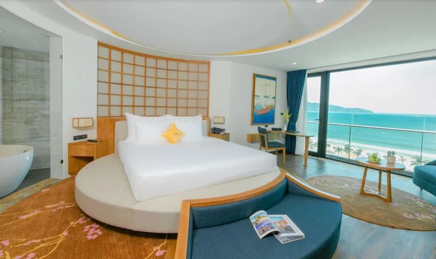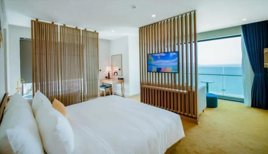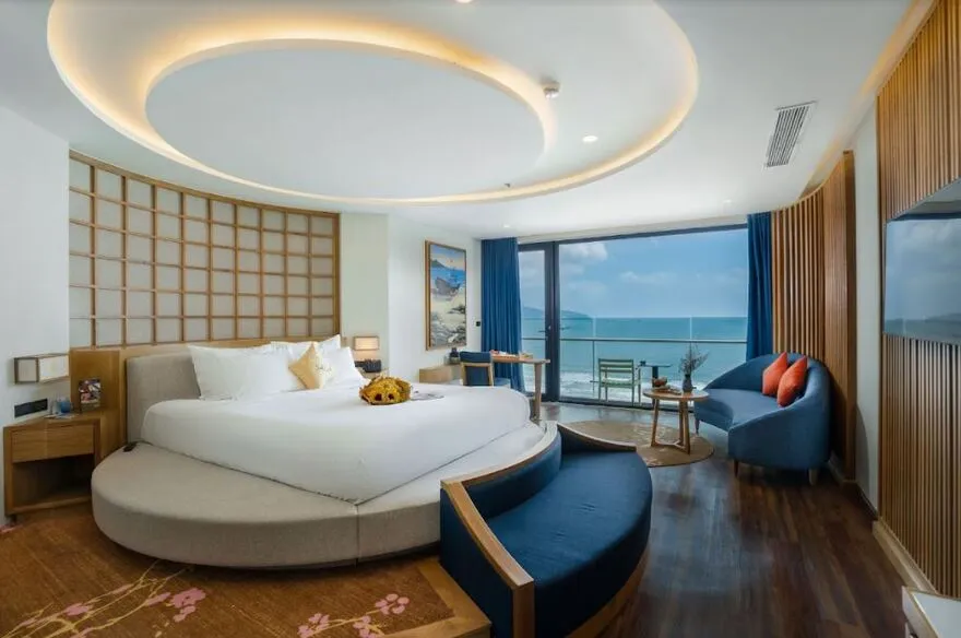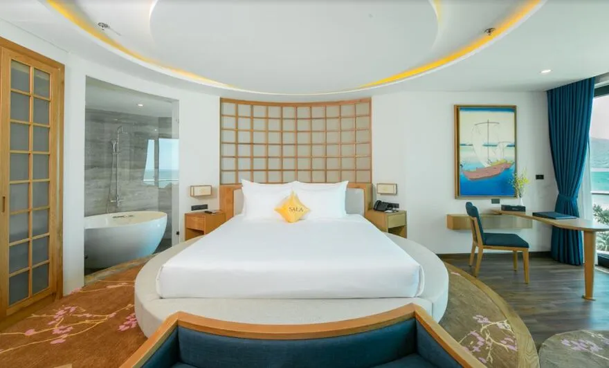 Tại đây, mỗi phòng nghỉ đều là một thiên đường thư giãn với triết lý thiết kế chú trọng vào sự thoải mái tối đa, trang bị giường Posturepedic đặc trưng cùng hệ thống gối đầu mềm mại để đảm bảo giấc ngủ trọn vẹn cho du khách. Hệ thống lưu trú được phân chia đa dạng từ hạng phòng Superior City View tinh gọn cho khách công tác, hạng Deluxe Sea View với ban công riêng hướng biển, đến Sala Suite lãng mạn có bồn tắm nằm sát khung cửa kính kịch trần. Đặc biệt, các căn hộ cao cấp Osaka và hạng phòng Presidential Suite với diện tích rộng lớn cùng đầy đủ tiện nghi bếp, máy giặt là lựa chọn hoàn hảo cho các gia đình hoặc những chuyến lưu trú dài ngày.