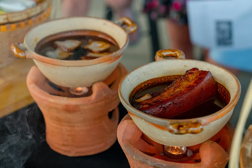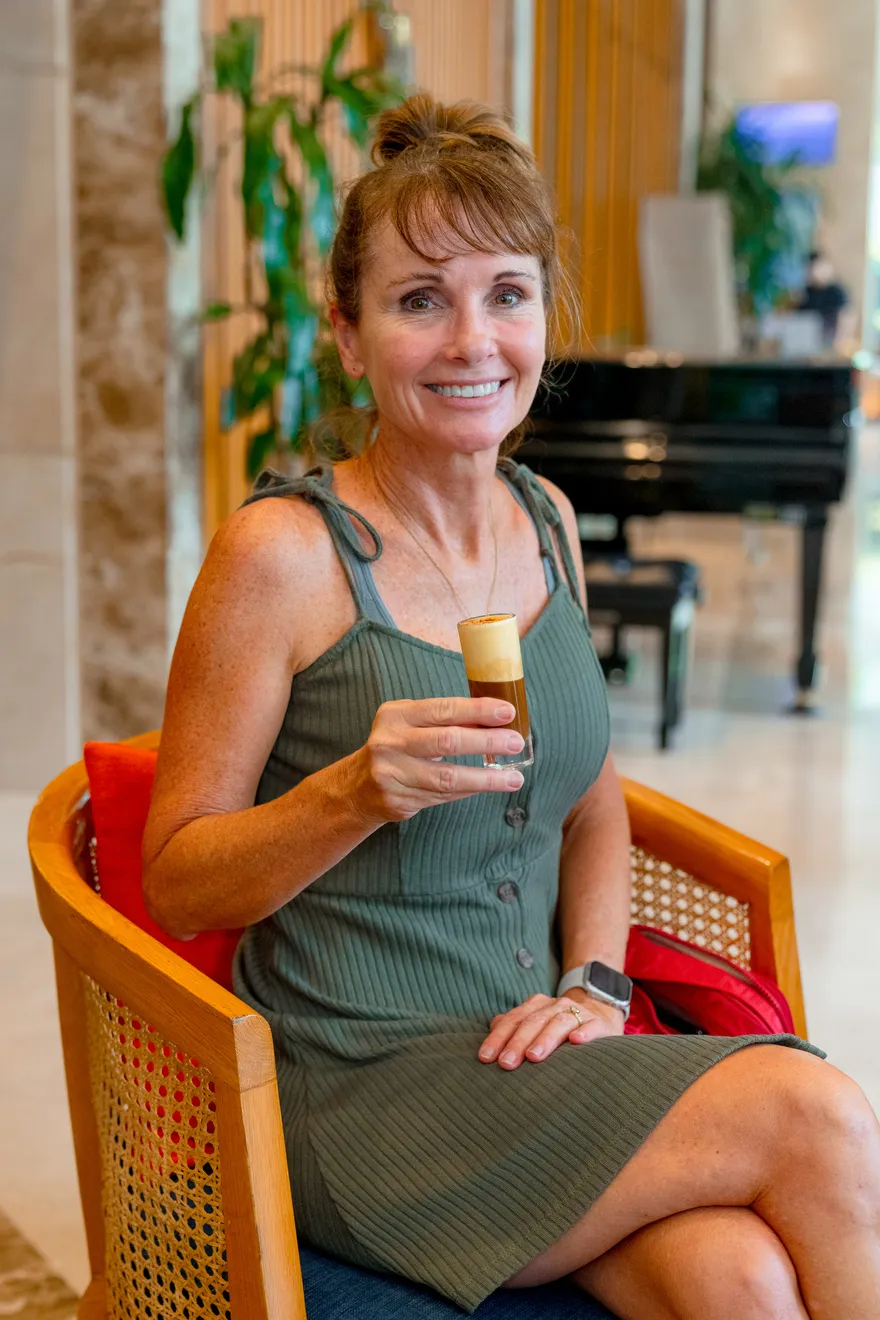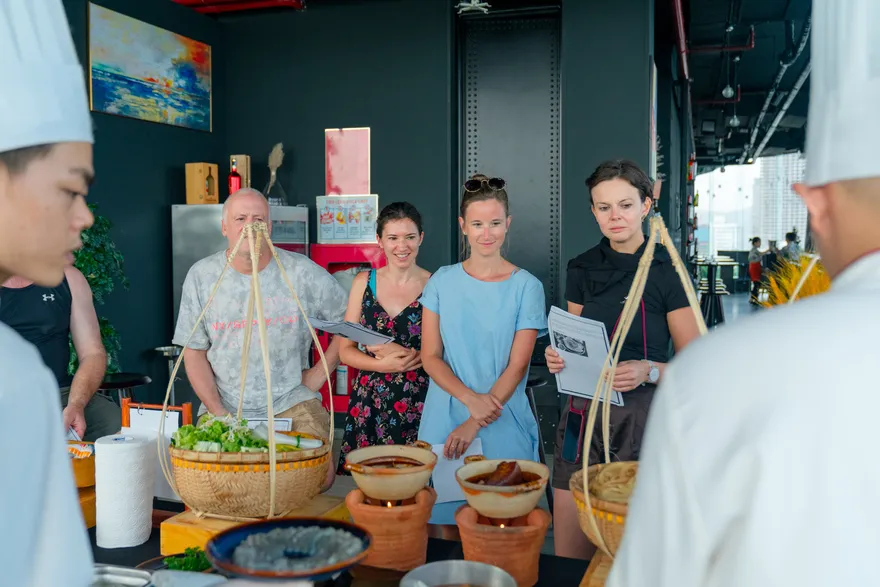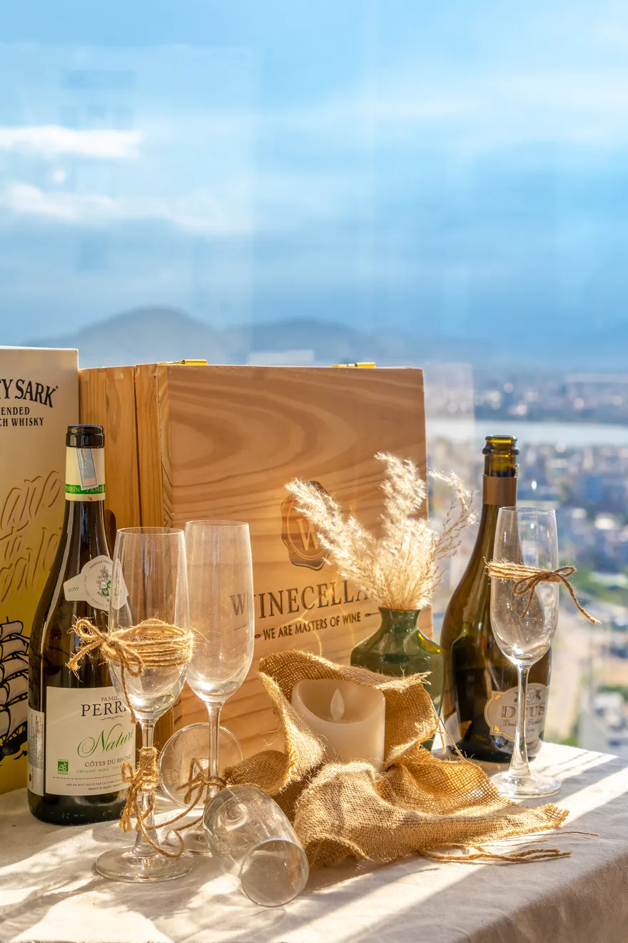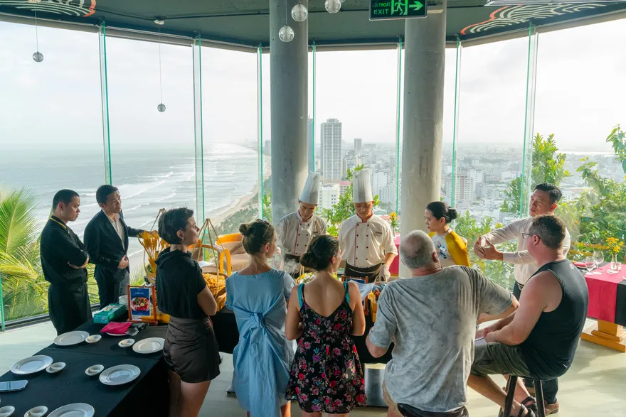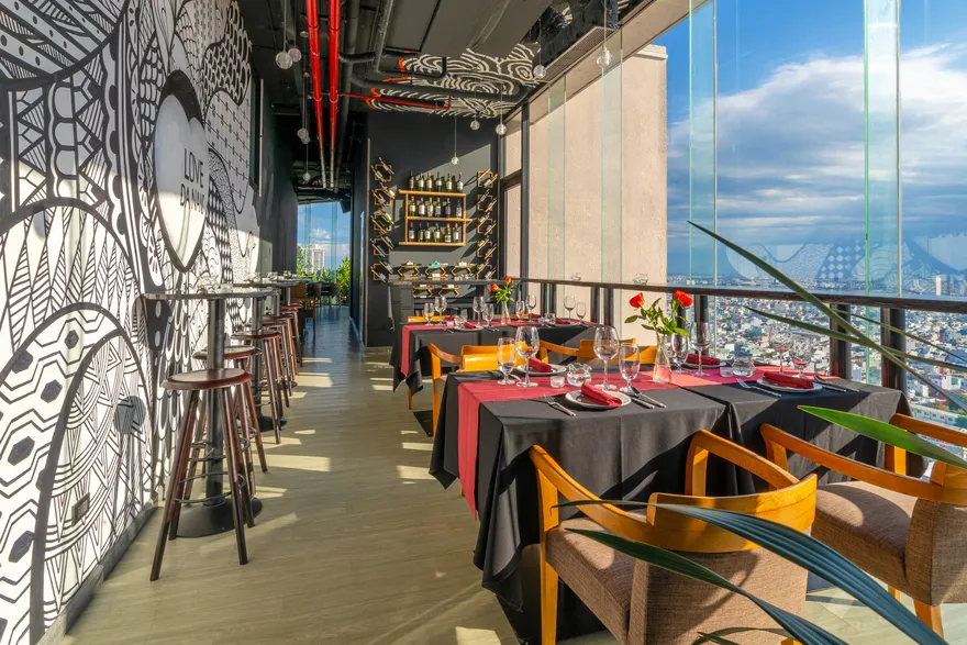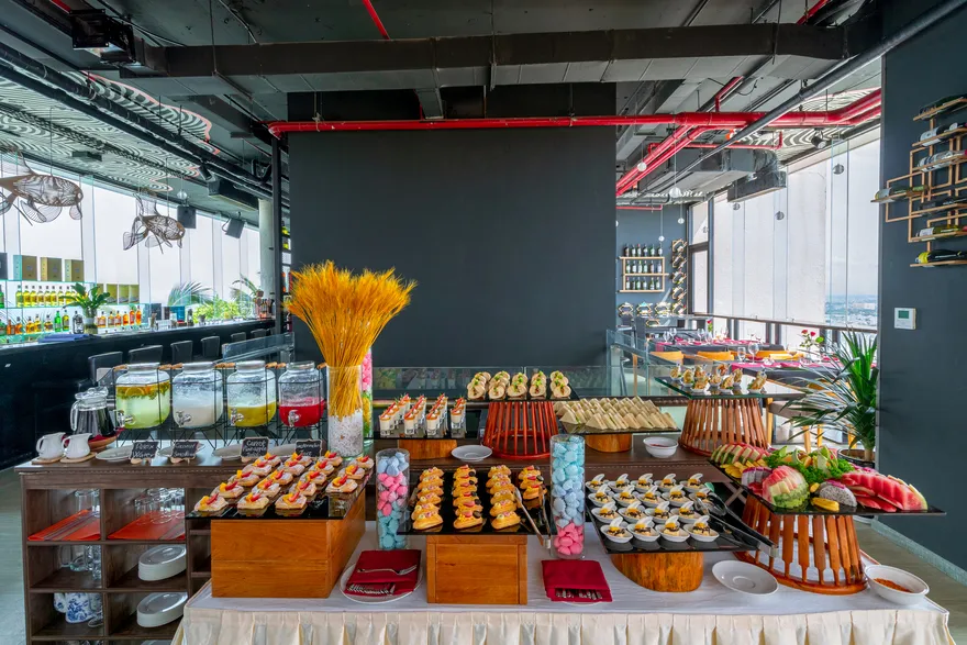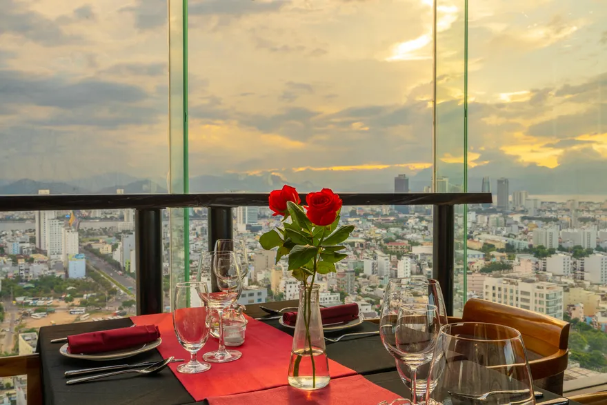 • Wine Lounge (Tầng 25): Ngay tại khách sạn, bạn có thể thưởng thức Set Menu Á Đông dành cho 2 người với các món đặc sản như Gà “Đèo Le” kho gừng hay Tôm rang muối Hong Kong trong không gian lãng mạn.