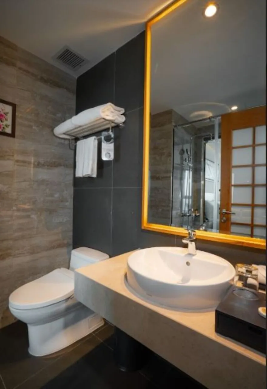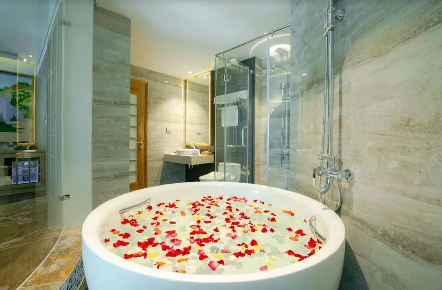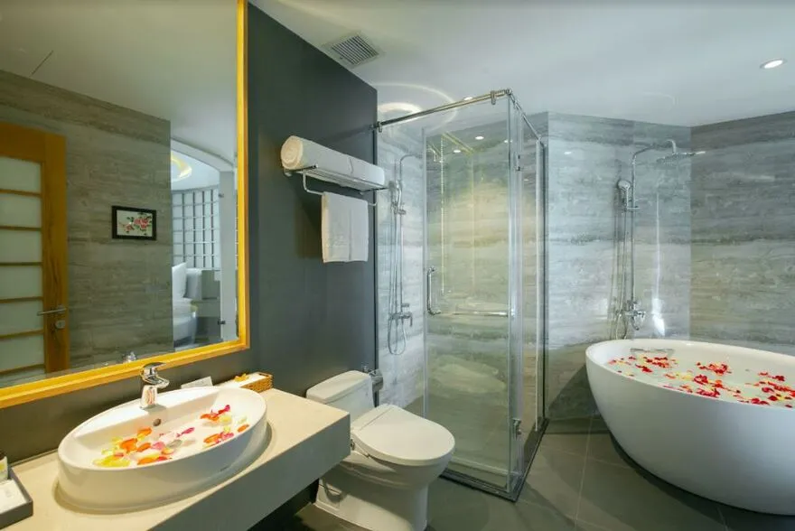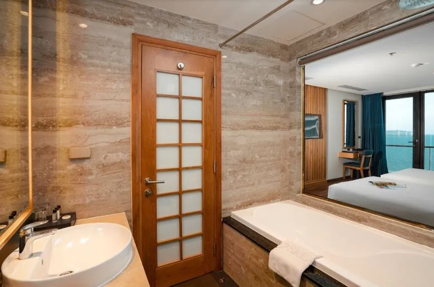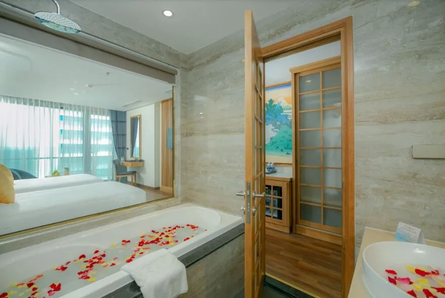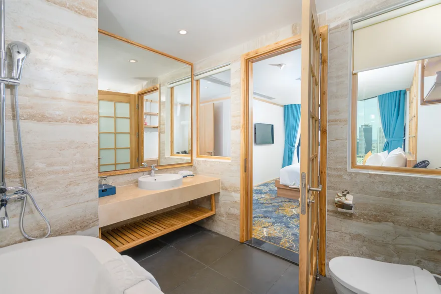 • Phòng có diện tích rộng rãi, được trang bị bồn tắm nằm (Bathtub) và ban công riêng (Balcony).