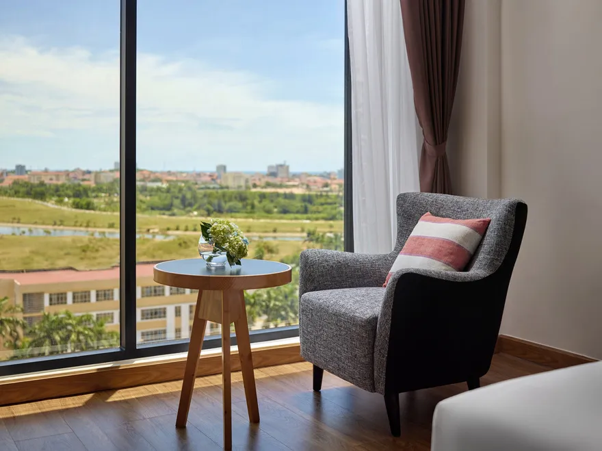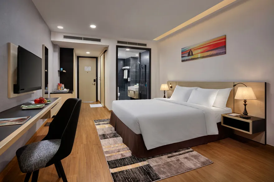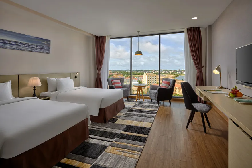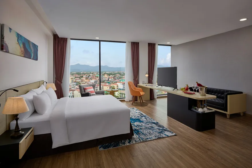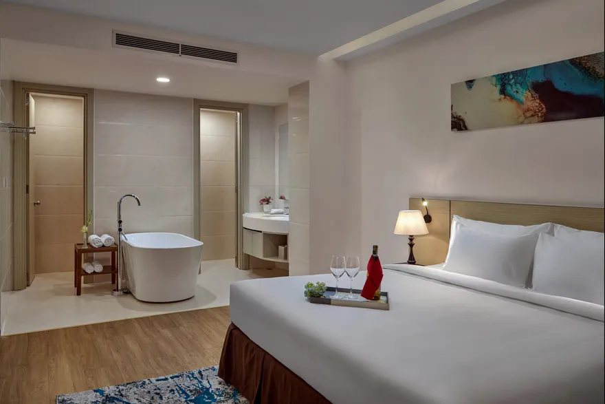 Về quy mô lưu trú, tòa tháp 13 tầng này cung cấp tổng cộng 153 phòng nghỉ được thiết kế theo phong cách đương đại, tinh tế. Hệ thống phòng tại đây vô cùng đa dạng, từ các hạng Deluxe rộng 30 – 32 m^2 dành cho cặp đôi, đến các hạng Premium Deluxe có bồn tắm nằm hay các căn Suite đẳng cấp rộng tới 70 m^2 dành cho doanh nhân. Đặc biệt, những gia đình lớn có thể lựa chọn hạng phòng Connecting hoặc Family với diện tích lên tới 101 m^2 ở các tầng cao để tận hưởng tầm nhìn bao quát thành phố và hướng biển tuyệt đẹp. Mỗi không gian nghỉ ngơi đều được đảm bảo chất lượng giấc ngủ tối ưu nhờ hệ thống cách âm đạt chuẩn và rèm cản sáng tuyệt đối, đi kèm trang thiết bị hiện đại như Smart TV, minibar và vòi sen mưa cao cấp.