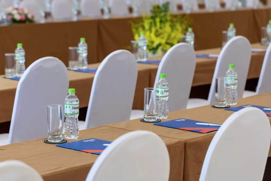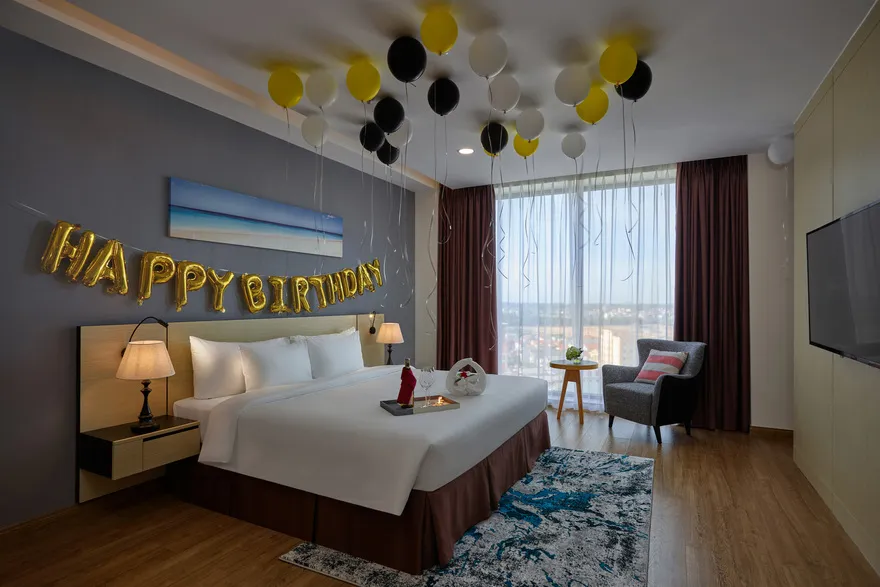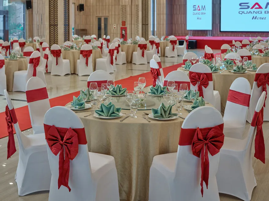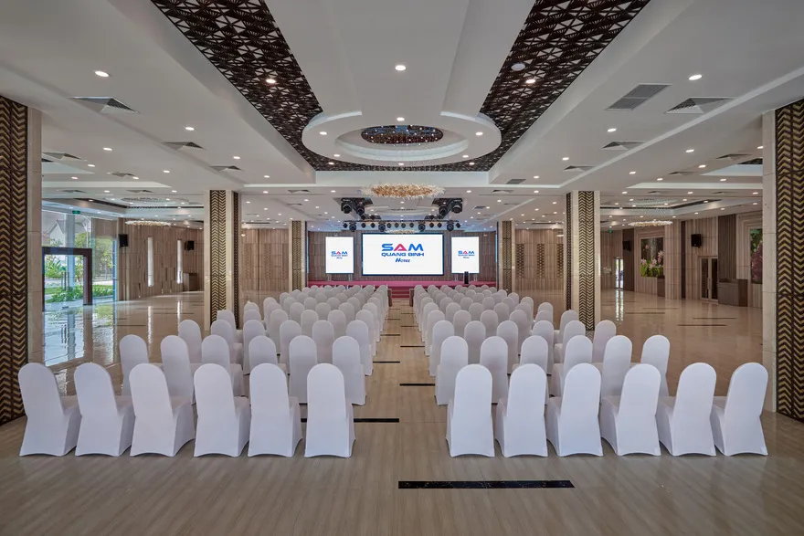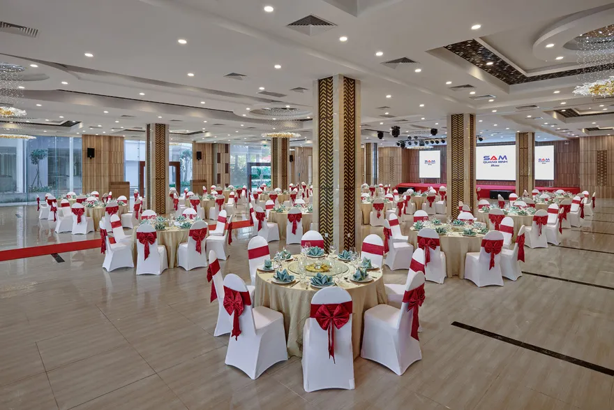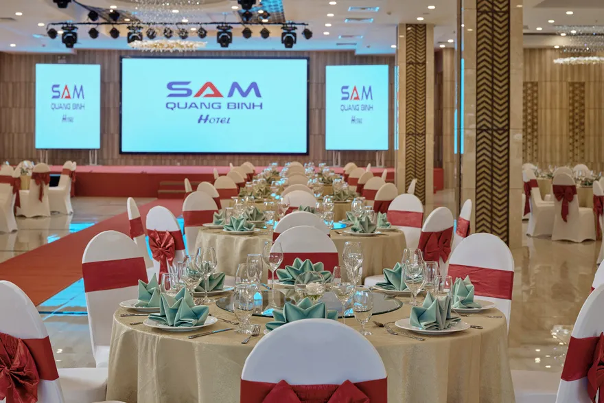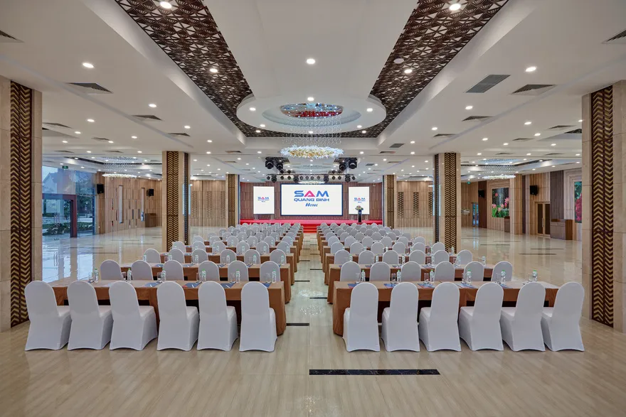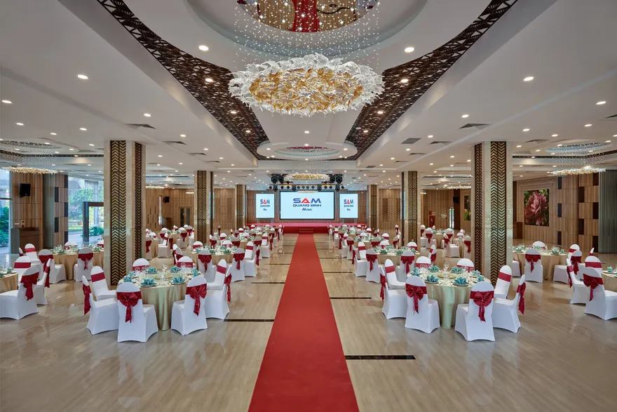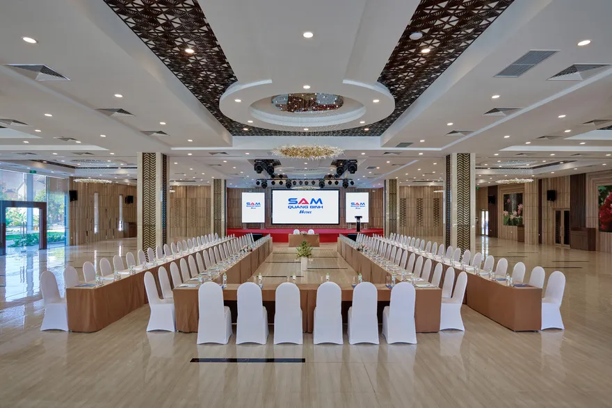 Đối với phân khúc khách hàng doanh nghiệp, hệ thống trung tâm hội nghị và tiệc cưới MICE tại đây được đầu tư cực kỳ bài bản với phòng Ballroom rộng 1.076 m^2 không cột và trần cao, có sức chứa lên đến gần 1.000 khách. Không gian sự kiện được trang bị đầy đủ màn hình LED, âm thanh và ánh sáng đạt chuẩn quốc tế, đảm bảo sự chuyên nghiệp cho mọi hội nghị hay tiệc cưới đẳng cấp. Bên cạnh đó, khách sạn còn áp dụng các chính sách ưu đãi linh hoạt cho trẻ em, dịch vụ đón tiễn sân bay bằng xe 5 chỗ đời mới và các gói chiết khấu khi đặt phòng sớm, khẳng định vị thế dẫn đầu trong ngành dịch vụ lưu trú tại địa phương.