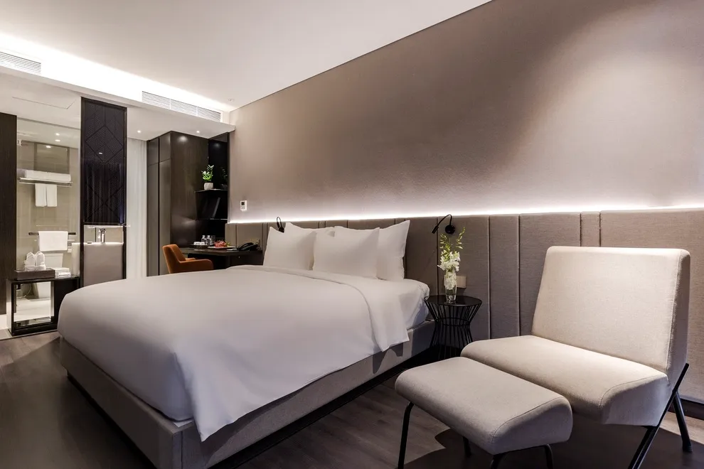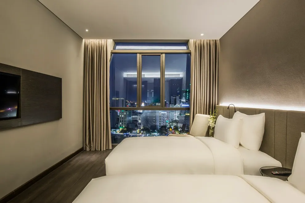 Bước vào bên trong, du khách sẽ được chào đón bởi không gian nội thất lấy cảm hứng từ vỏ sò và đại dương với ba tông màu chủ đạo: Xanh dương, Bạc và Đen. Quy mô 97 phòng nghỉ không quá đồ sộ giúp khách sạn tập trung tối đa vào trải nghiệm cá nhân hóa. Đối với khách công tác hoặc các cặp đôi muốn tiết kiệm chi phí, hạng phòng Superior (28m2) là lựa chọn nhập môn hợp lý, tuy nhiên cần lưu ý rằng hạng phòng này không kê được giường phụ. Nếu muốn một trải nghiệm thoáng đãng hơn, bạn nên cân nhắc nâng cấp lên hạng Deluxe Partial Seaview hoặc Premier (tầng cao) để tận hưởng thiết kế phòng tắm mở hiện đại và không gian yên tĩnh tách biệt khỏi tiếng ồn phố thị.