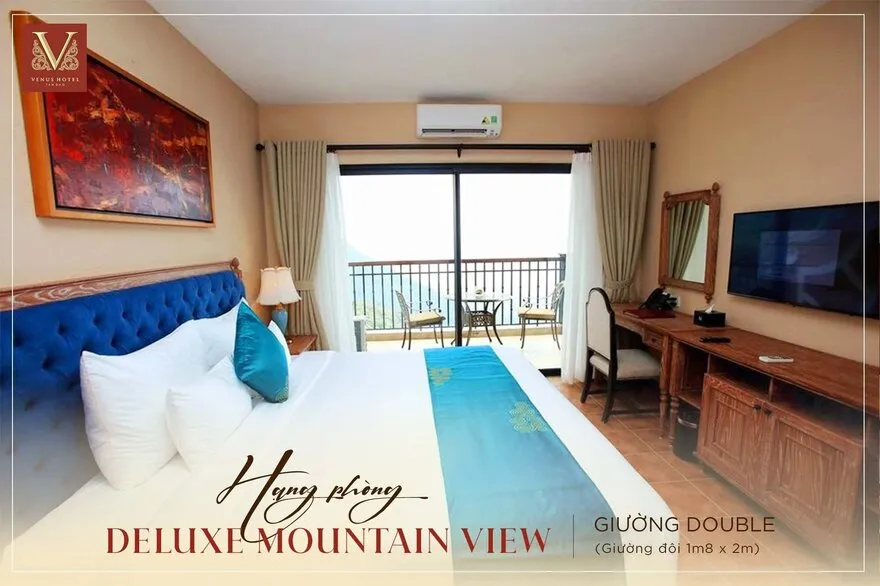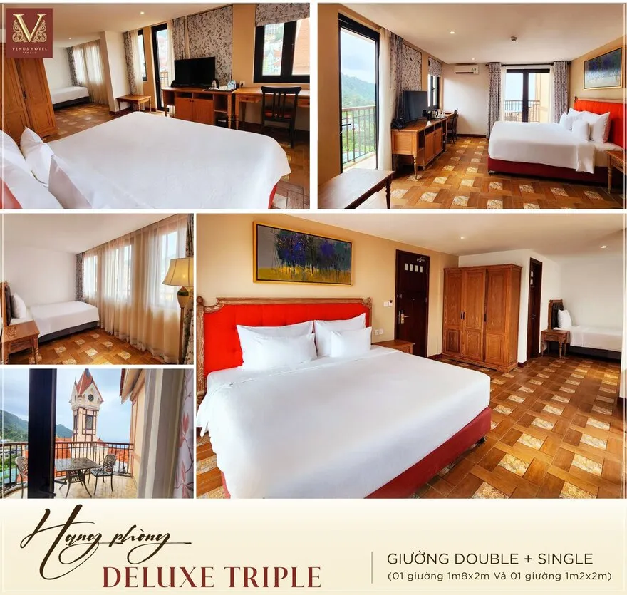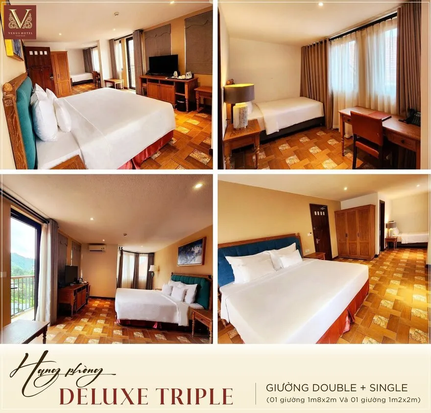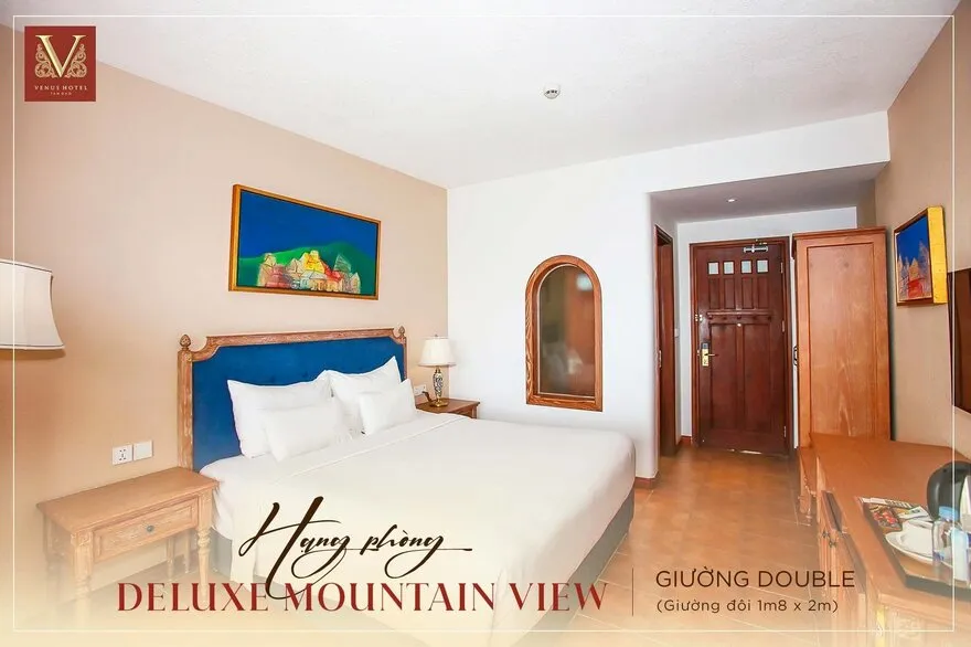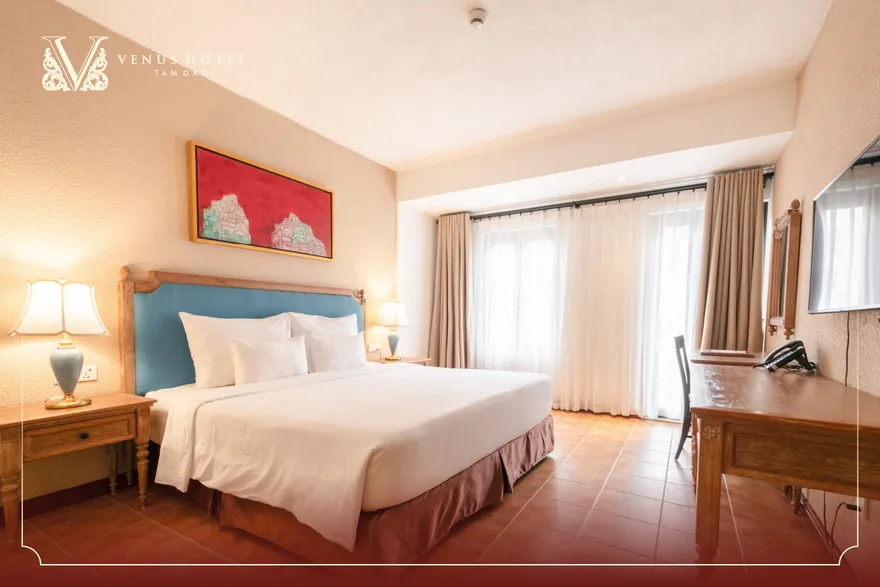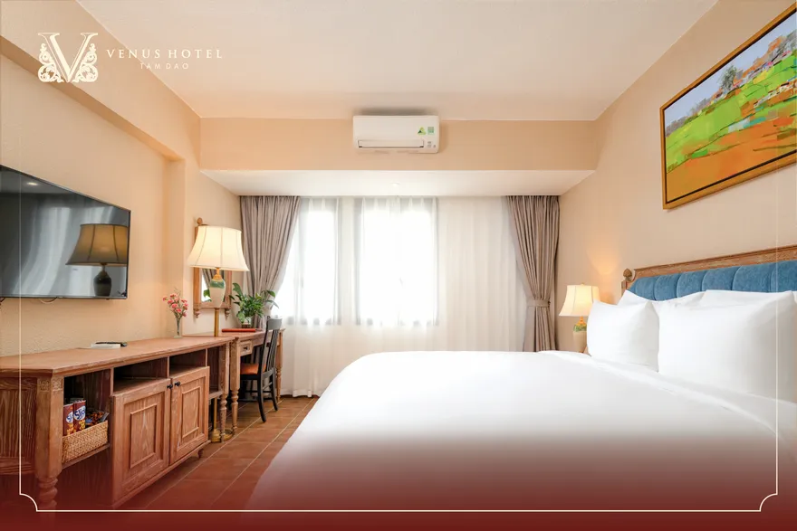 Để mang đến những trải nghiệm lưu trú đẳng cấp, Venus Hotel cung cấp hệ thống 196 phòng nghỉ được chia làm 08 hạng phòng khác nhau, đáp ứng trọn vẹn mọi nhu cầu từ các cặp đôi, gia đình đến các tổ chức doanh nghiệp. Du khách có thể lựa chọn các hạng phòng đa dạng như Superior hướng thành phố yên tĩnh, Deluxe Mountain View với tầm nhìn panorama hướng thung lũng, hay Deluxe Triple với không gian linh hoạt phù hợp cho nhóm bạn. Đối với những ai tìm kiếm không gian ấm cúng cho tổ ấm, hạng phòng Family Suite sở hữu ban công thoáng đạt là sự lựa chọn lý tưởng, trong khi Grand Suite mang đến đẳng cấp cao nhất với phòng khách riêng biệt và tầm nhìn bao trọn lâu đài Tam Đảo.