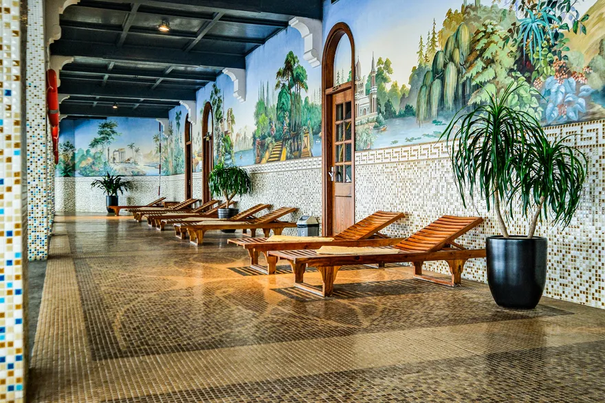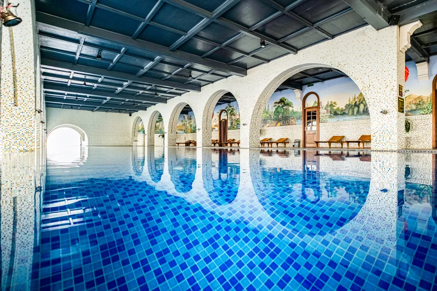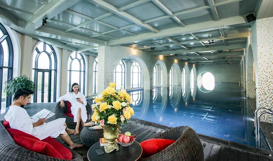 Các tiện ích thư giãn tại khách sạn được đầu tư bài bản để tái tạo năng lượng cho du khách trong suốt kỳ nghỉ. Điểm nhấn nổi bật nhất là bể bơi vô cực bốn mùa tọa lạc tại tầng 3 tòa V1 – V2, sở hữu lối kiến trúc La Mã độc đáo với hệ thống nước nóng quanh năm và góc chụp ảnh tràn bể ấn tượng hướng thẳng ra thung lũng. Ngoài ra, khu vực Spa & Gym tại tầng 2 với trang thiết bị hiện đại và không gian yên tĩnh sẽ giúp du khách thư giãn tuyệt đối và duy trì thói quen tập luyện. Đối với các gia đình, khu vui chơi trẻ em rực rỡ sắc màu tại tầng G tòa V6 và hệ thống 03 phòng Karaoke hiện đại tại tòa V7 với sức chứa lên tới 40 người là những không gian giải trí không thể bỏ lỡ.