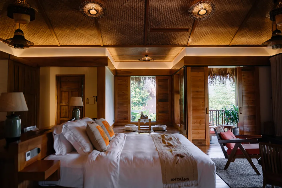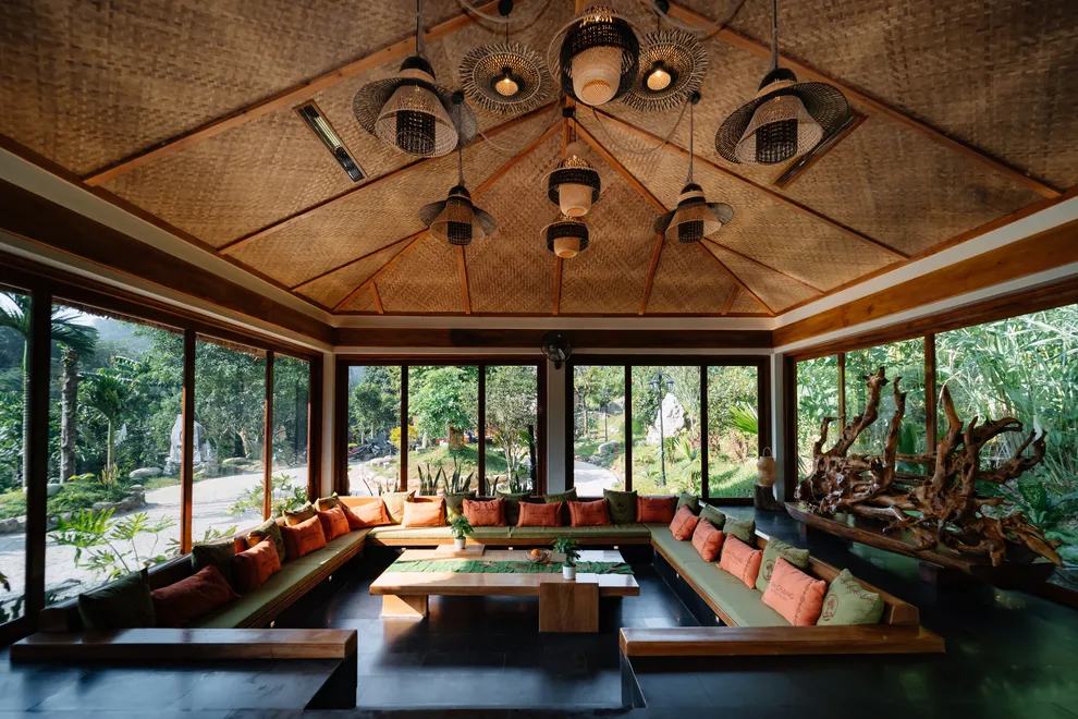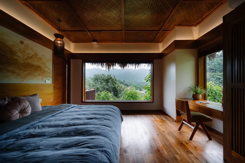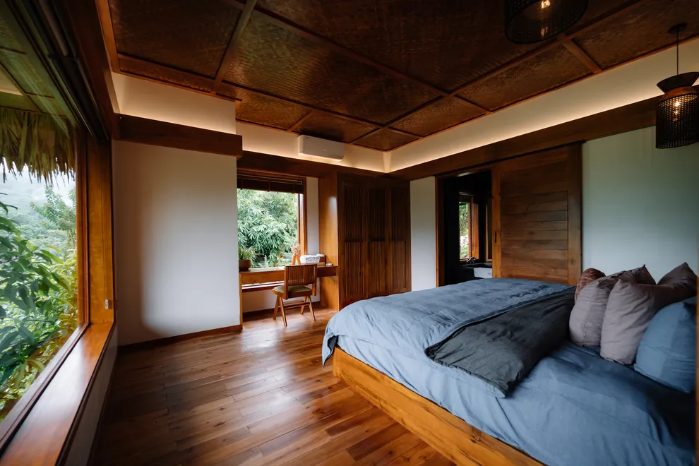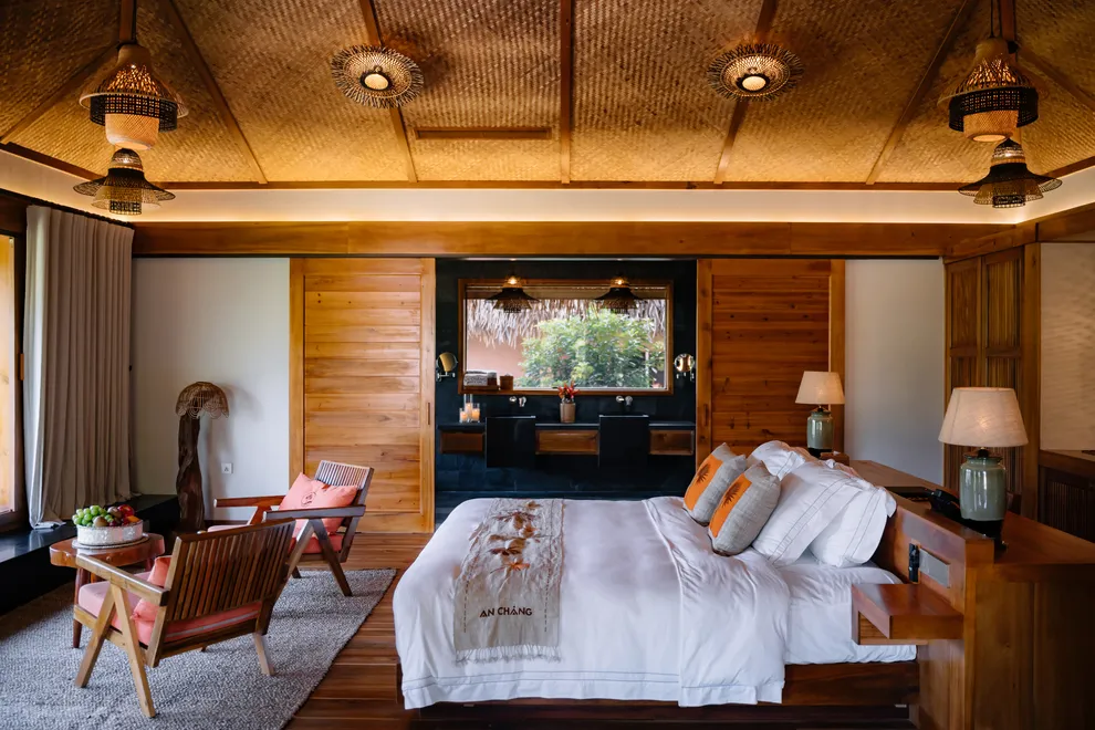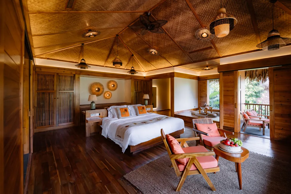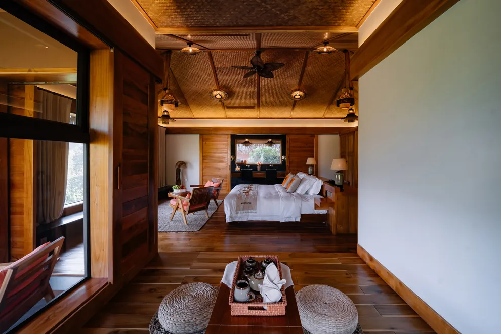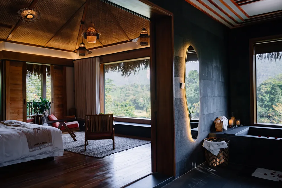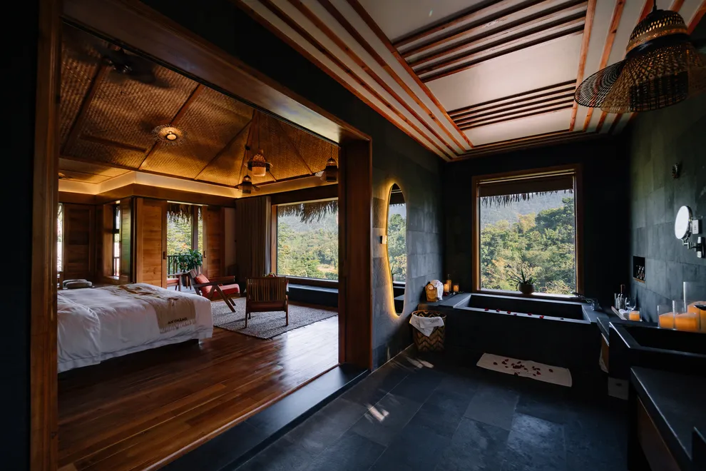 Triết lý kiến trúc “Vernacular Modernism” tại đây mang thông điệp về một nơi hạt giống niềm vui và tình yêu được gieo mầm. Các công trình sử dụng vật liệu tự nhiên như gỗ pơ-mu, lá cọ và tre nứa để tạo nên những không gian “biết thở”, hòa nhập hoàn toàn vào hệ sinh thái rừng nhiệt đới. Mỗi căn villa được ví như một kén lụa sang trọng, nơi du khách có thể lắng nghe tiếng suối chảy từ ban công riêng và tận hưởng sự thư thái nhờ thiết kế mái cọ dốc cách nhiệt. Nội thất phòng nghỉ còn chú trọng đến trải nghiệm giác quan với bồn tắm sục Jacuzzi làm từ gỗ pơ-mu tỏa hương thơm tự nhiên.