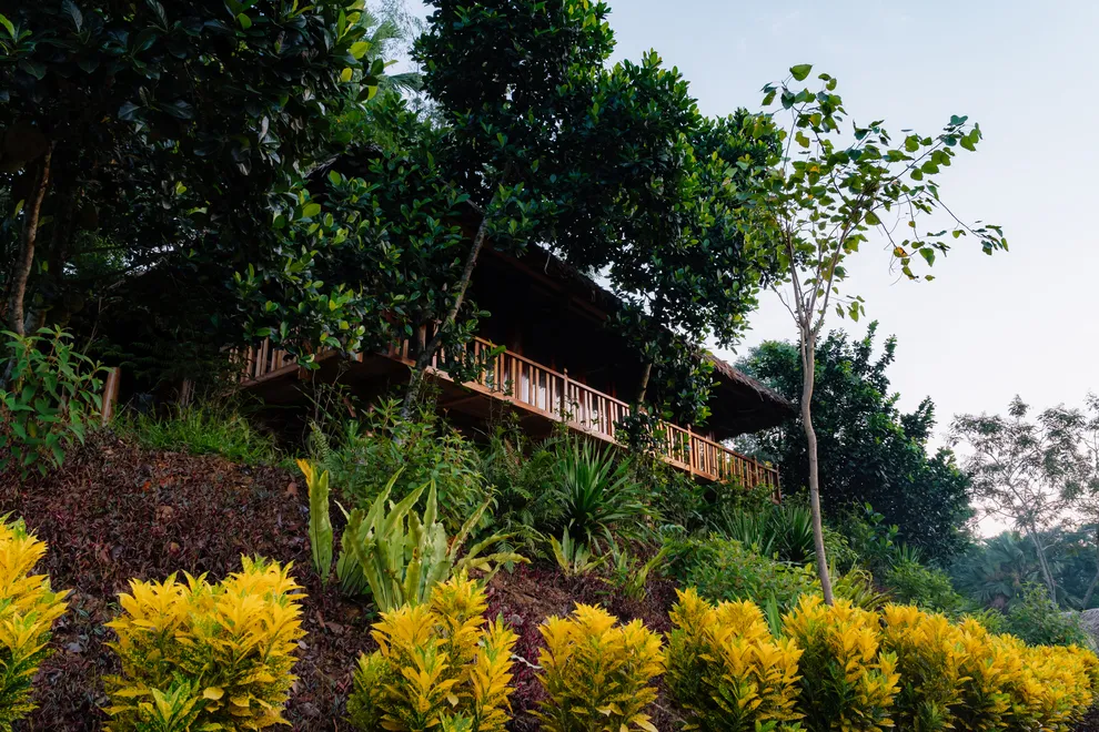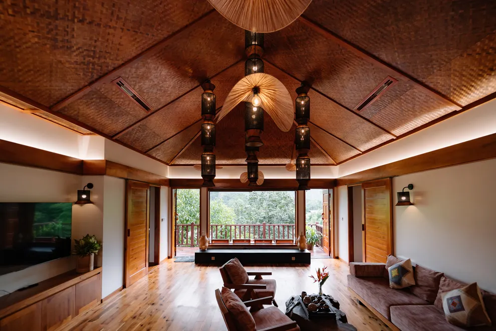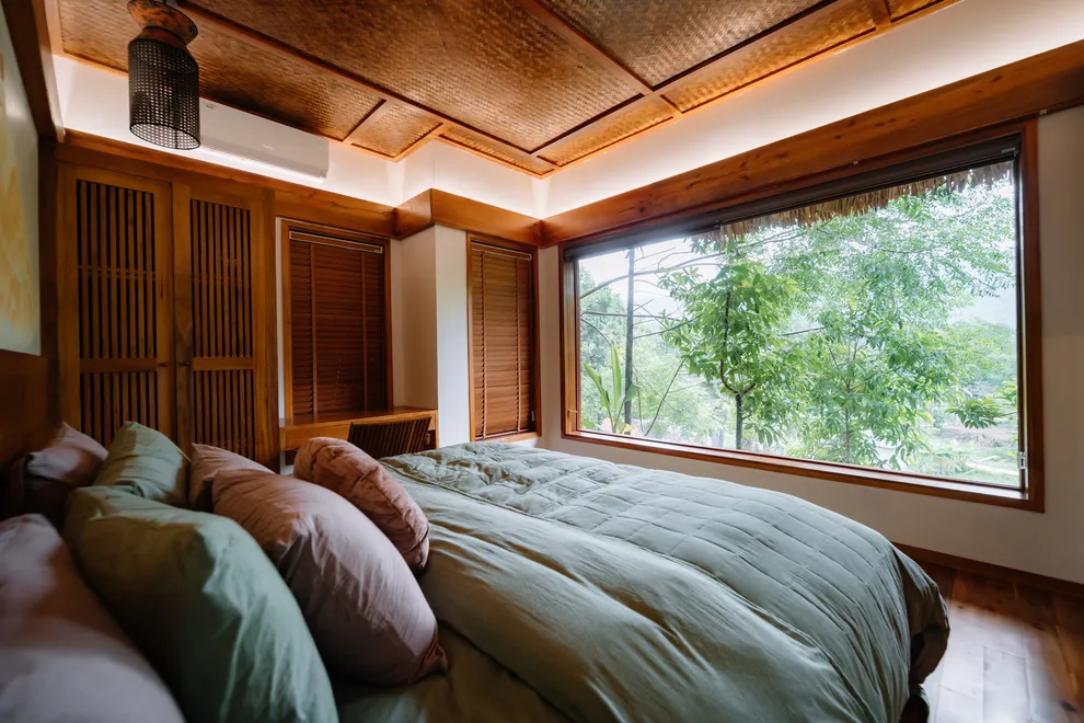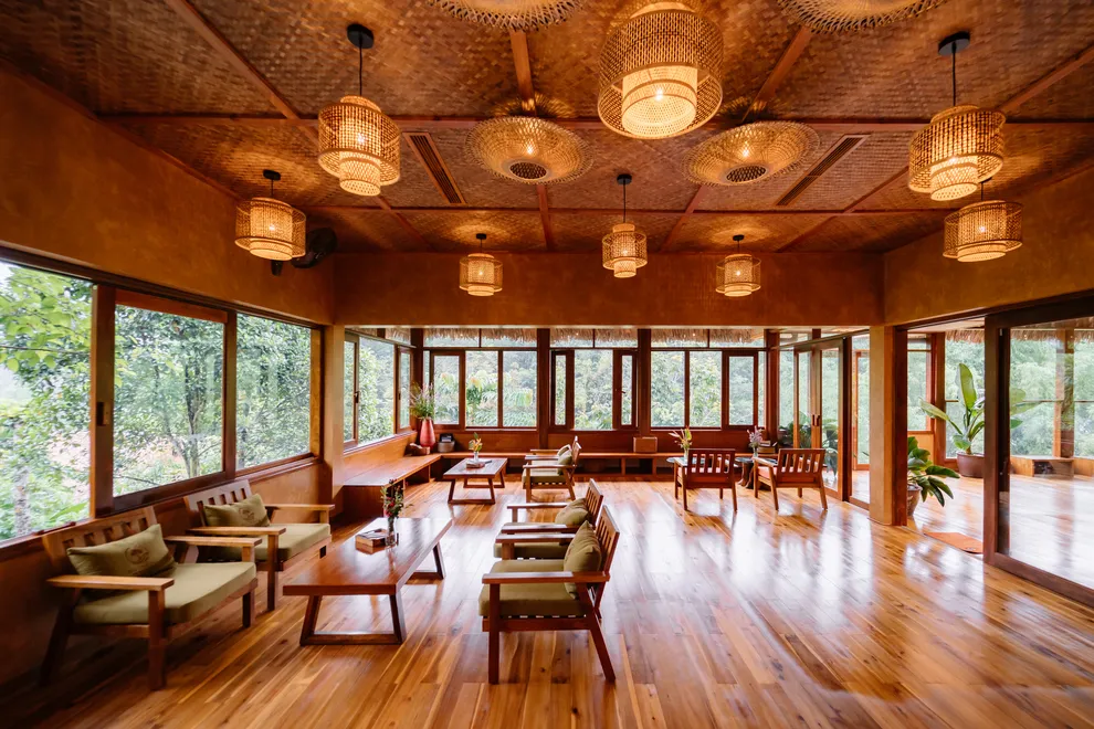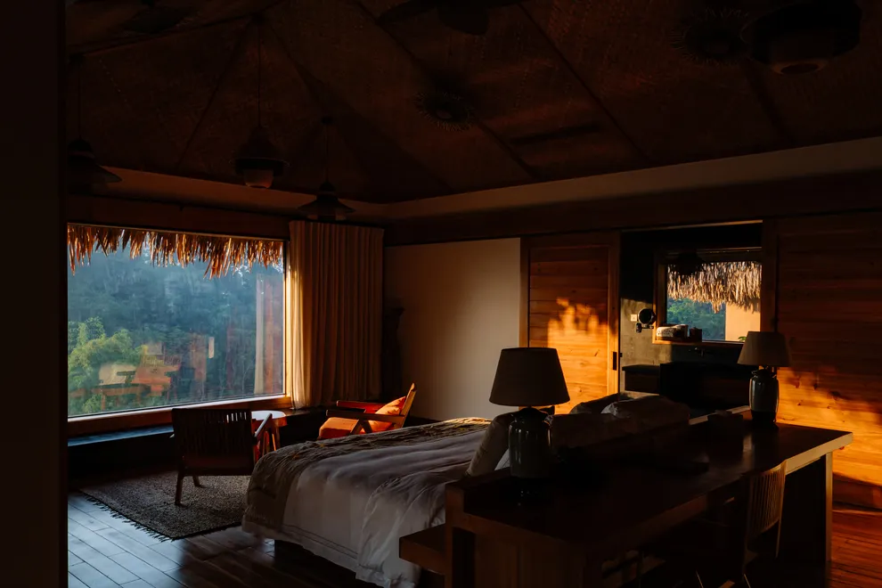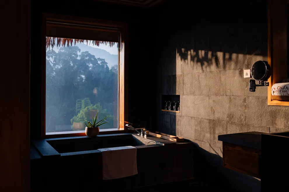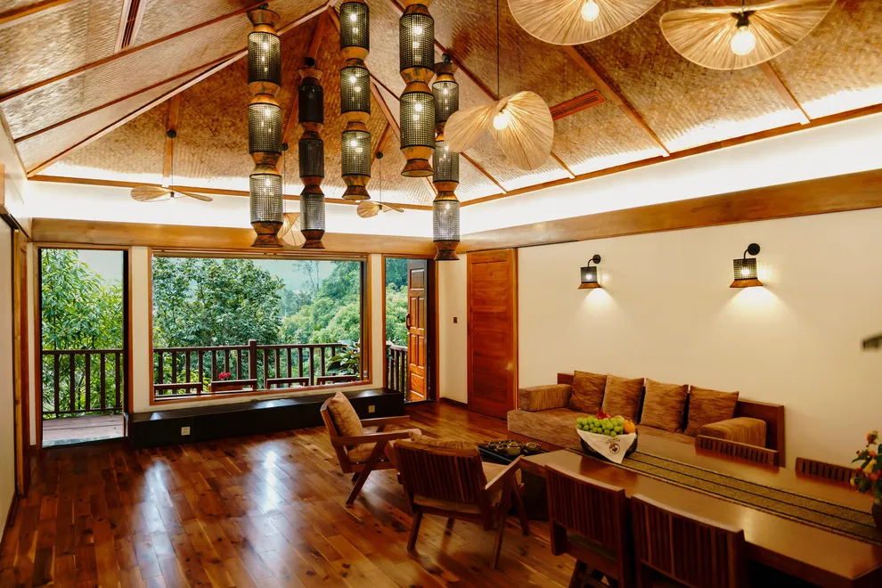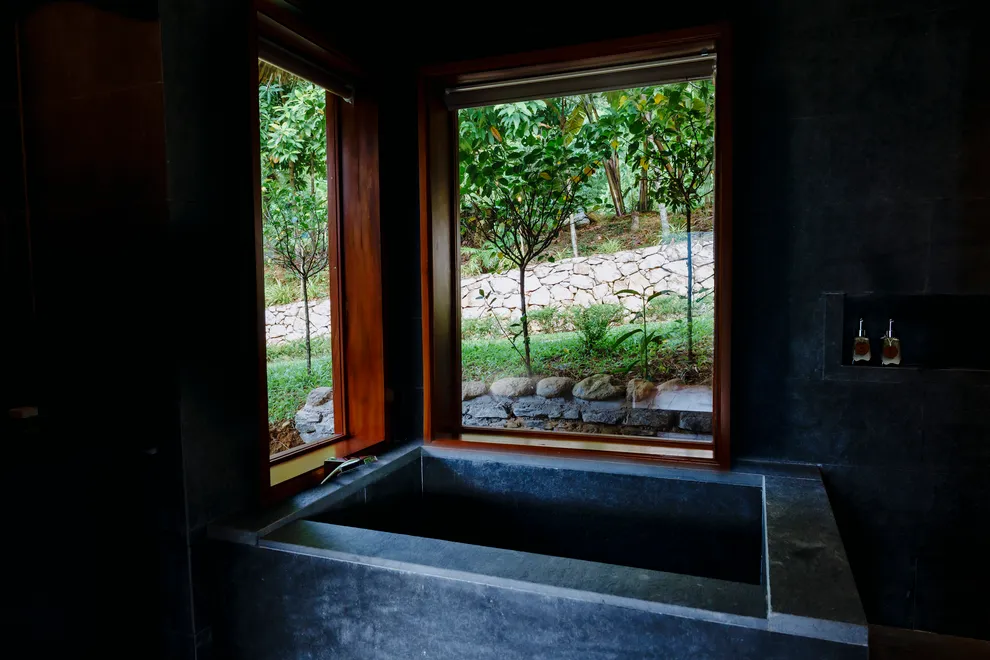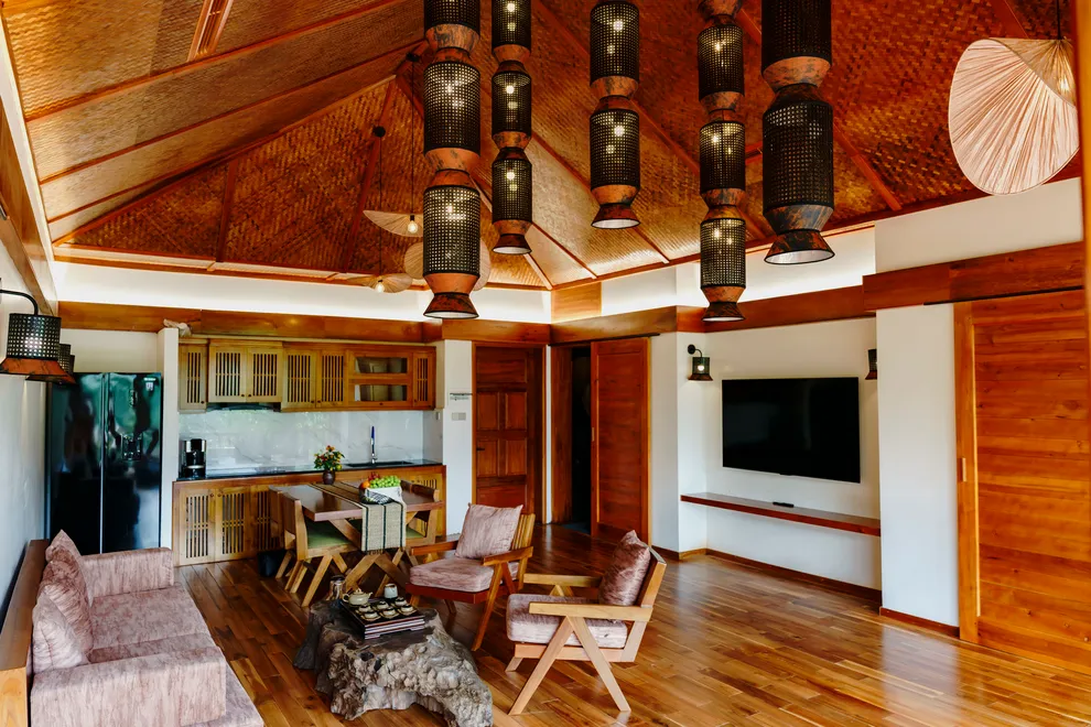 Triết lý kiến trúc “Vernacular Modernism” tại đây mang thông điệp về một nơi hạt giống niềm vui và tình yêu được gieo mầm. Các công trình sử dụng vật liệu tự nhiên như gỗ pơ-mu, lá cọ và tre nứa để tạo nên những không gian “biết thở”, hòa nhập hoàn toàn vào hệ sinh thái rừng nhiệt đới. Mỗi căn villa được ví như một kén lụa sang trọng, nơi du khách có thể lắng nghe tiếng suối chảy từ ban công riêng và tận hưởng sự thư thái nhờ thiết kế mái cọ dốc cách nhiệt. Nội thất phòng nghỉ còn chú trọng đến trải nghiệm giác quan với bồn tắm sục Jacuzzi làm từ gỗ pơ-mu tỏa hương thơm tự nhiên.