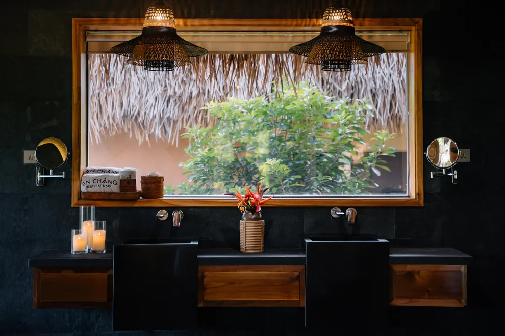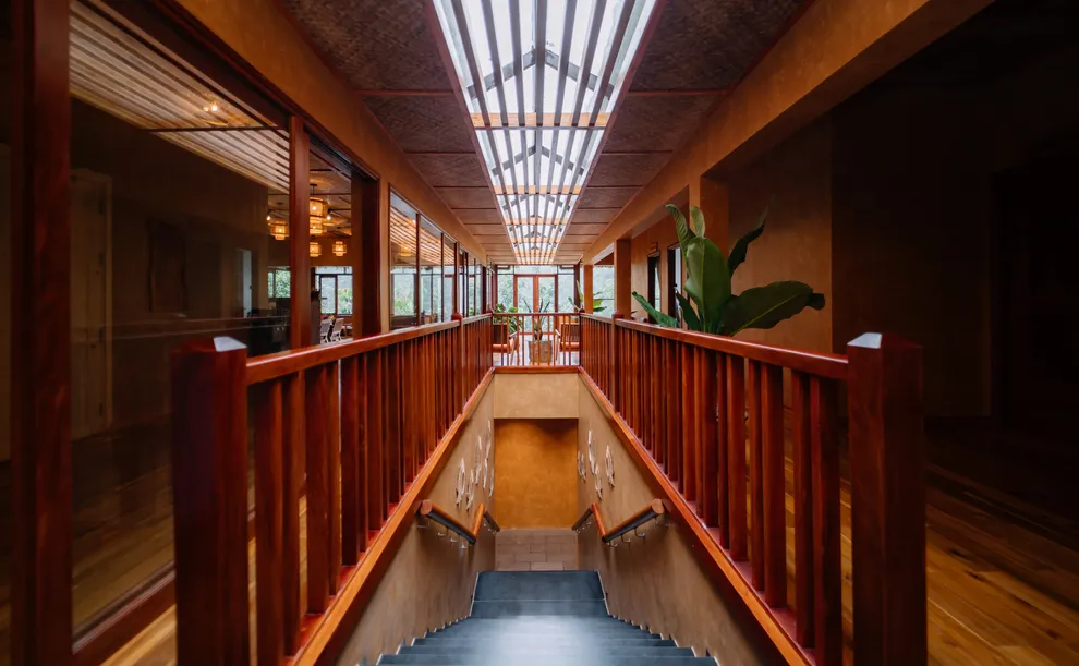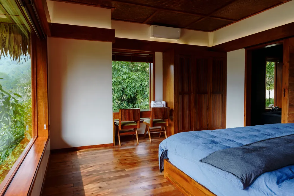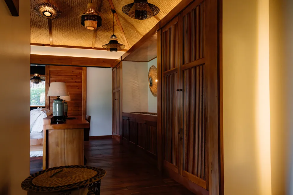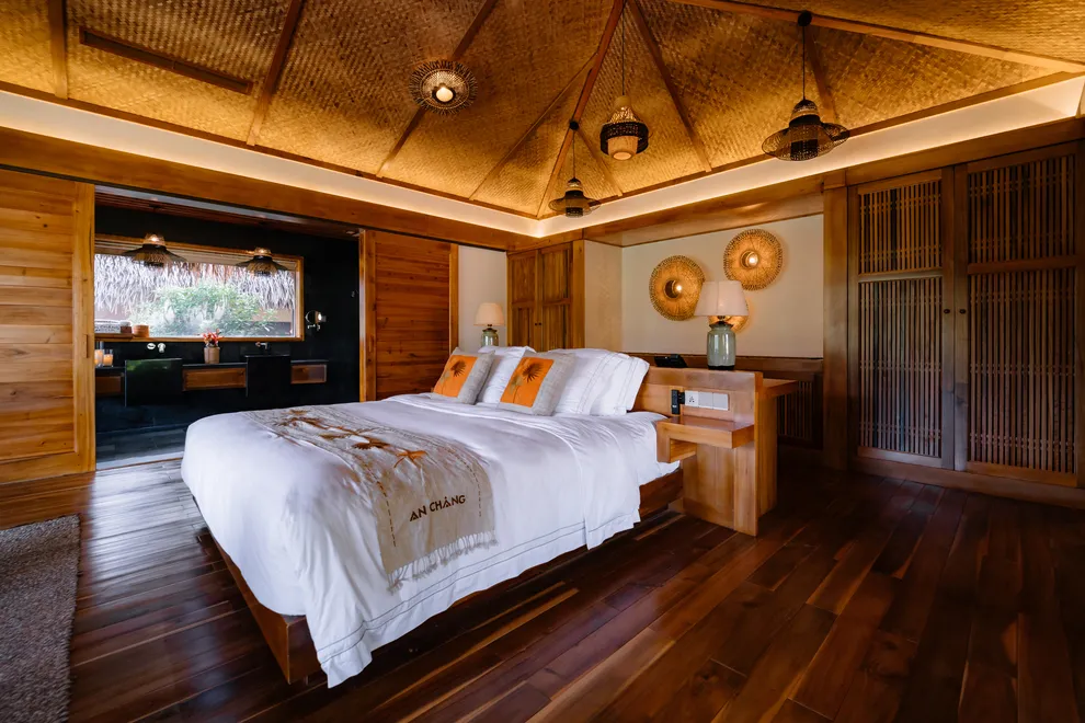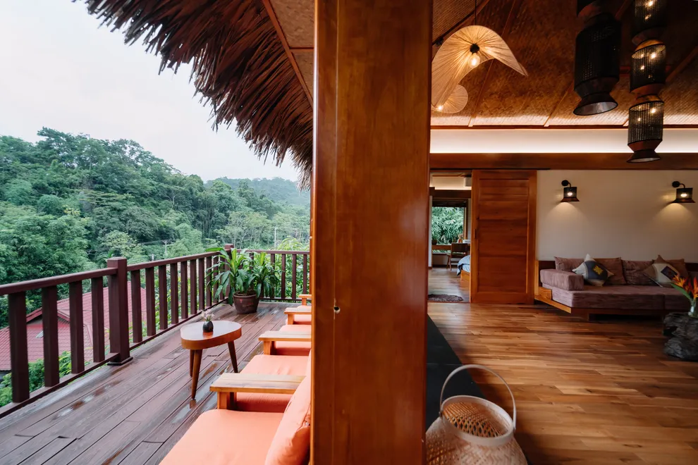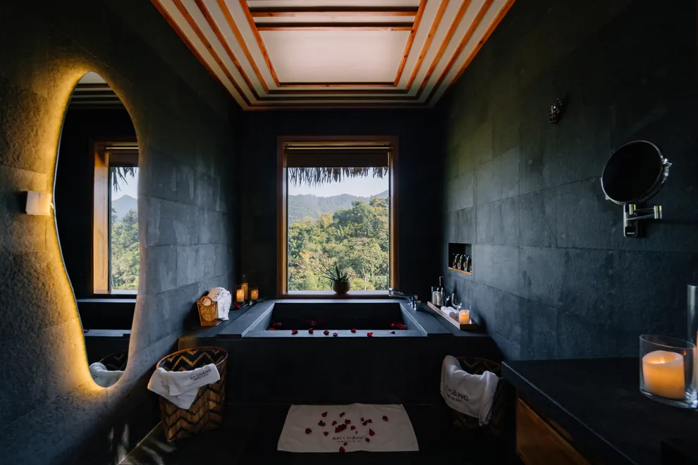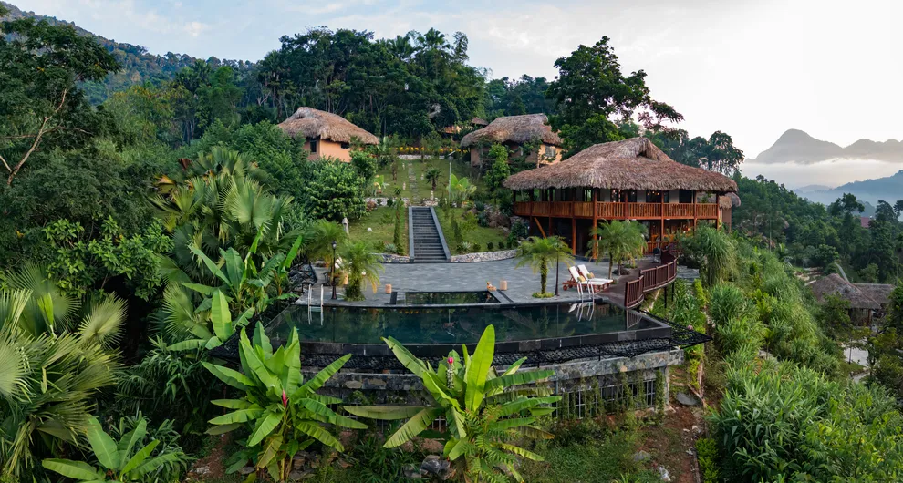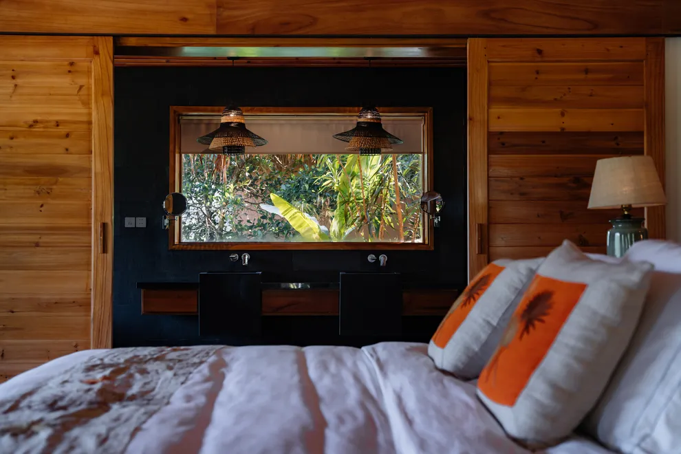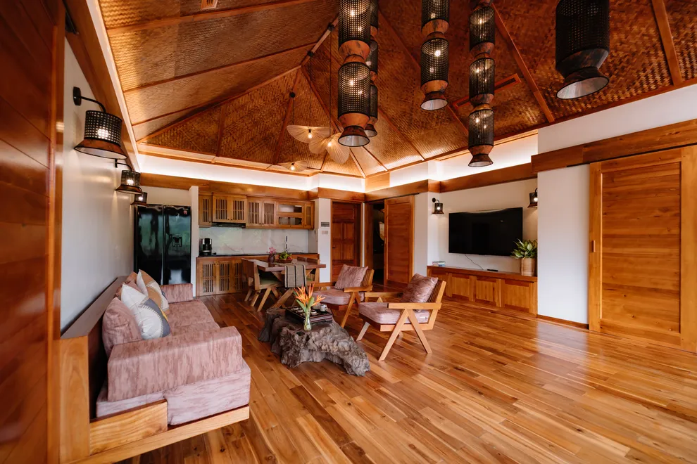 Triết lý kiến trúc “Vernacular Modernism” tại đây mang thông điệp về một nơi hạt giống niềm vui và tình yêu được gieo mầm. Các công trình sử dụng vật liệu tự nhiên như gỗ pơ-mu, lá cọ và tre nứa để tạo nên những không gian “biết thở”, hòa nhập hoàn toàn vào hệ sinh thái rừng nhiệt đới. Mỗi căn villa được ví như một kén lụa sang trọng, nơi du khách có thể lắng nghe tiếng suối chảy từ ban công riêng và tận hưởng sự thư thái nhờ thiết kế mái cọ dốc cách nhiệt. Nội thất phòng nghỉ còn chú trọng đến trải nghiệm giác quan với bồn tắm sục Jacuzzi làm từ gỗ pơ-mu tỏa hương thơm tự nhiên.