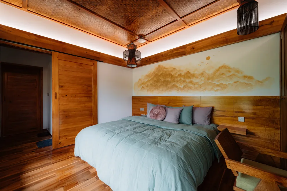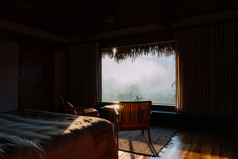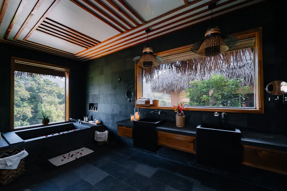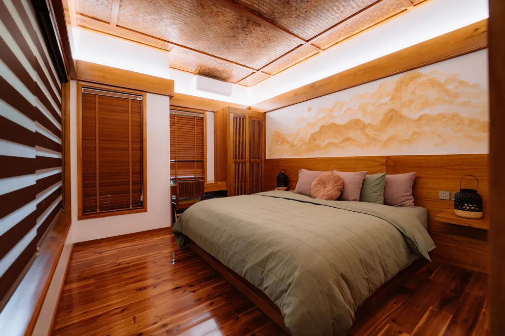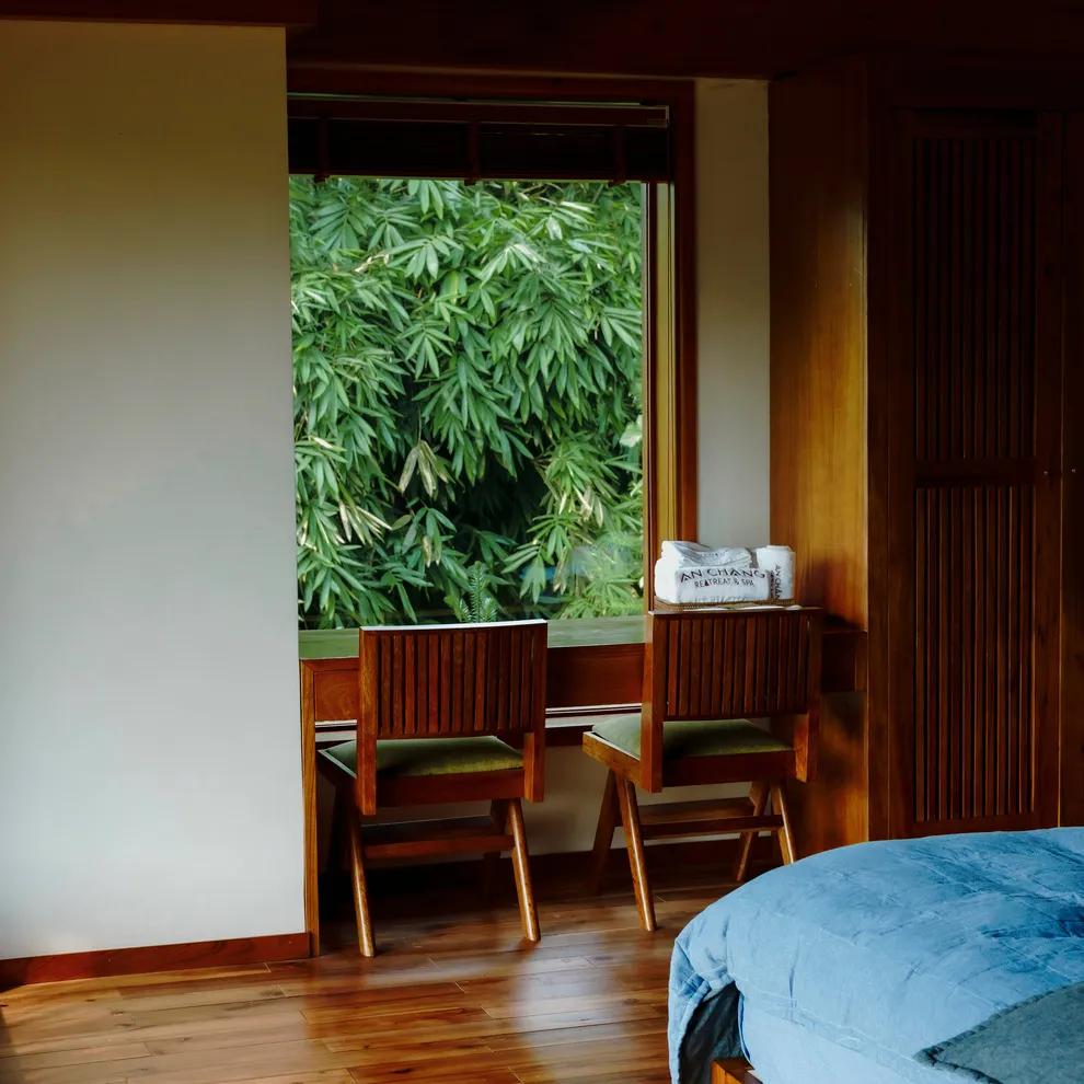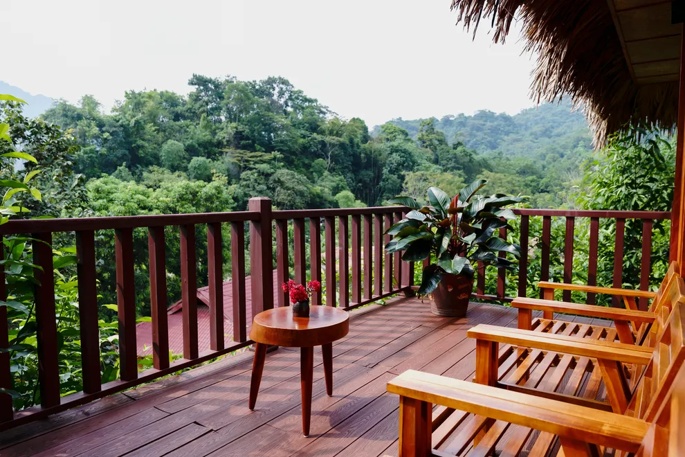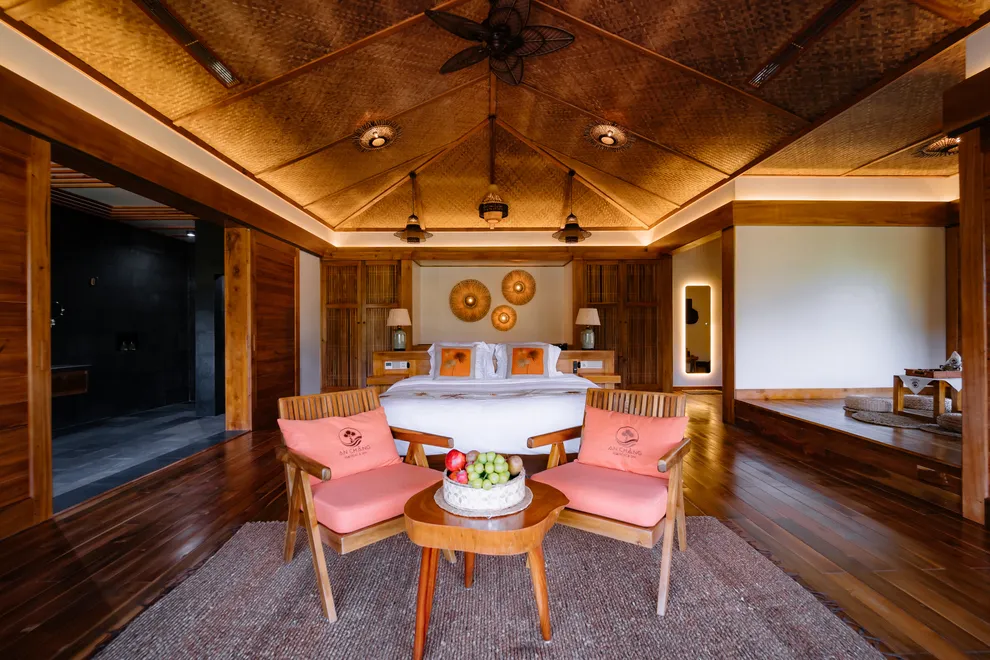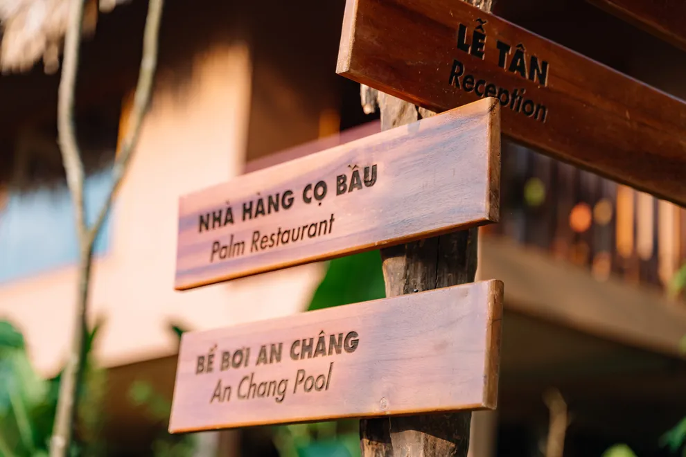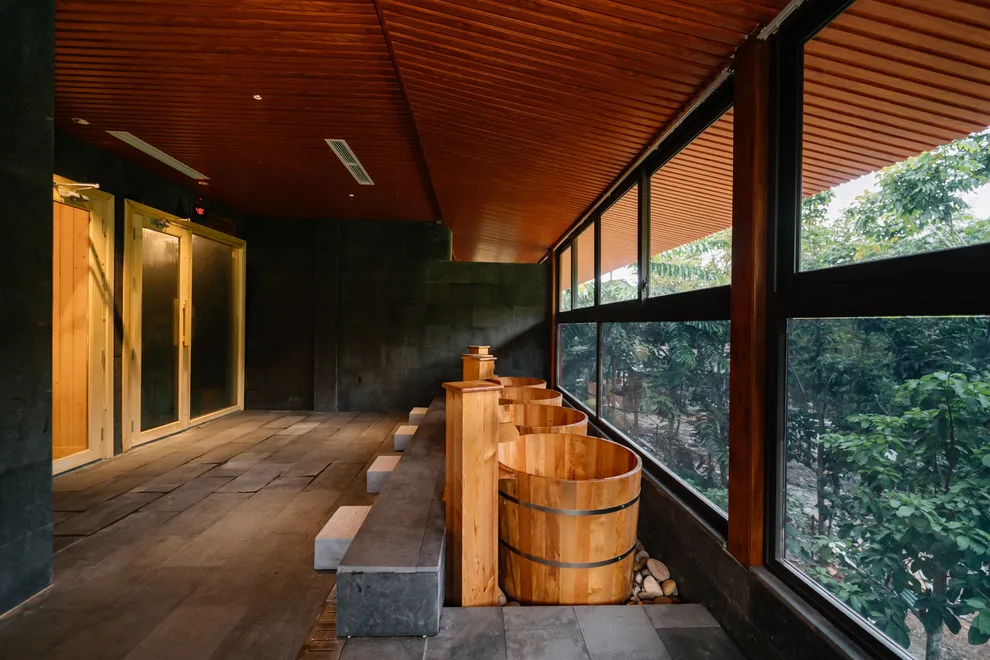 Triết lý kiến trúc “Vernacular Modernism” tại đây mang thông điệp về một nơi hạt giống niềm vui và tình yêu được gieo mầm. Các công trình sử dụng vật liệu tự nhiên như gỗ pơ-mu, lá cọ và tre nứa để tạo nên những không gian “biết thở”, hòa nhập hoàn toàn vào hệ sinh thái rừng nhiệt đới. Mỗi căn villa được ví như một kén lụa sang trọng, nơi du khách có thể lắng nghe tiếng suối chảy từ ban công riêng và tận hưởng sự thư thái nhờ thiết kế mái cọ dốc cách nhiệt. Nội thất phòng nghỉ còn chú trọng đến trải nghiệm giác quan với bồn tắm sục Jacuzzi làm từ gỗ pơ-mu tỏa hương thơm tự nhiên.