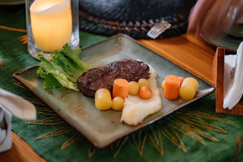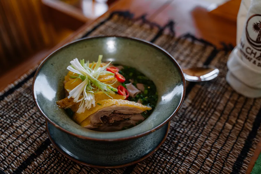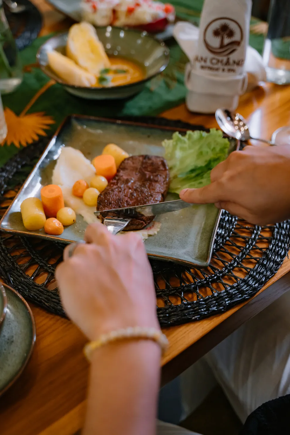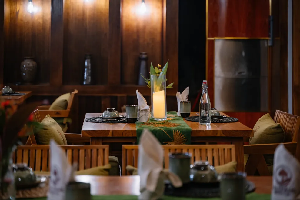 Về ẩm thực, Nhà hàng Cọ Bầu mang đến trải nghiệm thực dưỡng bền vững với nguồn nguyên liệu sạch được cung ứng trực tiếp từ địa phương. Các món đặc sản như gà bản Châng, vịt bản và lợn đen được chế biến theo phong cách truyền thống của người Tày kết hợp với cách trình bày hiện đại. Thực đơn được thiết kế tinh tế để giữ trọn dinh dưỡng tự nhiên, không sử dụng quá nhiều gia vị công nghiệp, giúp mỗi bữa ăn trở thành một phần của hành trình chăm sóc sức khỏe toàn diện.