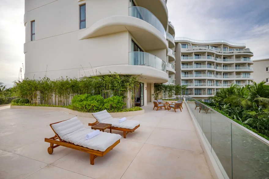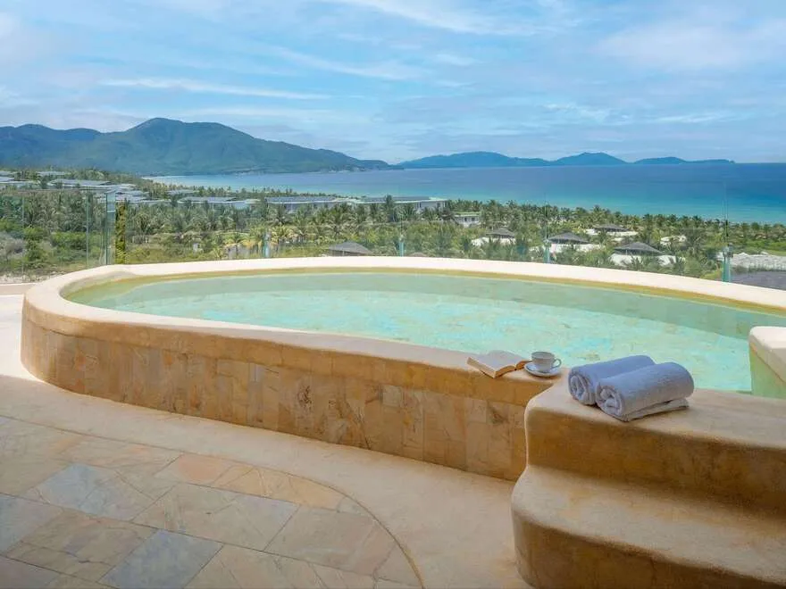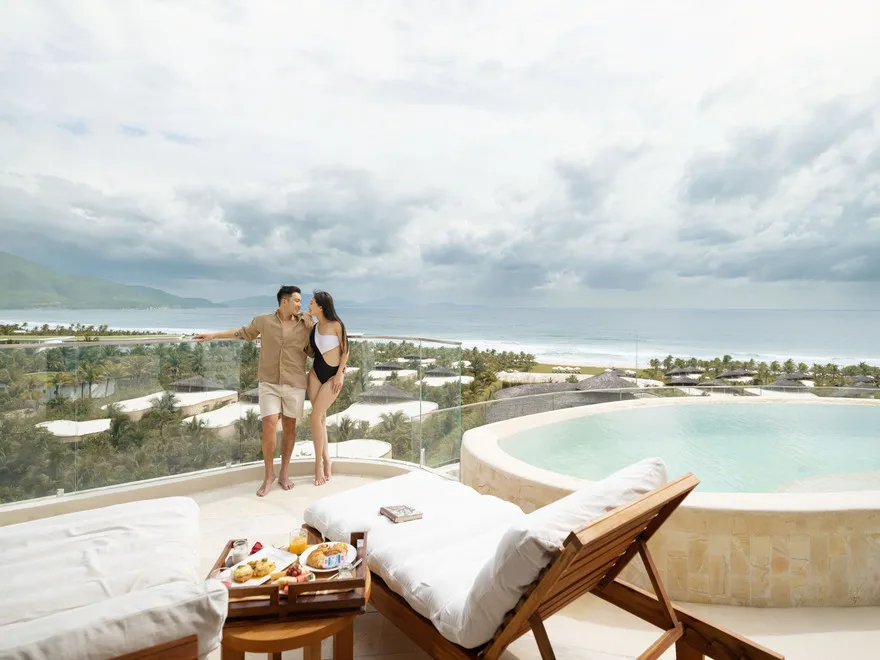 Các Sky Pool Villa được thiết kế giật cấp và có vách ngăn kính mờ để tối ưu hóa tầm nhìn ra biển nhưng vẫn đảm bảo sự riêng tư. Tuy nhiên, do nằm trên tòa nhà cao tầng, mức độ riêng tư sẽ không tuyệt đối bằng các biệt thự mặt đất có tường bao quanh như dòng Garden Pool Villa.