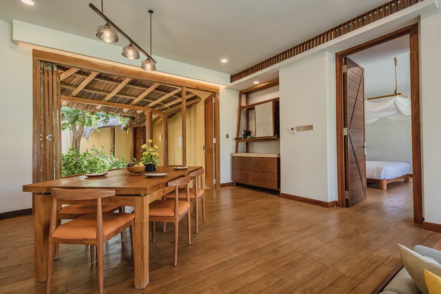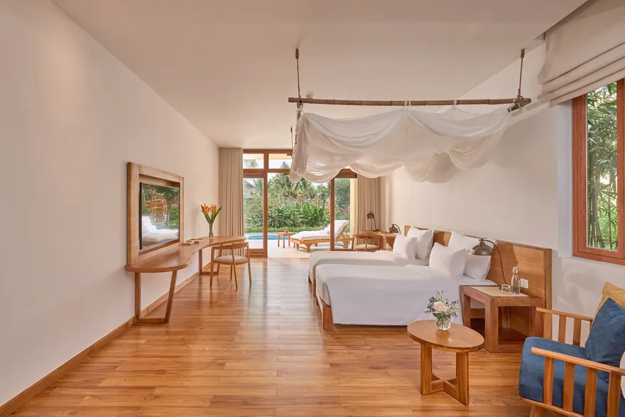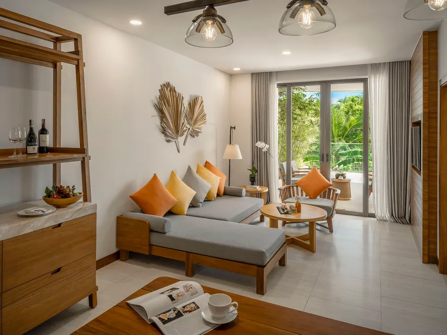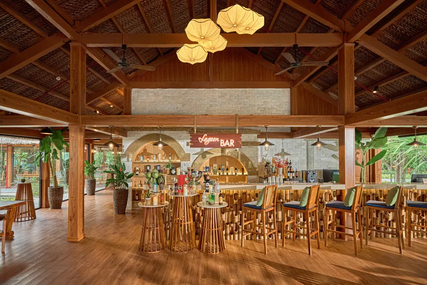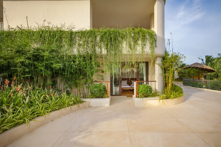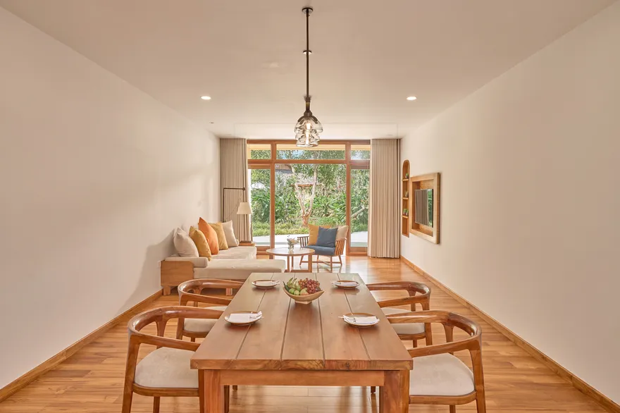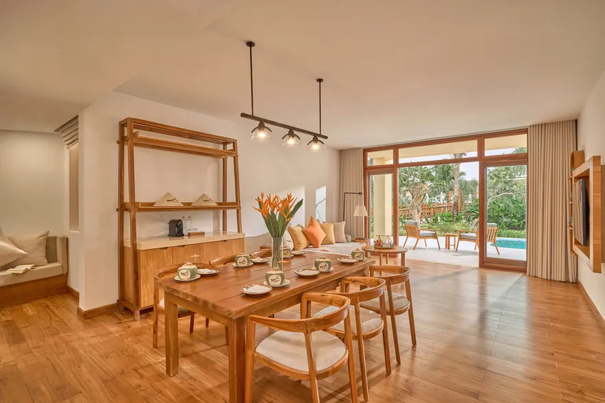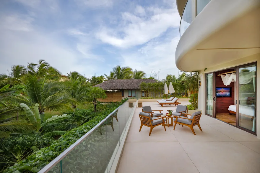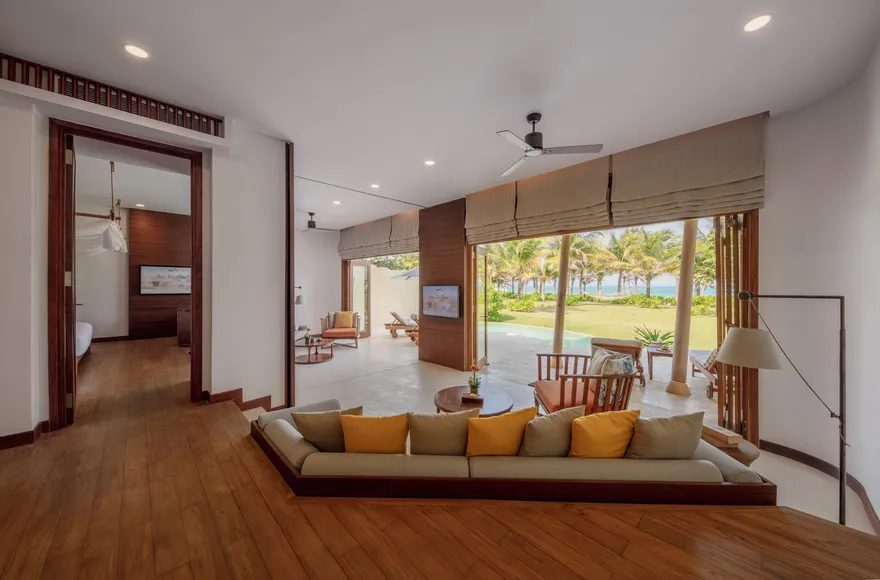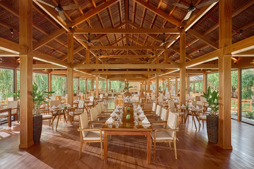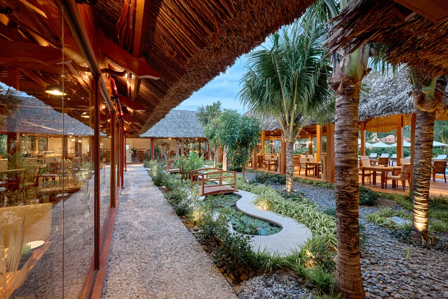 Sự sang trọng tại đây không đến từ những khối bê tông hào nhoáng mà nằm ở chiều sâu của hơi thở Indochine kết hợp cùng các vật liệu tự nhiên bản địa. Sự kết hợp tinh tế giữa gỗ ấm áp, đá thô mộc và gốm sứ tinh xảo trong từng ngóc ngách của resort tạo nên một không gian tĩnh lặng, gần gũi với đất mẹ. Lối thiết kế ưu tiên không gian mở giúp ranh giới giữa con người và thiên nhiên trở nên mờ nhạt, nơi du khách có thể chạm tay vào ánh nắng và cảm nhận gió biển len lỏi qua từng kẽ lá, mang lại trải nghiệm thư giãn tuyệt đối cho tâm hồn.