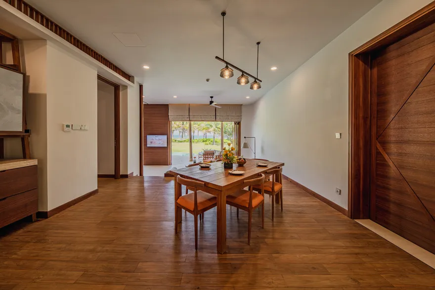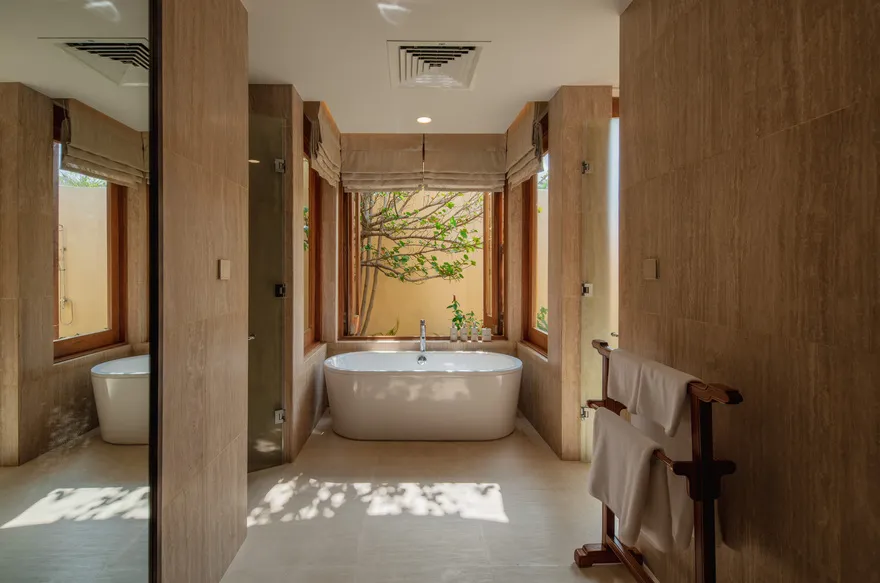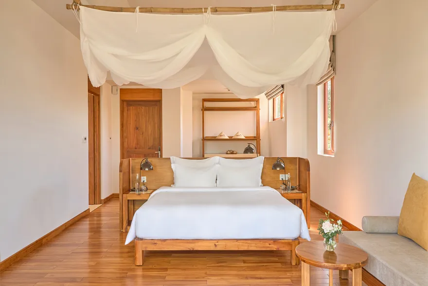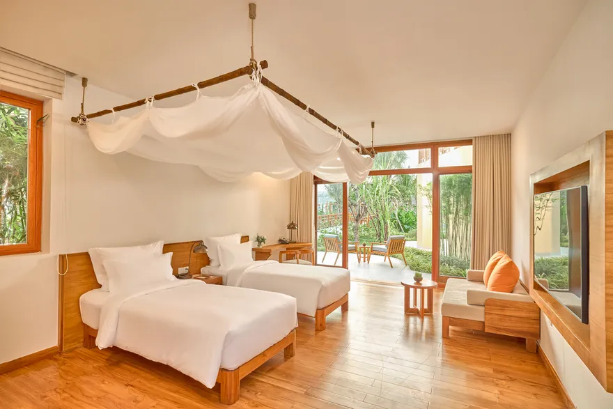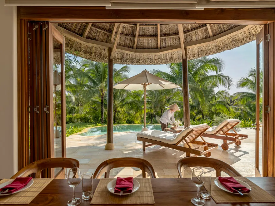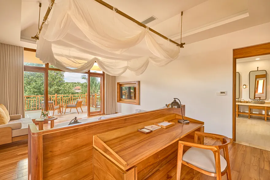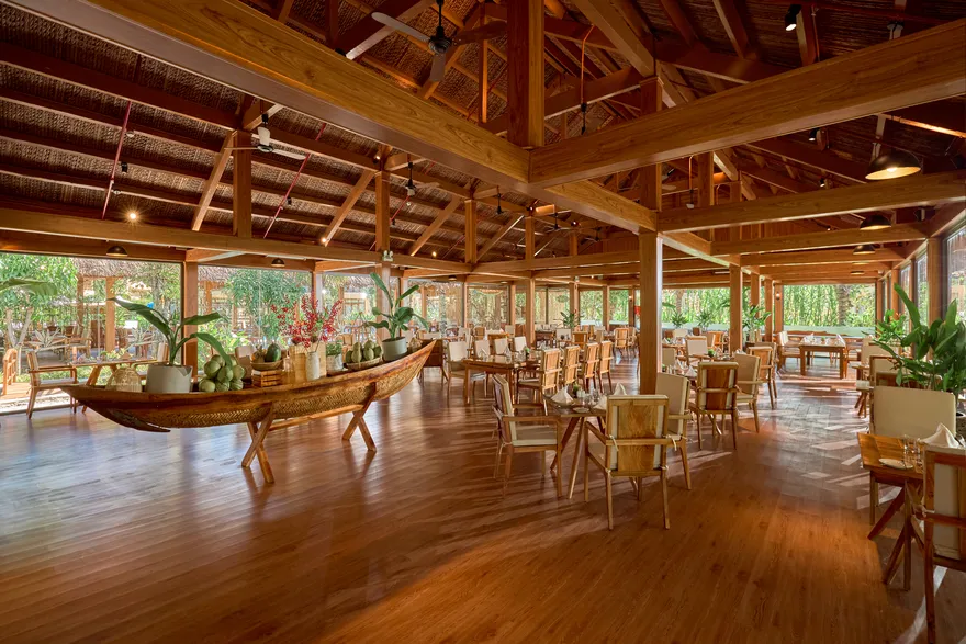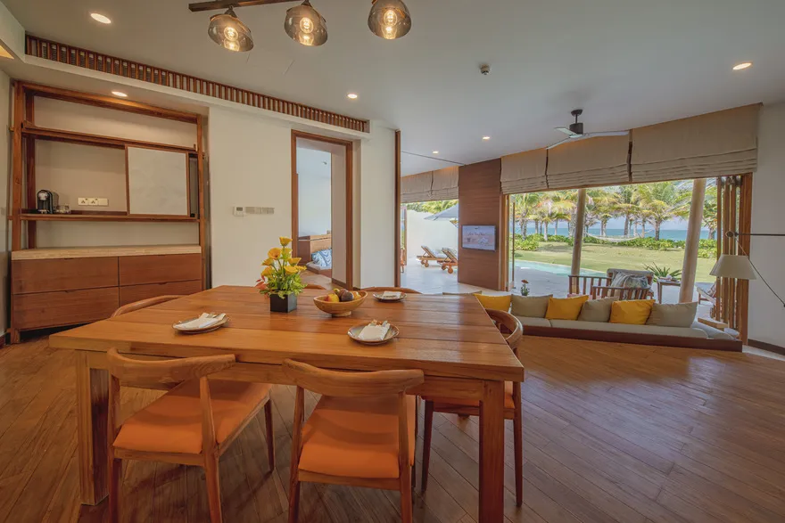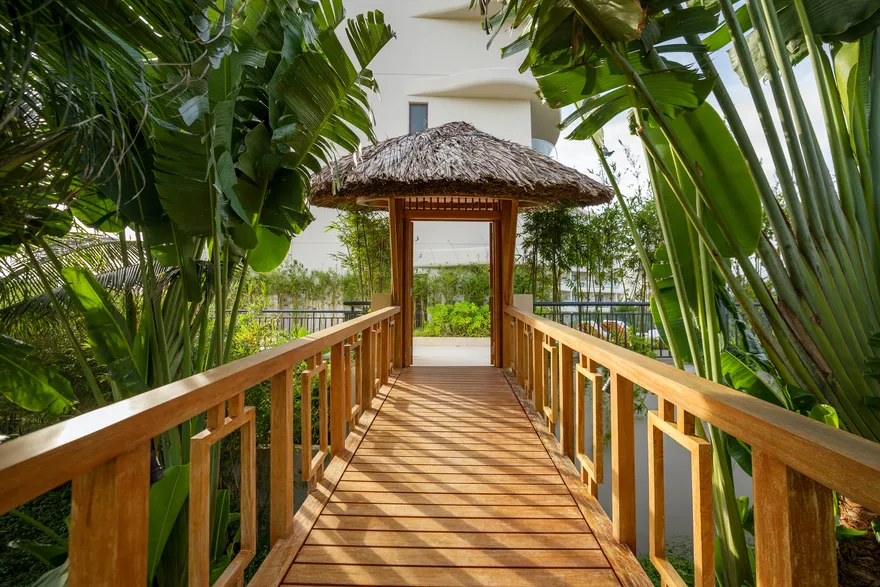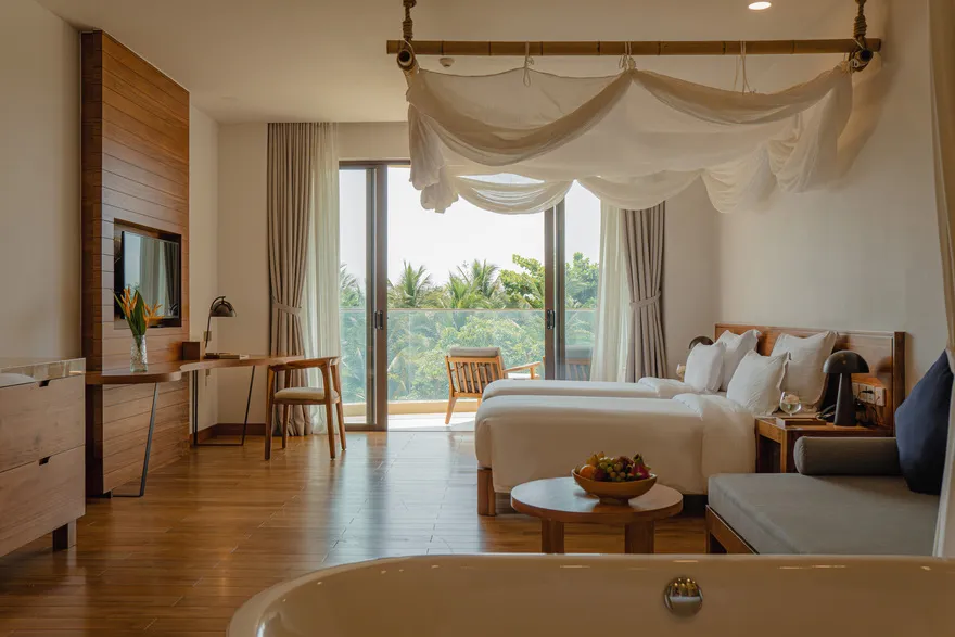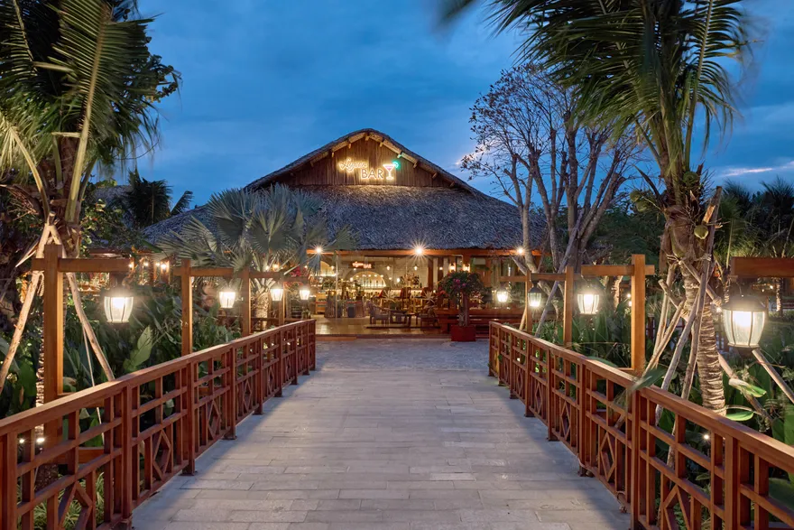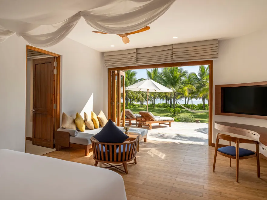 Sự sang trọng tại đây không đến từ những khối bê tông hào nhoáng mà nằm ở chiều sâu của hơi thở Indochine kết hợp cùng các vật liệu tự nhiên bản địa. Sự kết hợp tinh tế giữa gỗ ấm áp, đá thô mộc và gốm sứ tinh xảo trong từng ngóc ngách của resort tạo nên một không gian tĩnh lặng, gần gũi với đất mẹ. Lối thiết kế ưu tiên không gian mở giúp ranh giới giữa con người và thiên nhiên trở nên mờ nhạt, nơi du khách có thể chạm tay vào ánh nắng và cảm nhận gió biển len lỏi qua từng kẽ lá, mang lại trải nghiệm thư giãn tuyệt đối cho tâm hồn.