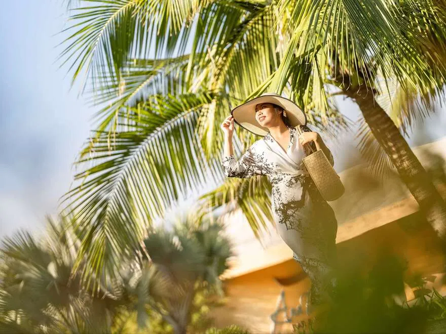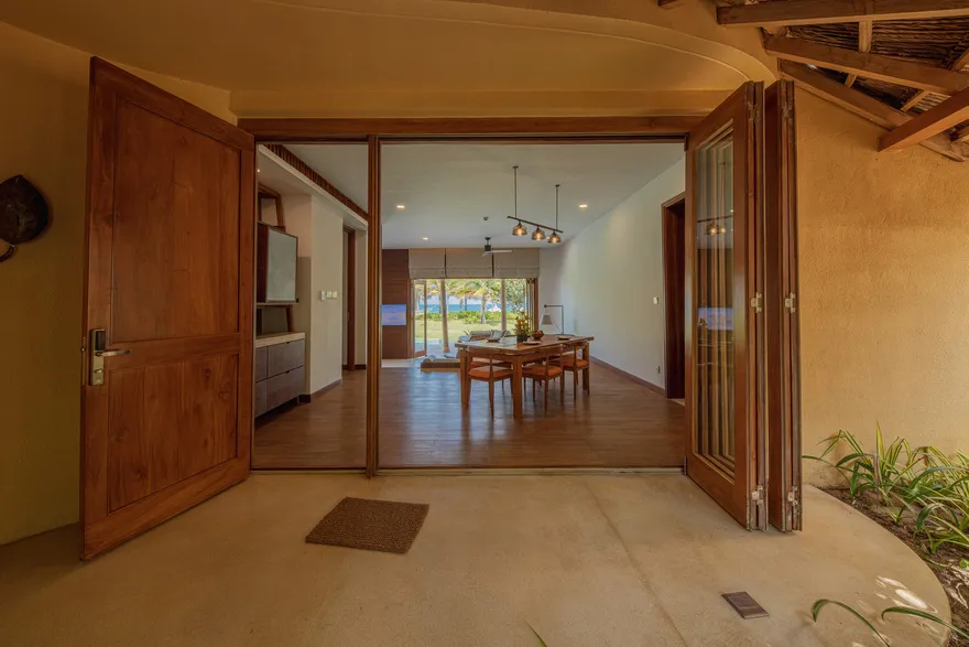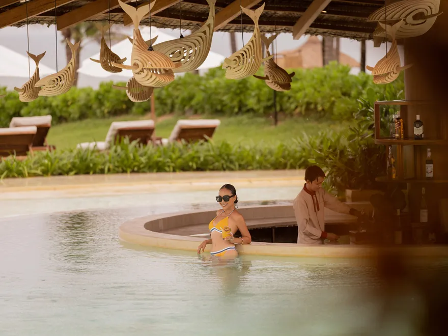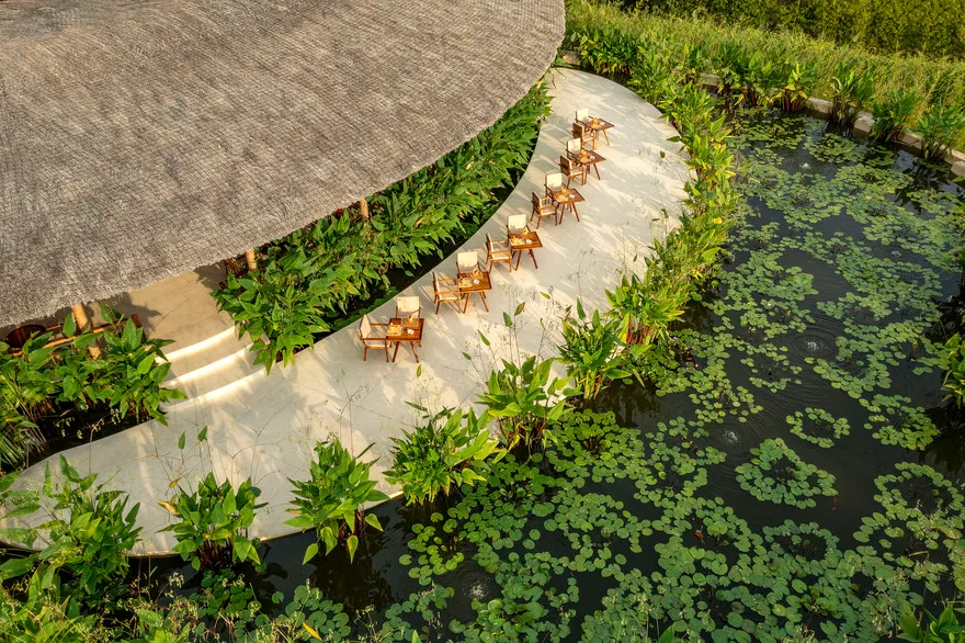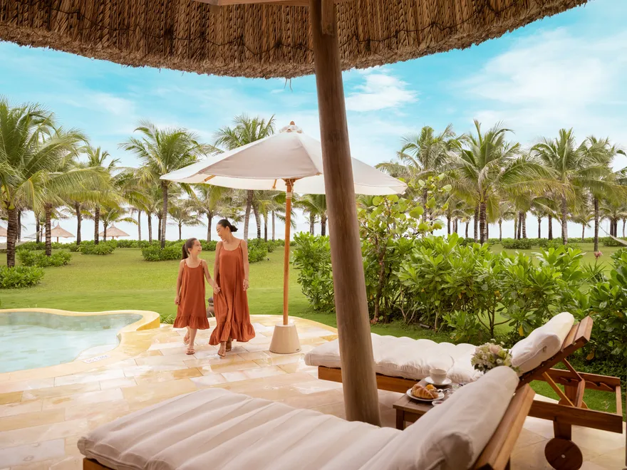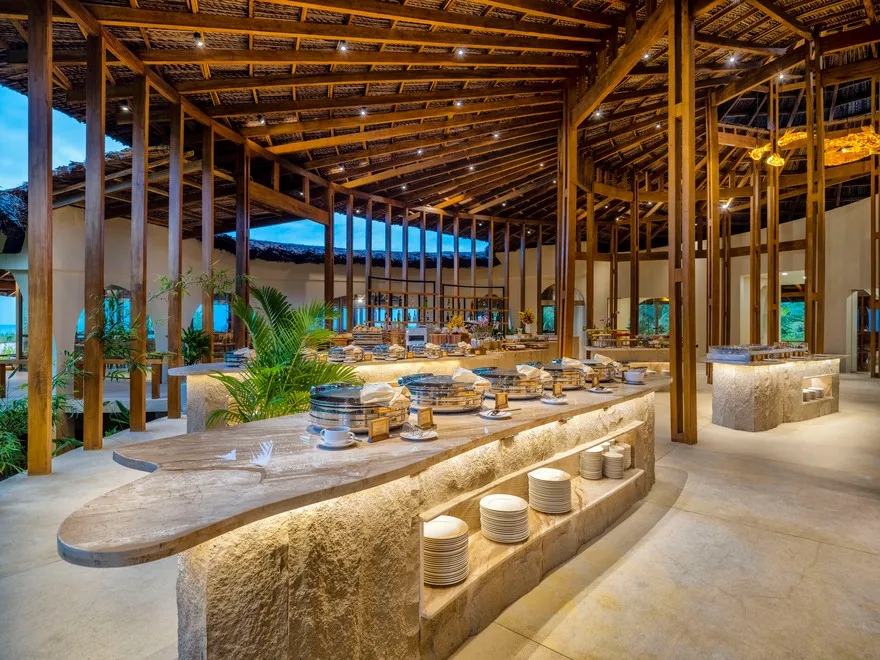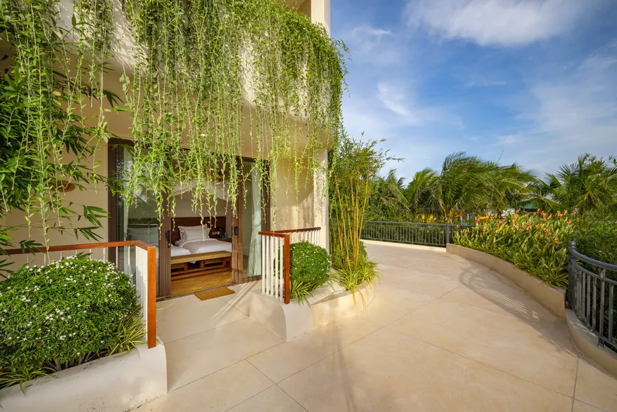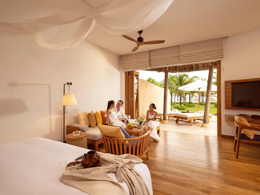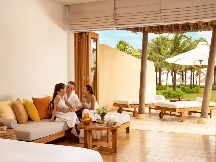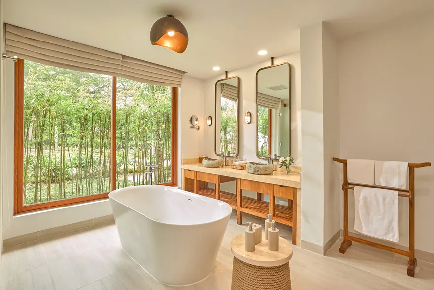 Sự sang trọng tại đây không đến từ những khối bê tông hào nhoáng mà nằm ở chiều sâu của hơi thở Indochine kết hợp cùng các vật liệu tự nhiên bản địa. Sự kết hợp tinh tế giữa gỗ ấm áp, đá thô mộc và gốm sứ tinh xảo trong từng ngóc ngách của resort tạo nên một không gian tĩnh lặng, gần gũi với đất mẹ. Lối thiết kế ưu tiên không gian mở giúp ranh giới giữa con người và thiên nhiên trở nên mờ nhạt, nơi du khách có thể chạm tay vào ánh nắng và cảm nhận gió biển len lỏi qua từng kẽ lá, mang lại trải nghiệm thư giãn tuyệt đối cho tâm hồn.