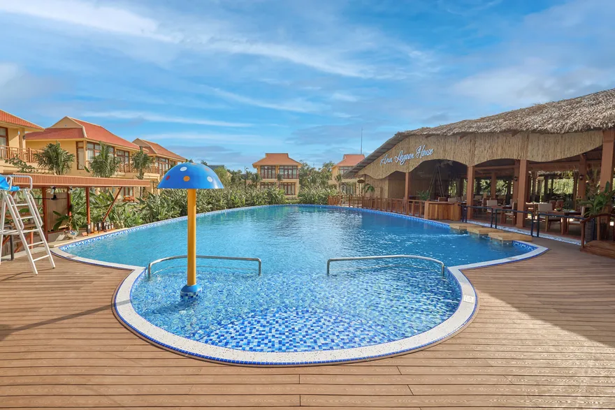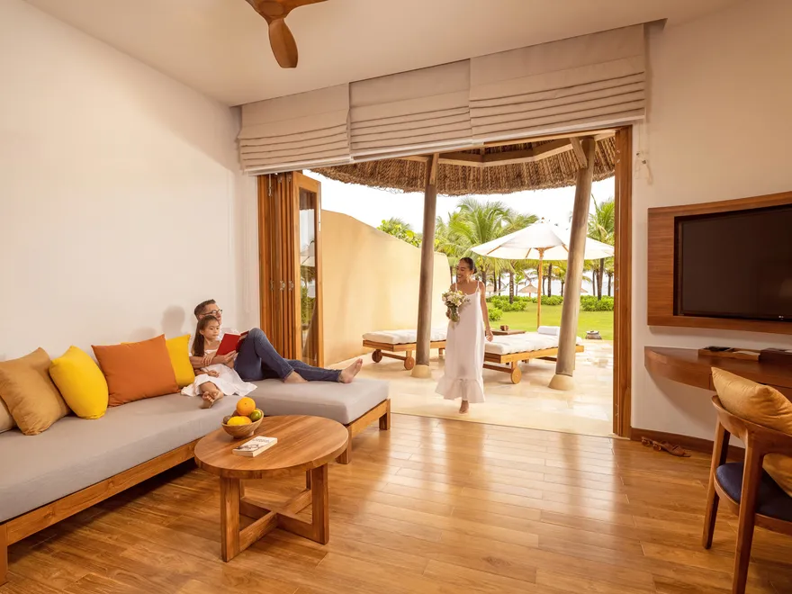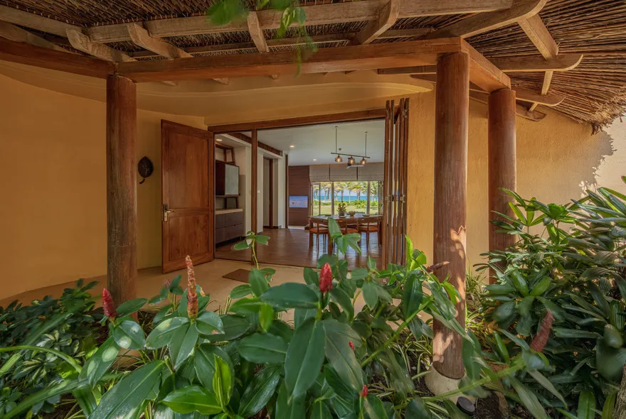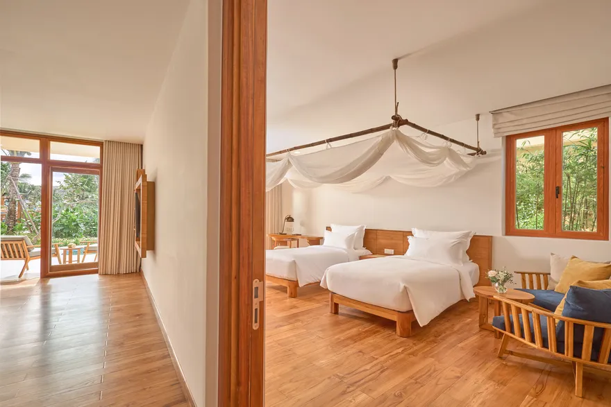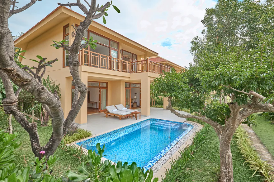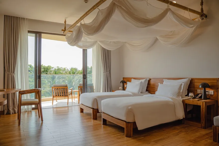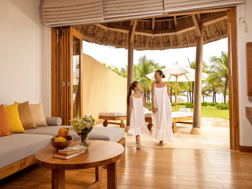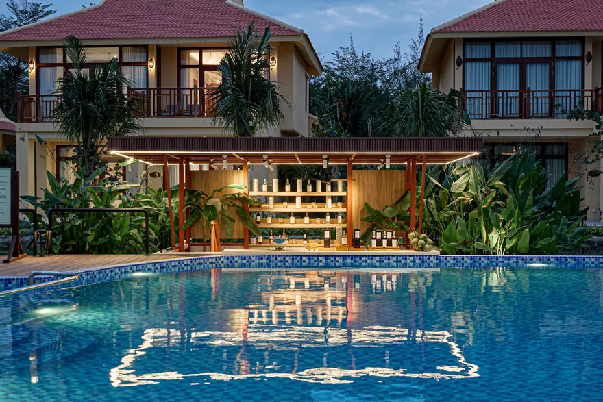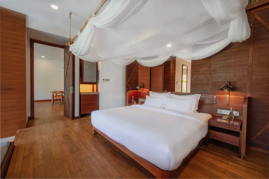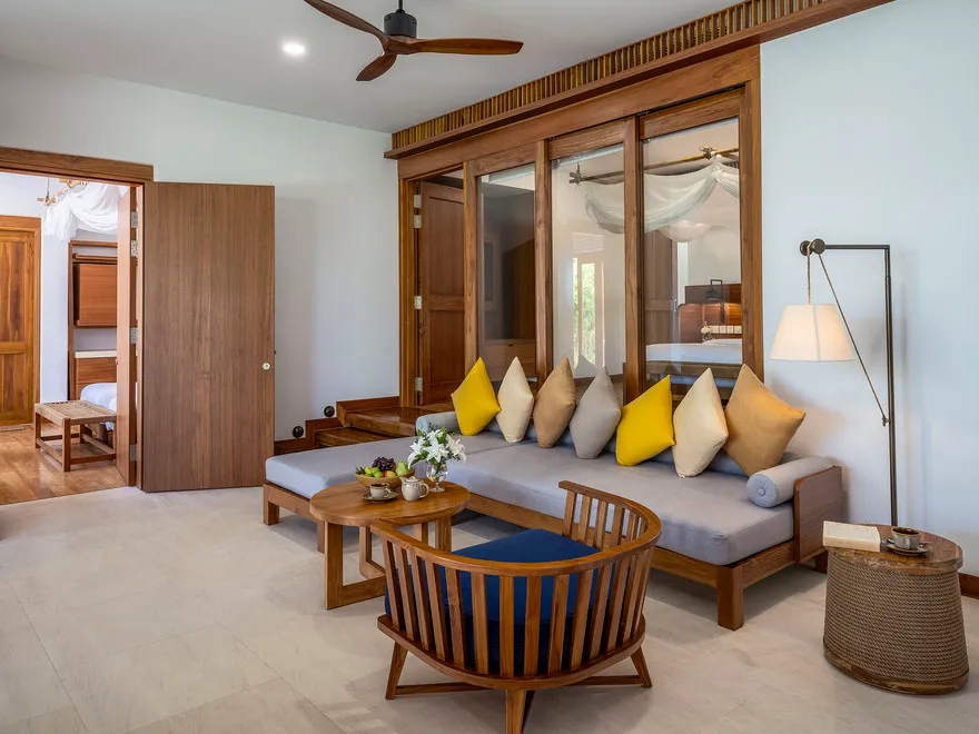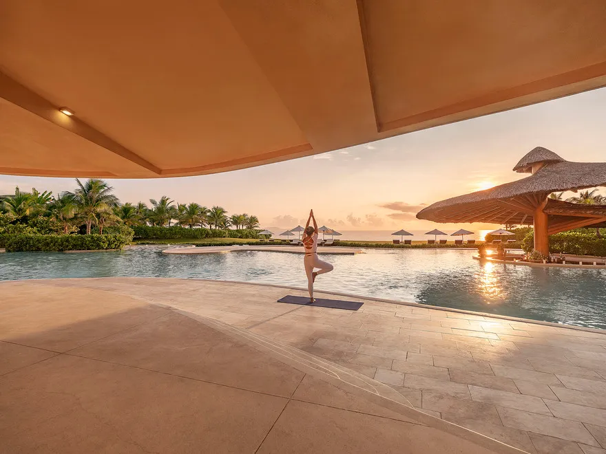 Sự sang trọng tại đây không đến từ những khối bê tông hào nhoáng mà nằm ở chiều sâu của hơi thở Indochine kết hợp cùng các vật liệu tự nhiên bản địa. Sự kết hợp tinh tế giữa gỗ ấm áp, đá thô mộc và gốm sứ tinh xảo trong từng ngóc ngách của resort tạo nên một không gian tĩnh lặng, gần gũi với đất mẹ. Lối thiết kế ưu tiên không gian mở giúp ranh giới giữa con người và thiên nhiên trở nên mờ nhạt, nơi du khách có thể chạm tay vào ánh nắng và cảm nhận gió biển len lỏi qua từng kẽ lá, mang lại trải nghiệm thư giãn tuyệt đối cho tâm hồn.