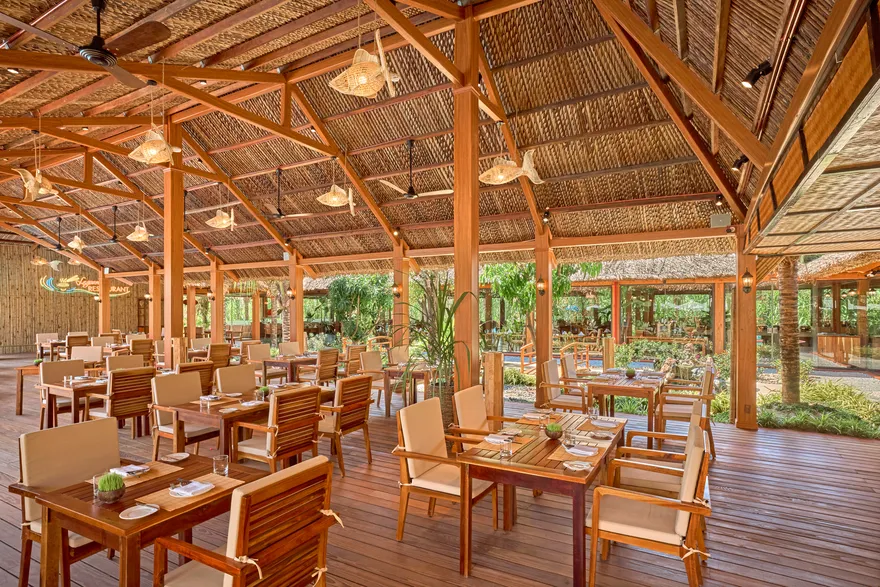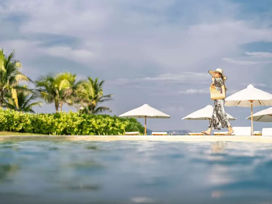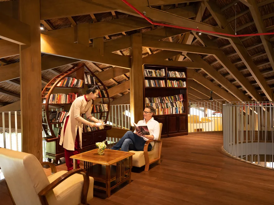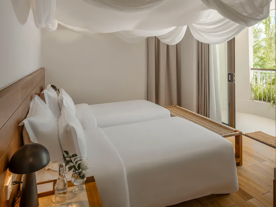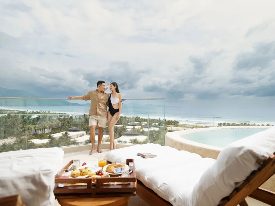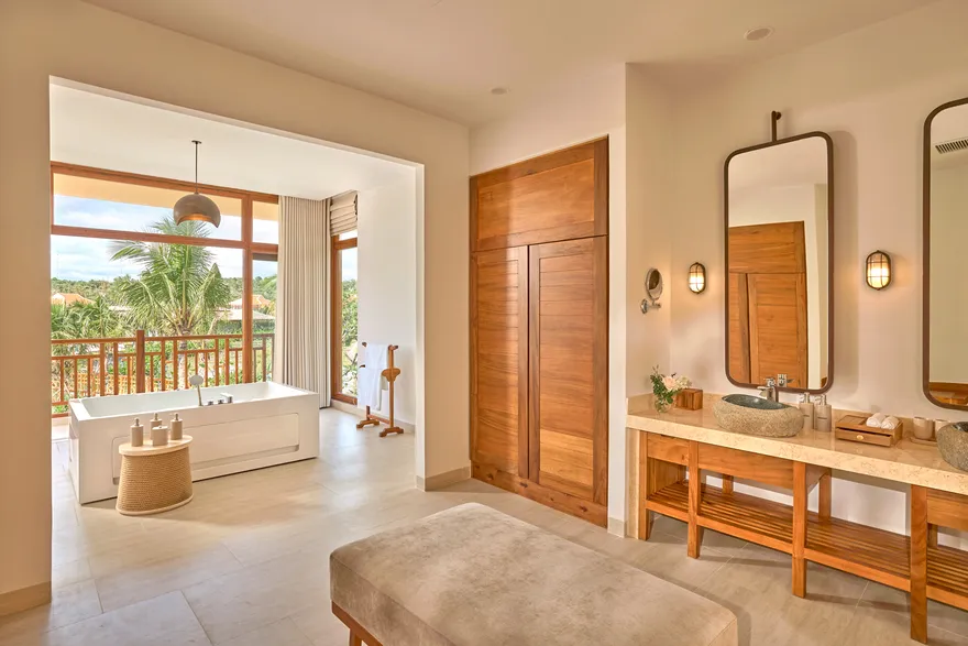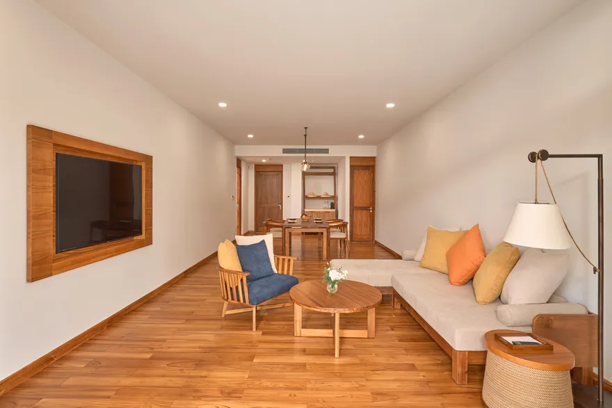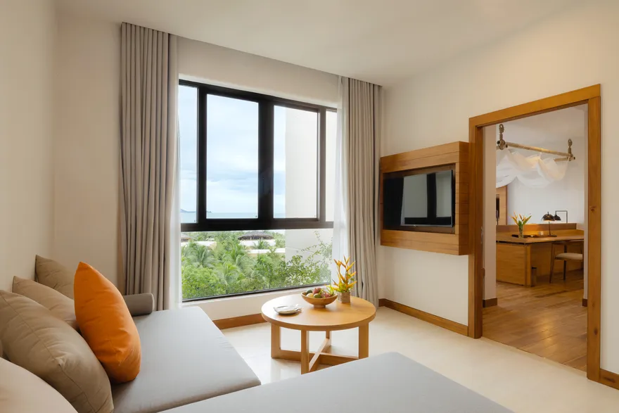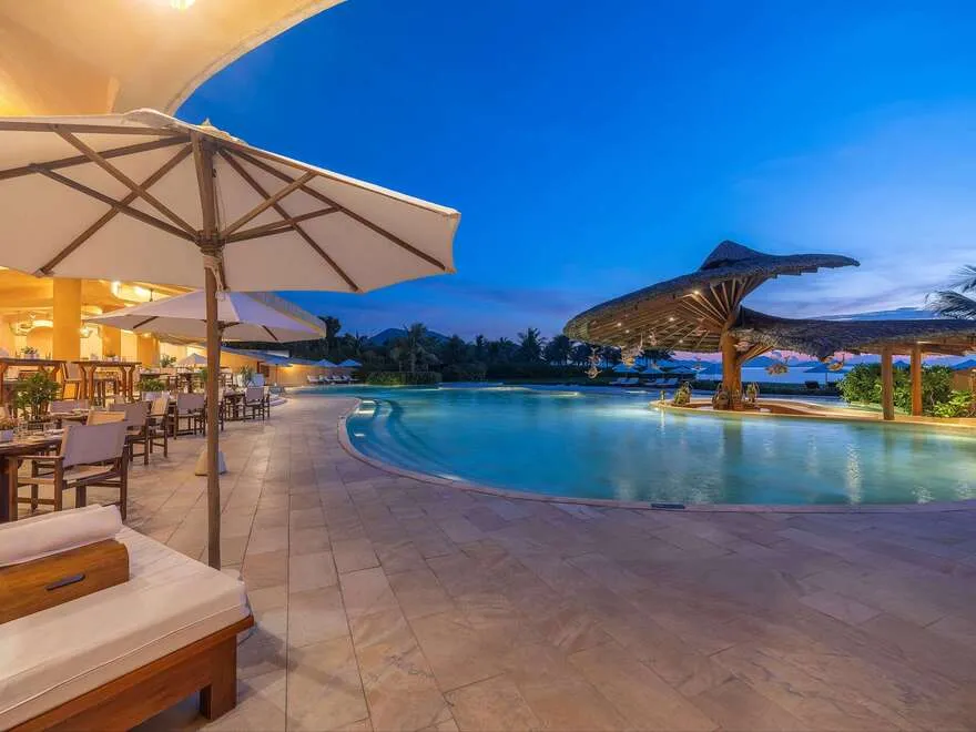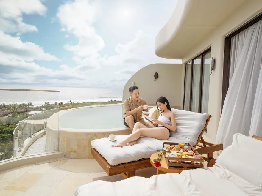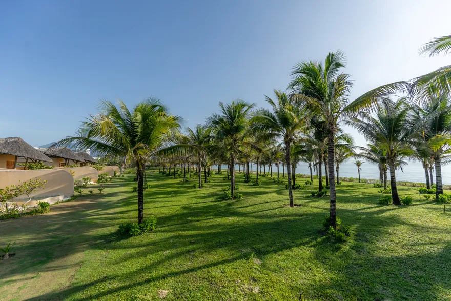 Sự sang trọng tại đây không đến từ những khối bê tông hào nhoáng mà nằm ở chiều sâu của hơi thở Indochine kết hợp cùng các vật liệu tự nhiên bản địa. Sự kết hợp tinh tế giữa gỗ ấm áp, đá thô mộc và gốm sứ tinh xảo trong từng ngóc ngách của resort tạo nên một không gian tĩnh lặng, gần gũi với đất mẹ. Lối thiết kế ưu tiên không gian mở giúp ranh giới giữa con người và thiên nhiên trở nên mờ nhạt, nơi du khách có thể chạm tay vào ánh nắng và cảm nhận gió biển len lỏi qua từng kẽ lá, mang lại trải nghiệm thư giãn tuyệt đối cho tâm hồn.