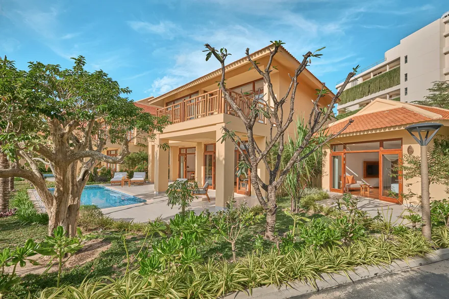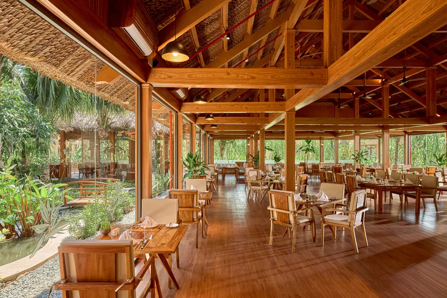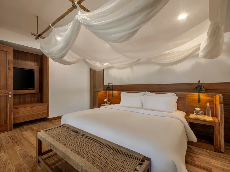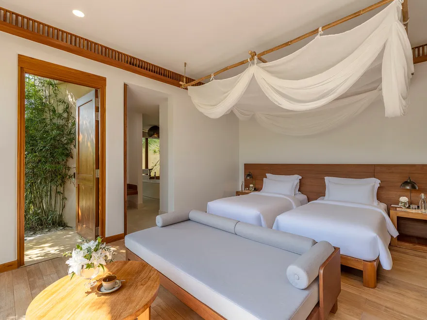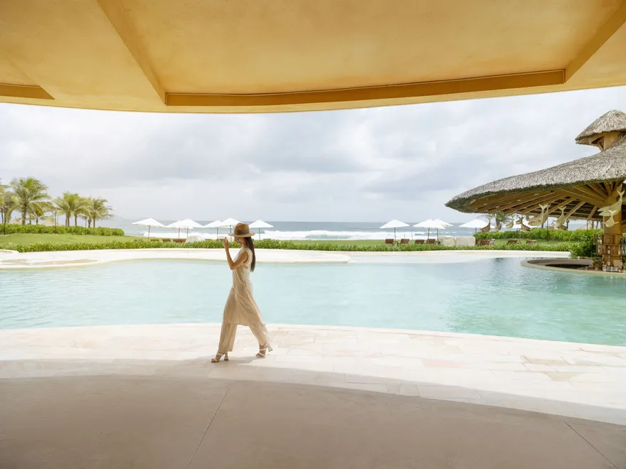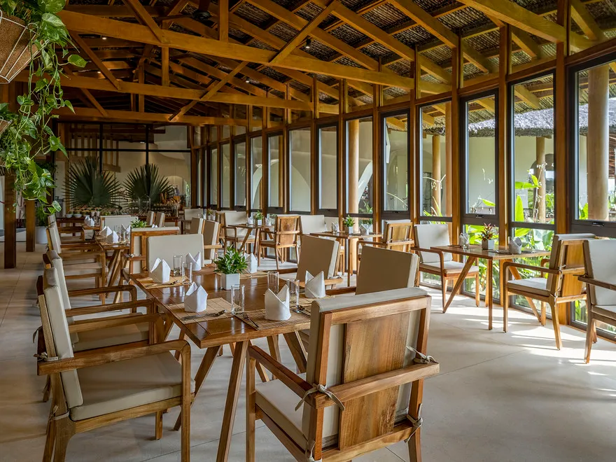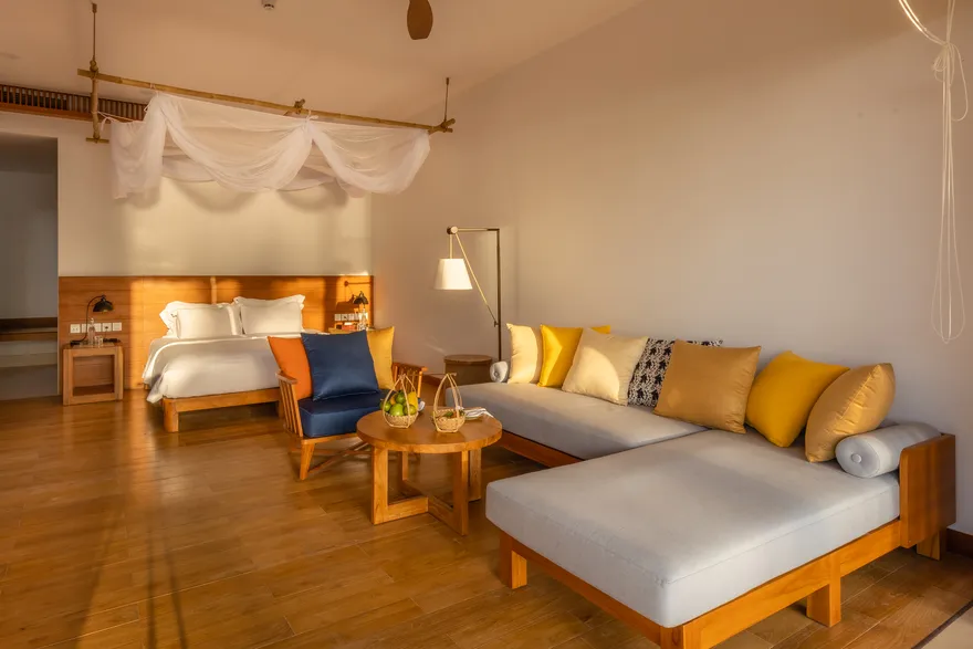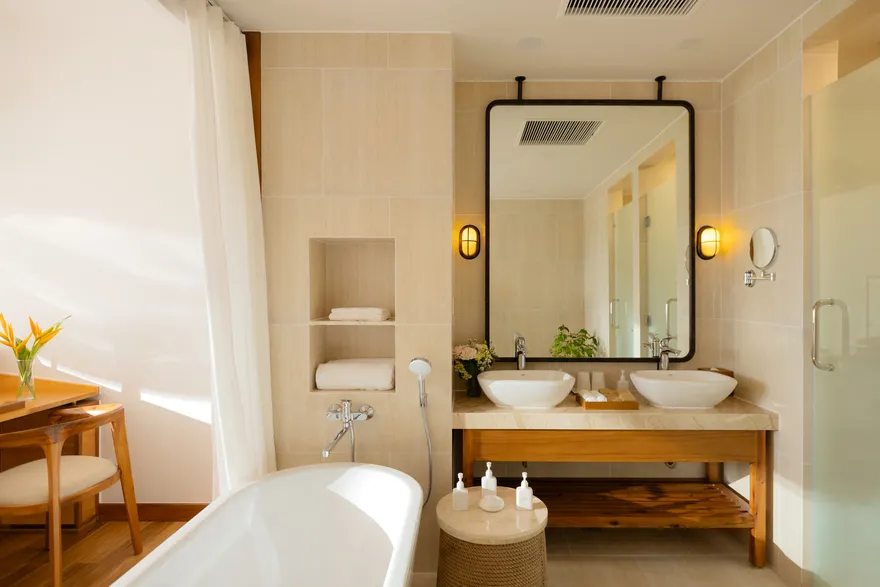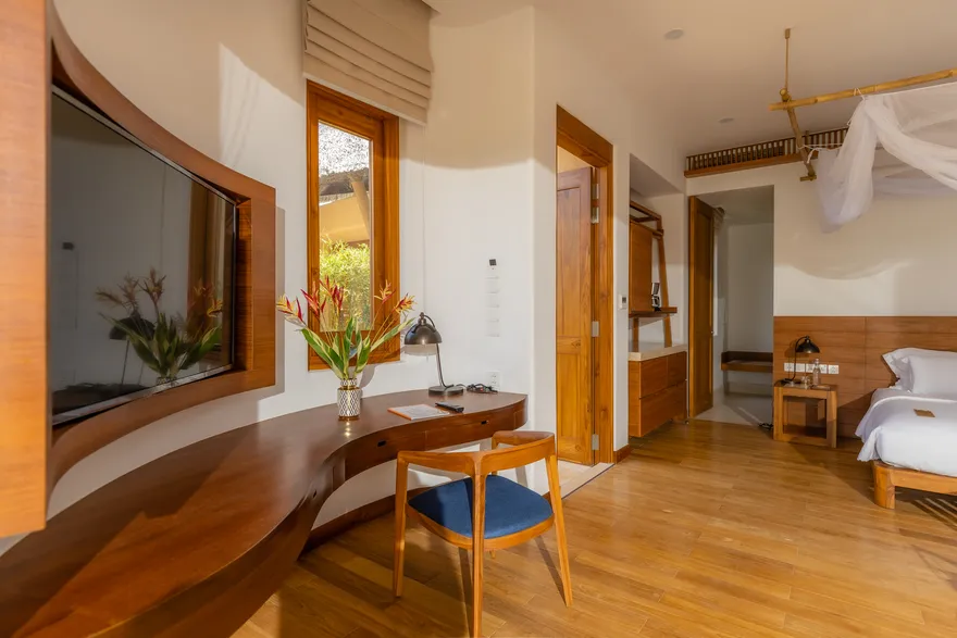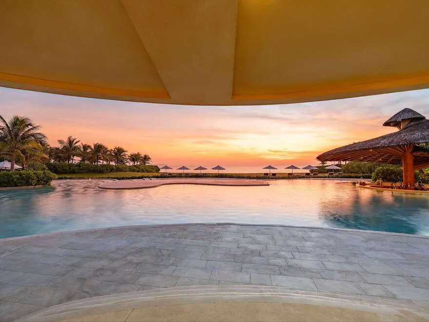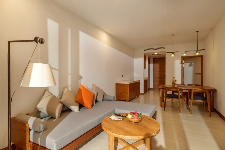 Sự sang trọng tại đây không đến từ những khối bê tông hào nhoáng mà nằm ở chiều sâu của hơi thở Indochine kết hợp cùng các vật liệu tự nhiên bản địa. Sự kết hợp tinh tế giữa gỗ ấm áp, đá thô mộc và gốm sứ tinh xảo trong từng ngóc ngách của resort tạo nên một không gian tĩnh lặng, gần gũi với đất mẹ. Lối thiết kế ưu tiên không gian mở giúp ranh giới giữa con người và thiên nhiên trở nên mờ nhạt, nơi du khách có thể chạm tay vào ánh nắng và cảm nhận gió biển len lỏi qua từng kẽ lá, mang lại trải nghiệm thư giãn tuyệt đối cho tâm hồn.